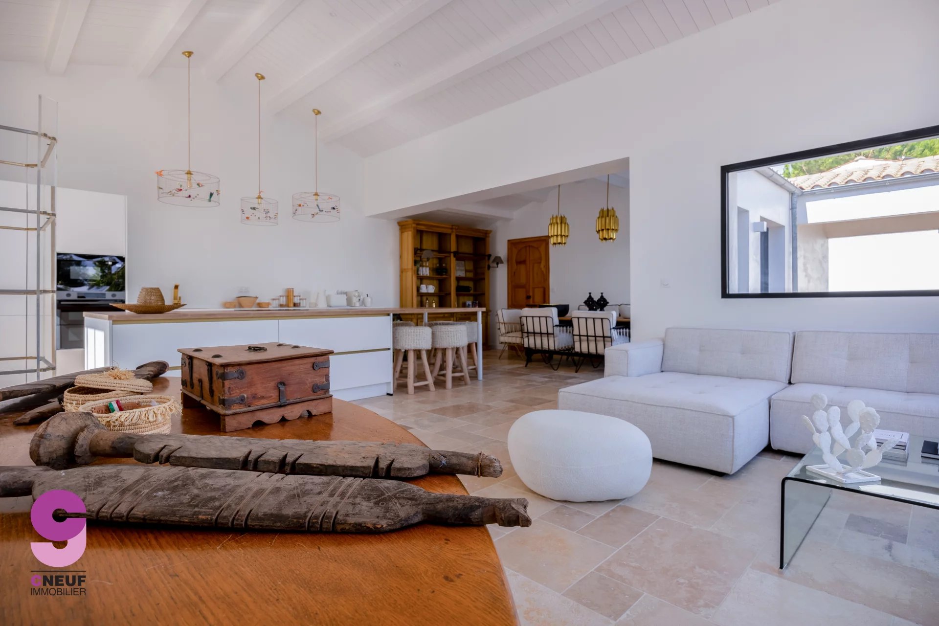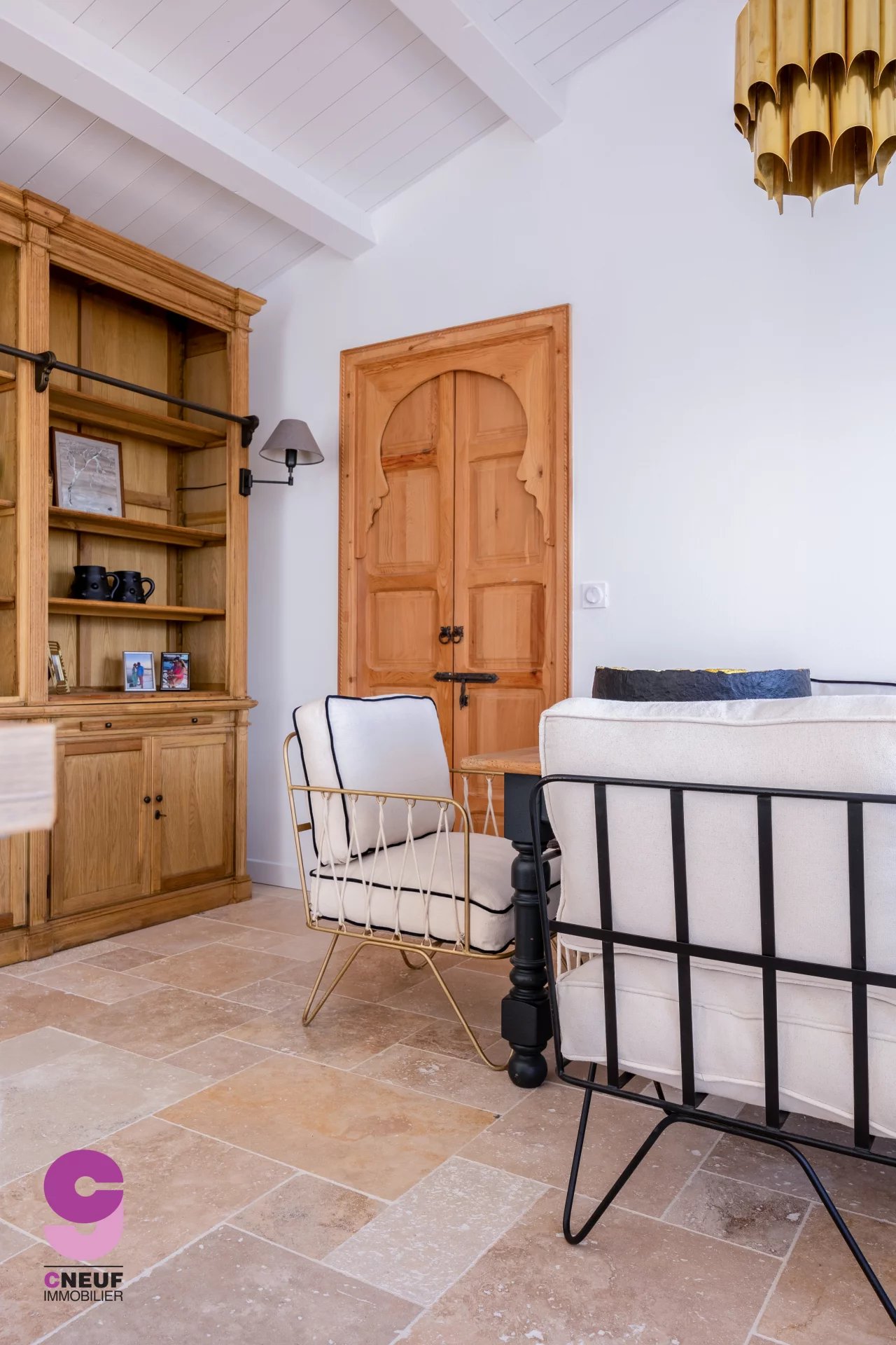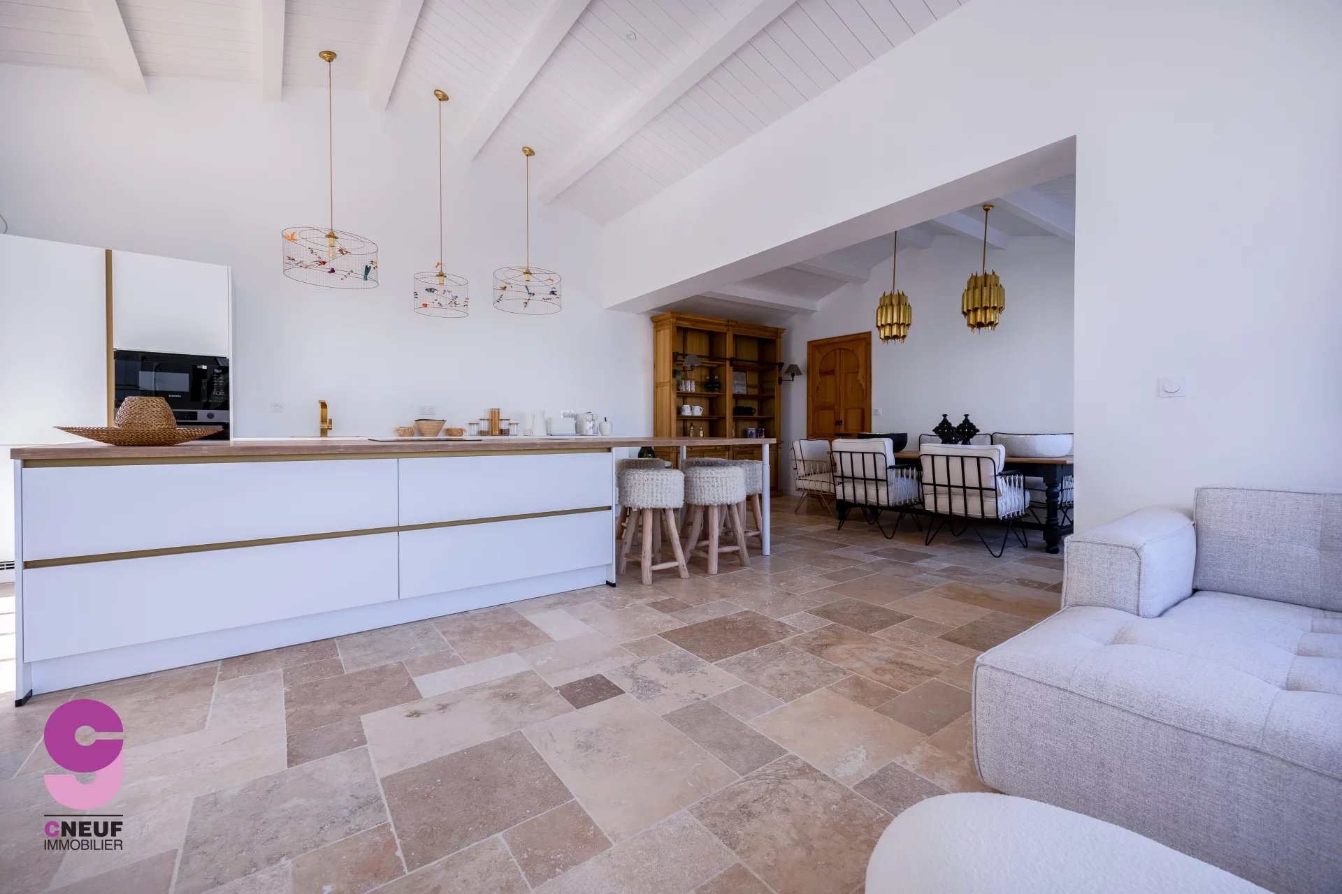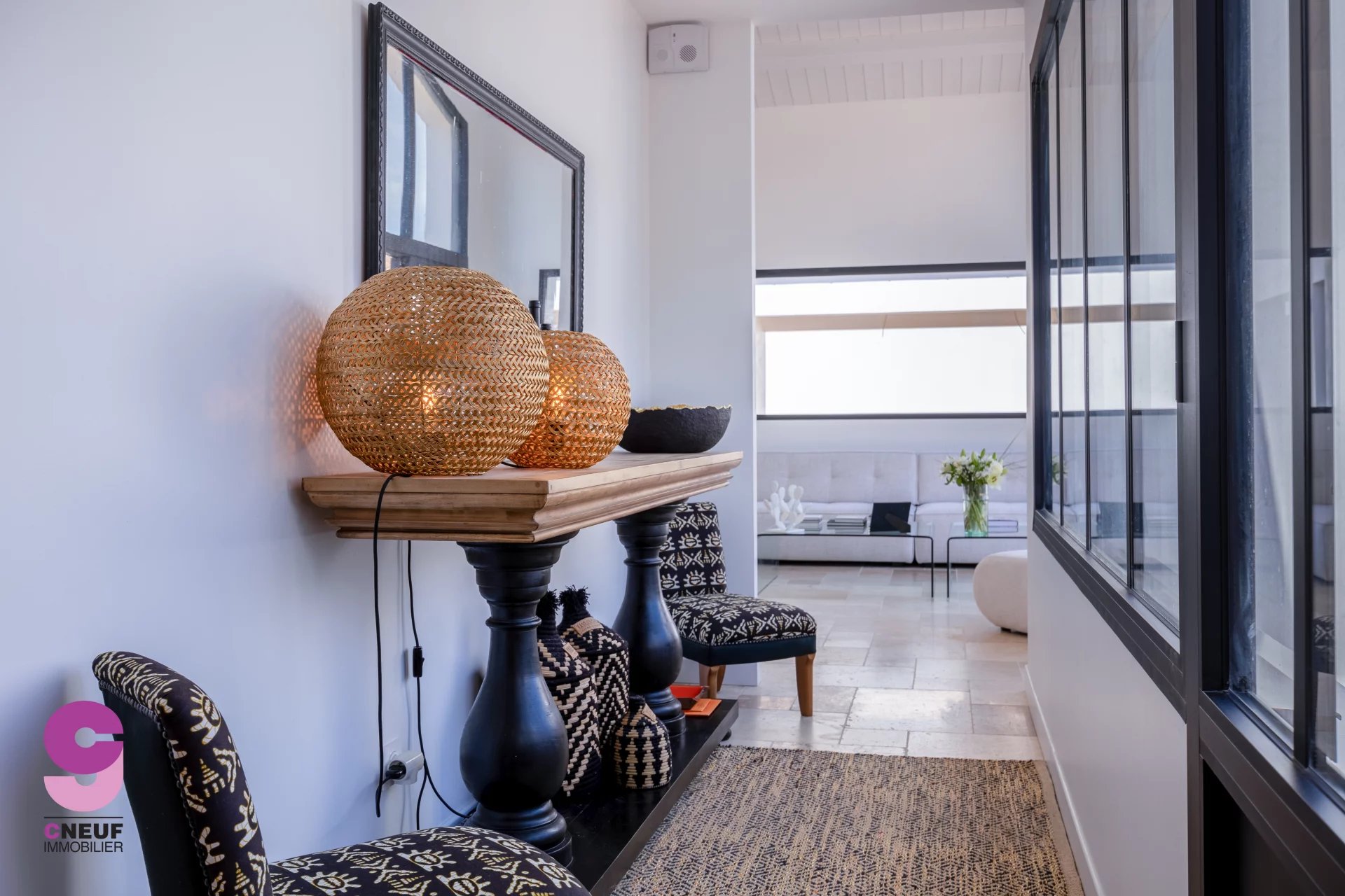 Cet espace de vie est très éclairé naturellement et bénéficie d'une grande hauteur sous plafond (plafond cathédrale) et d'une belle lumière grâce aux immenses baies vitrées.
