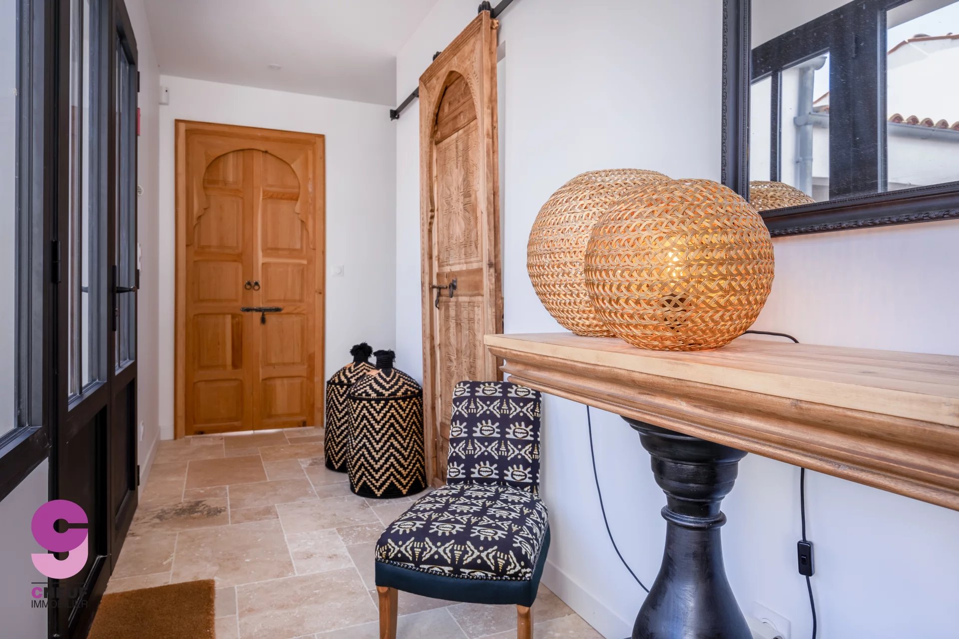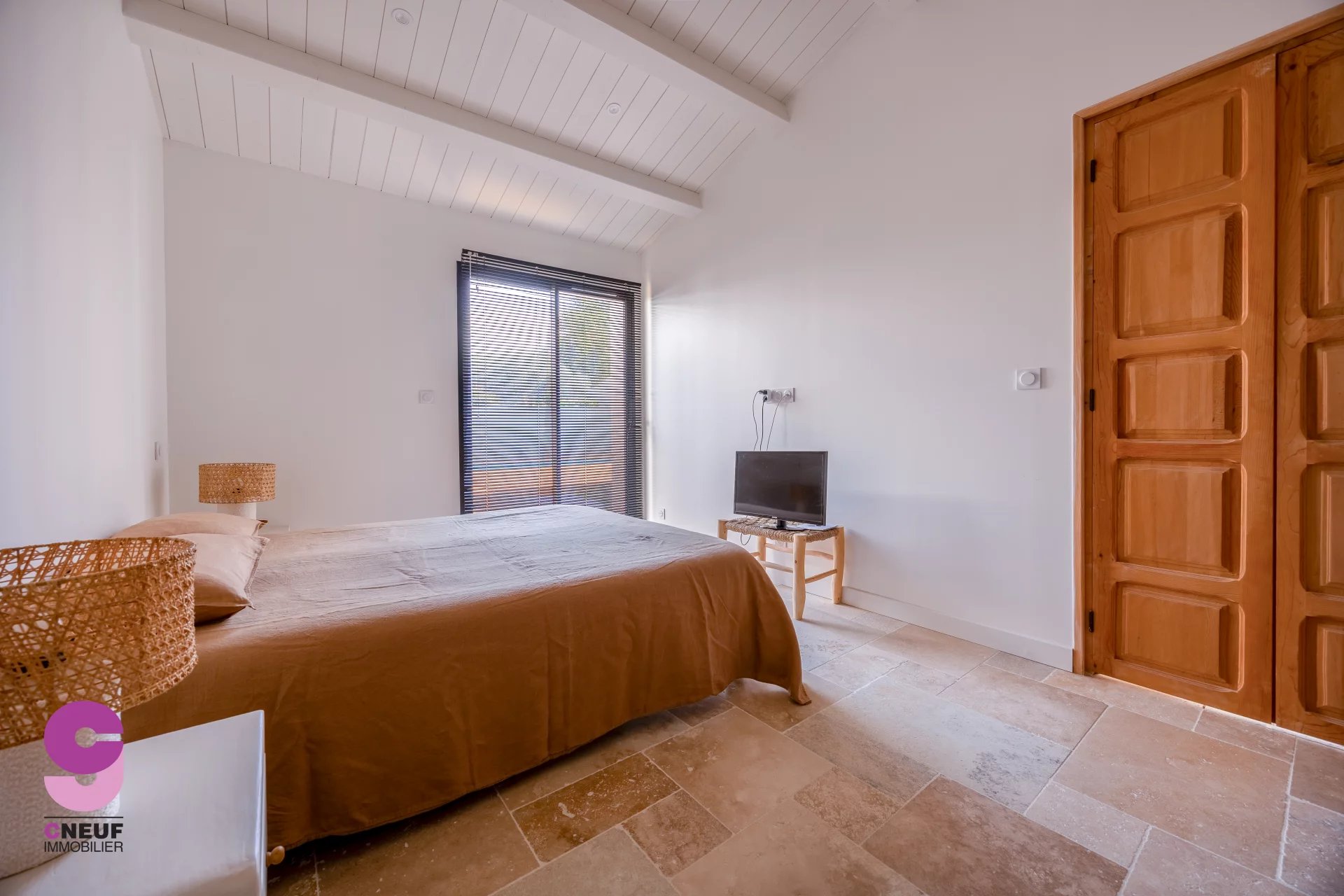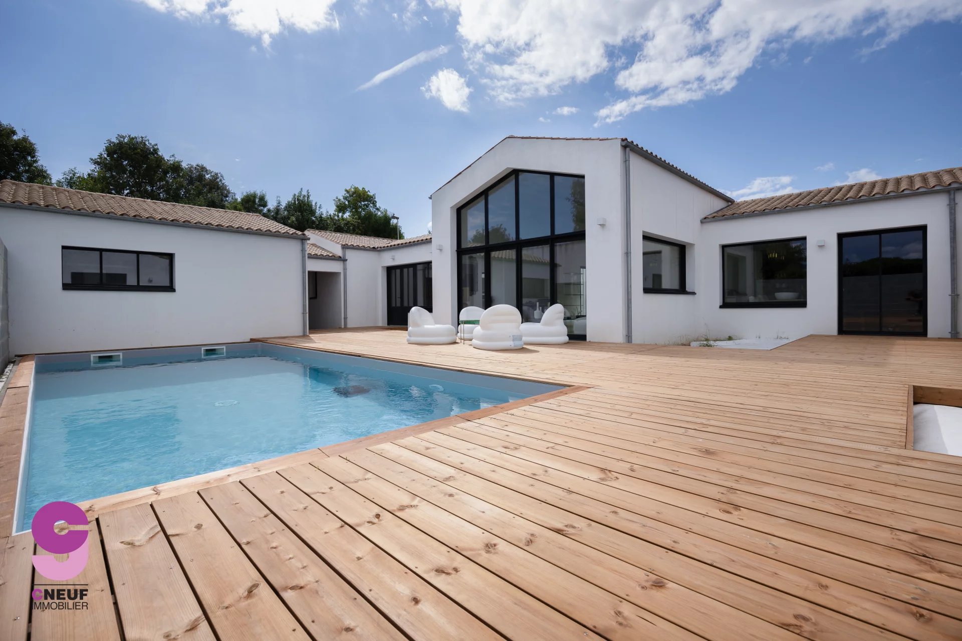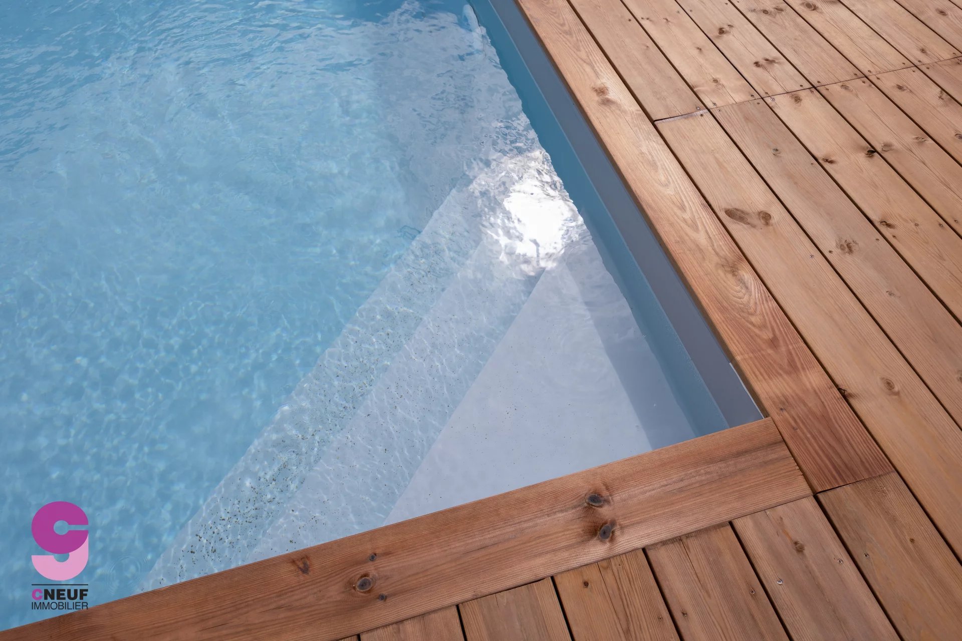 une entrée avec placard, une très belle pièce de vie avec une cuisine ouverte de 57m² ouvrant sur la piscine et une jolie terrasse en bois.