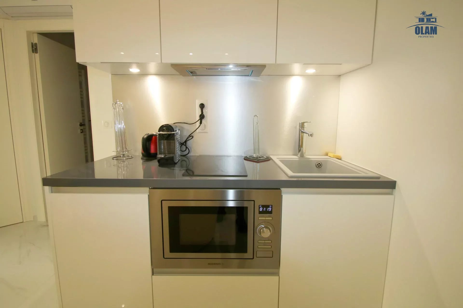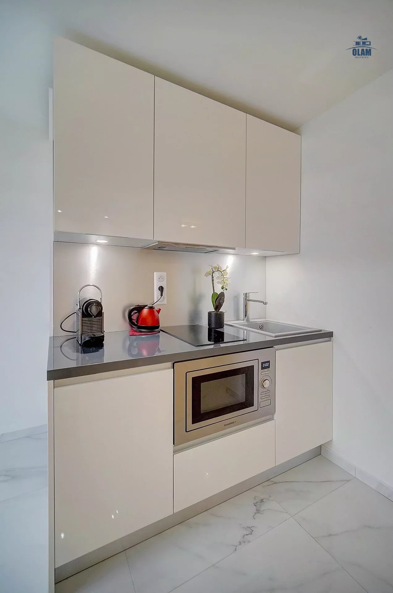 - Une cuisine équipée (four, machine à café, bouilloire...) ouverte sur le séjour disposant d'un canapé, d'un écran plat