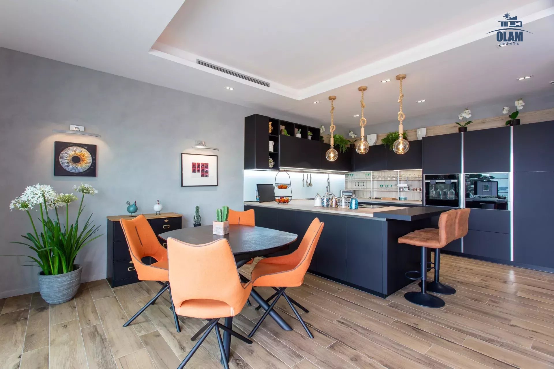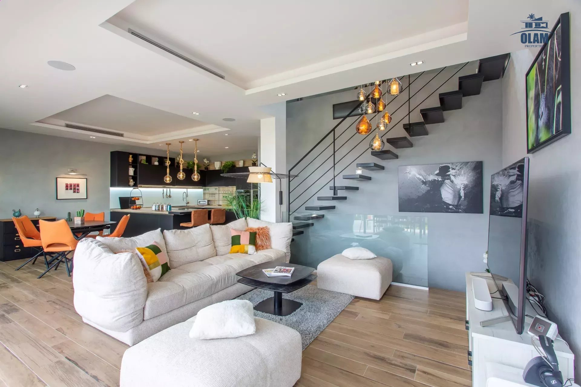 - Au R+1 (l'étage principal) : lumineuse pièce de vie avec salon, salle à manger, cuisine ouverte entièrement équipée avec de l'électroménager high tech. Wc invités.