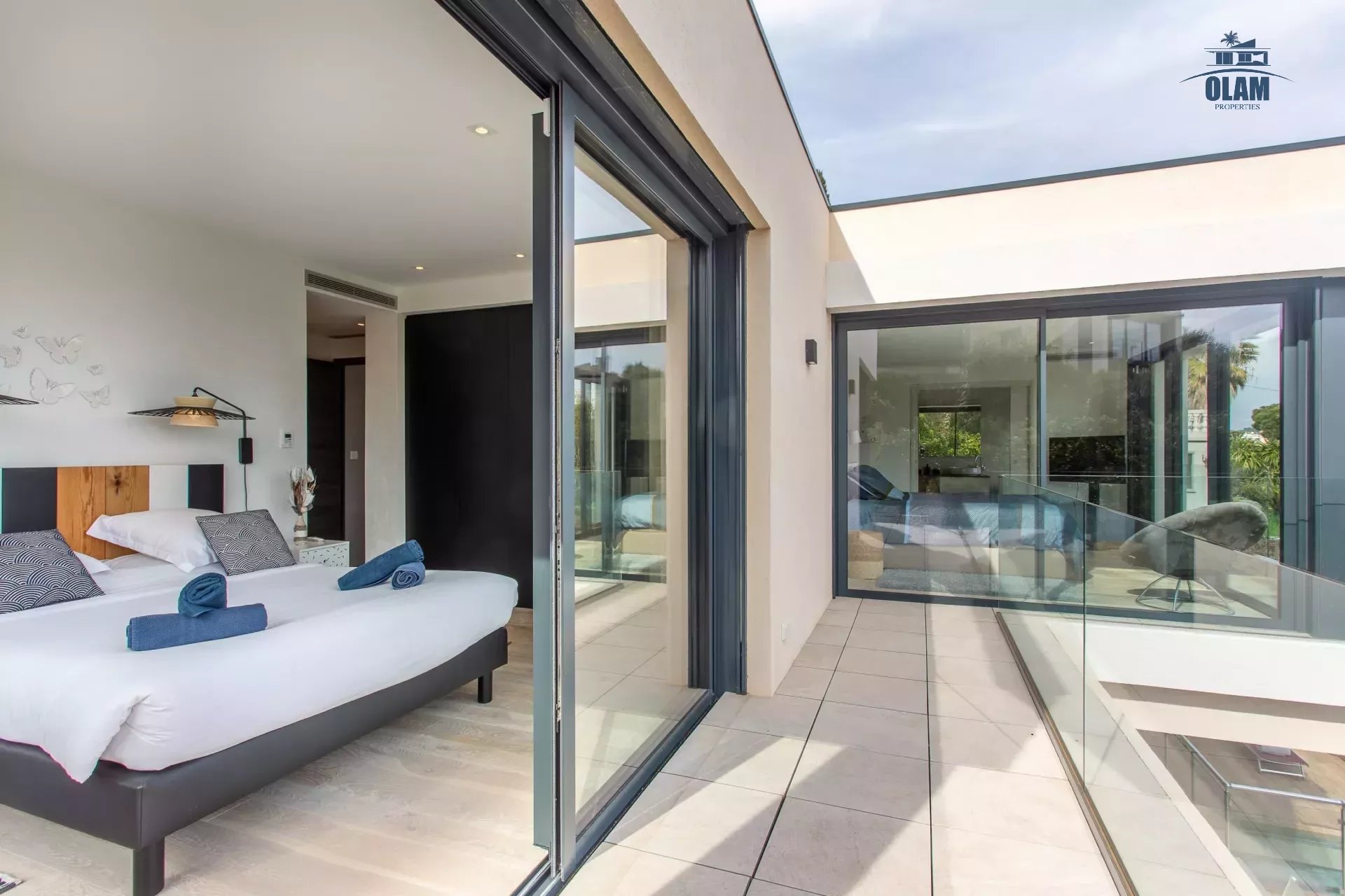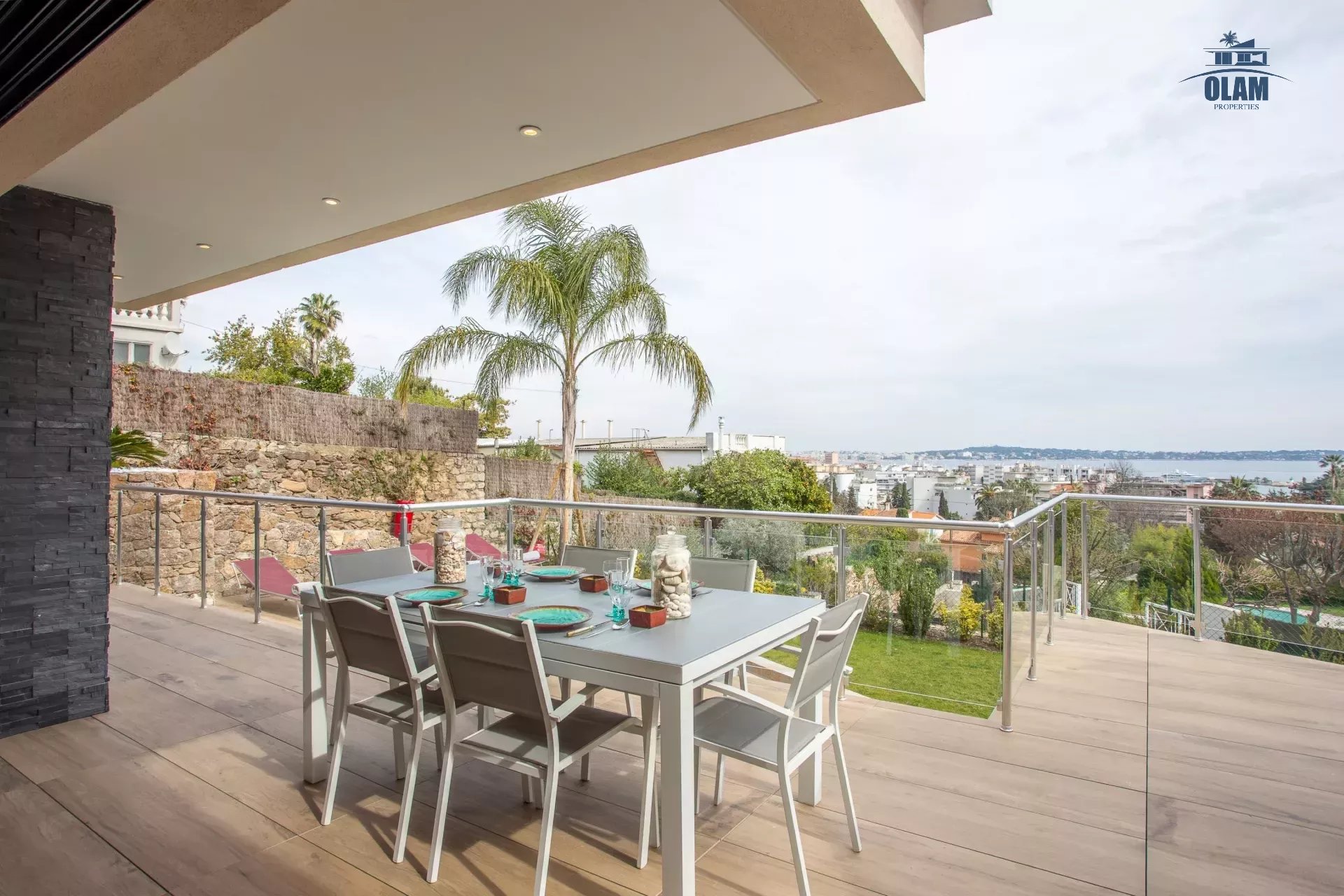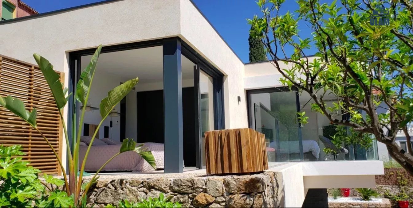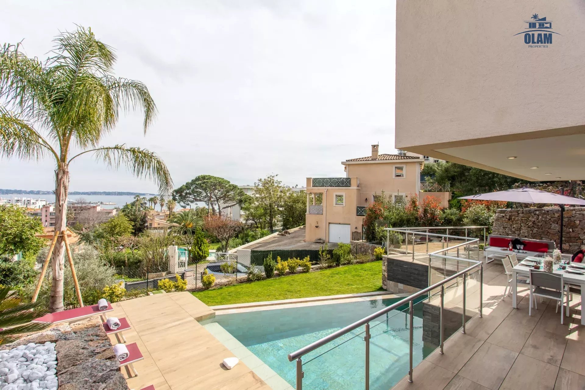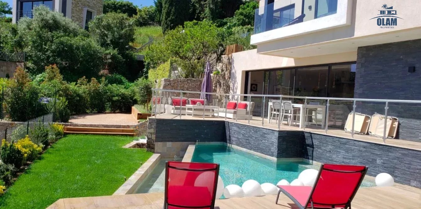 Limitrophe à la commune de Cannes, à Golfe-juan cette splendide villa d'architecte idéalement placée à 600m de la plage, vous accueille avec ses équipements haut de gamme.
