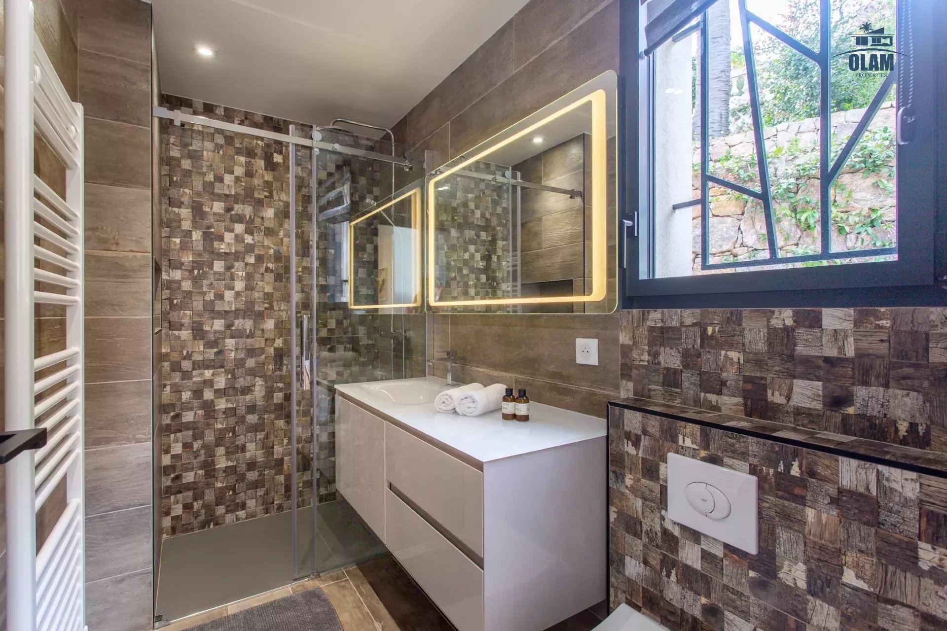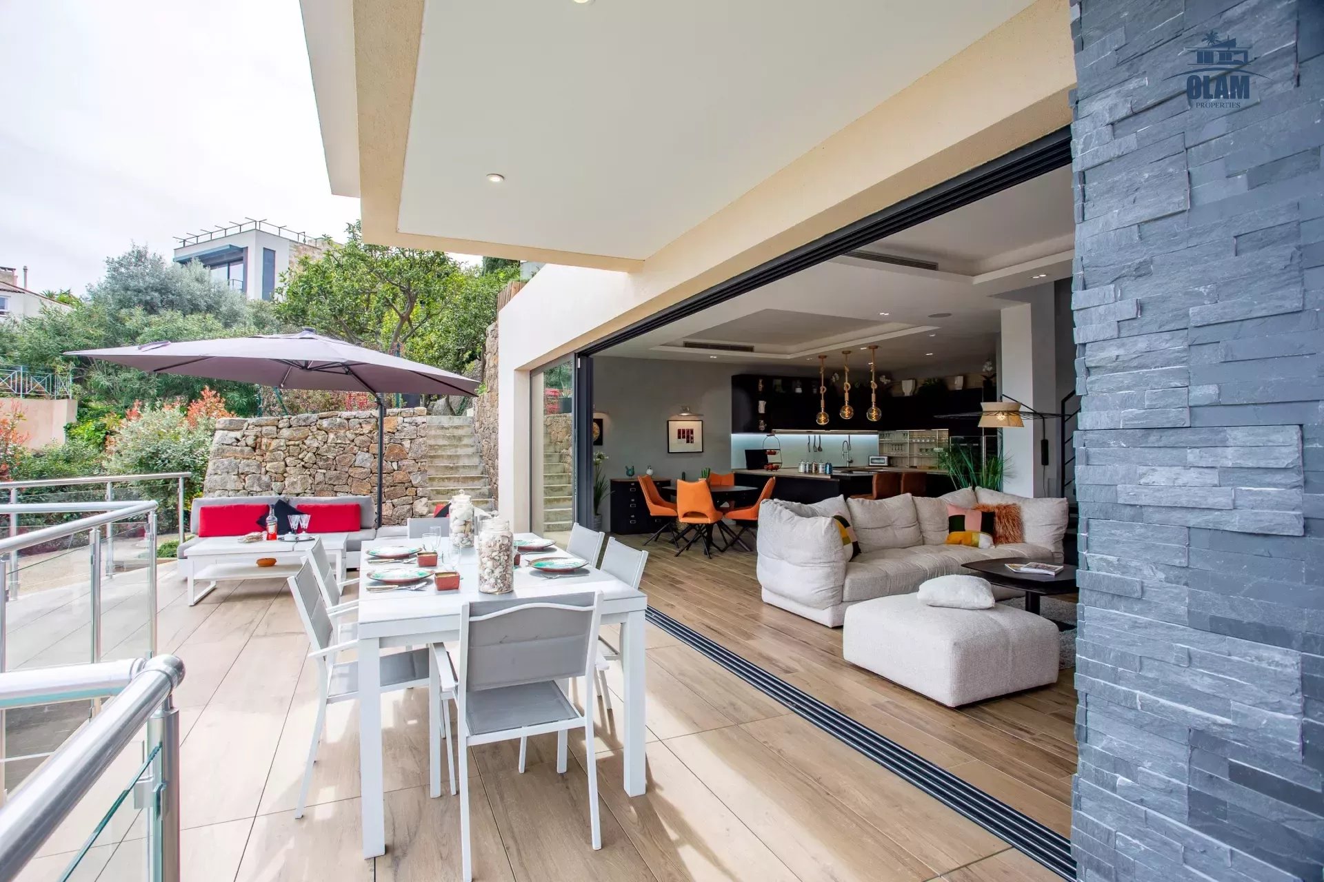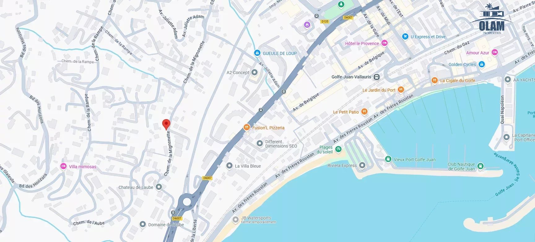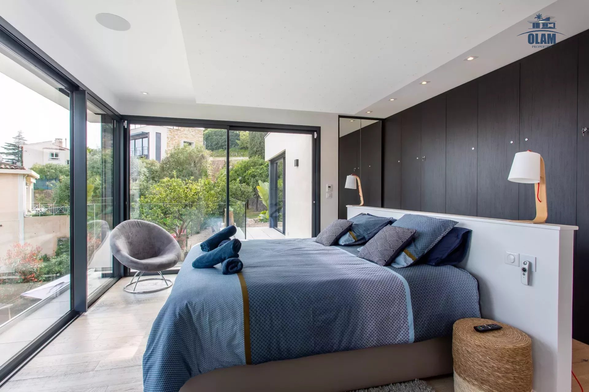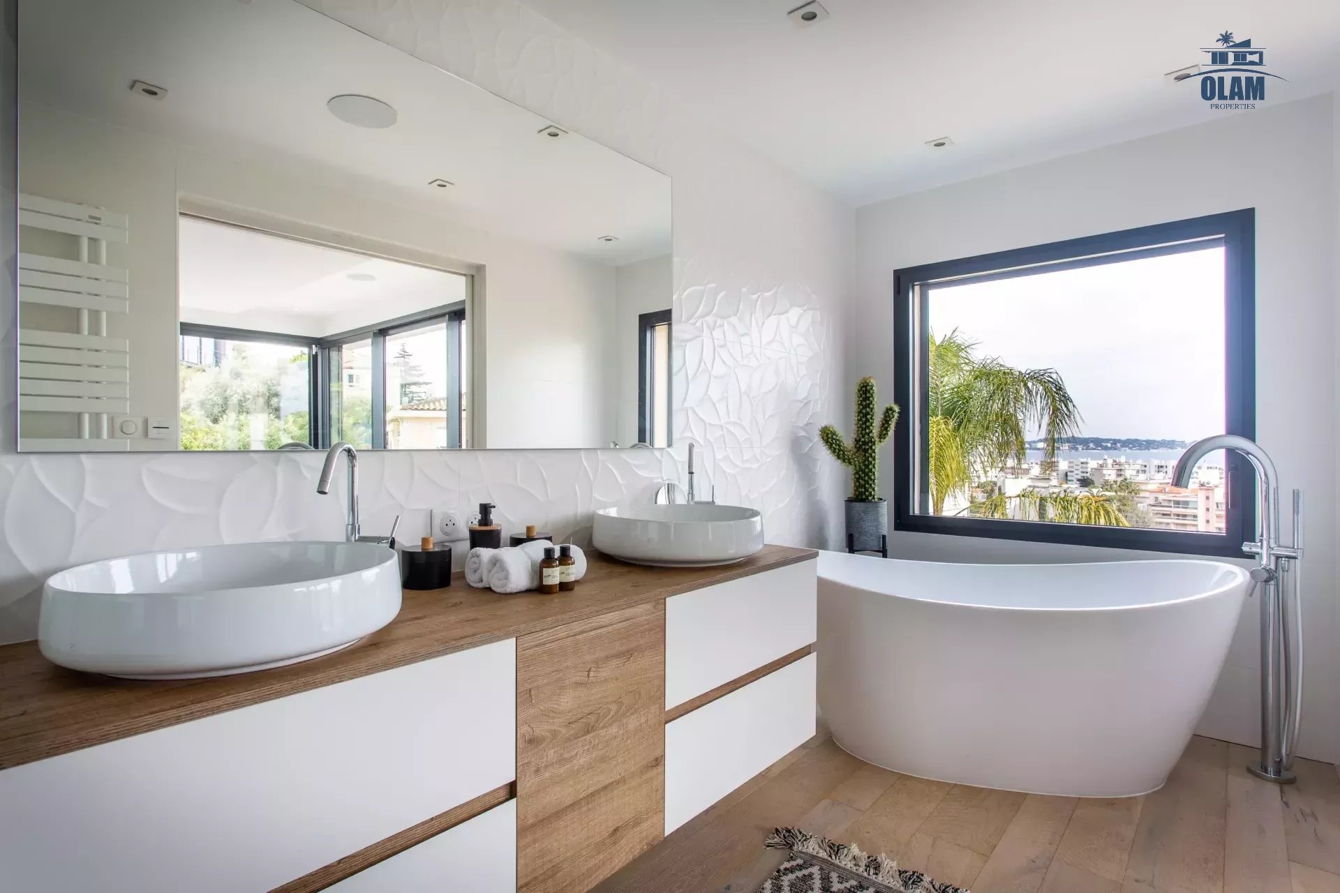 Limitrophe à la commune de Cannes, à Golfe-juan cette splendide villa d'architecte idéalement placée à 600m de la plage, vous accueille avec ses équipements haut de gamme.
