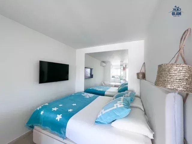 Cet appartement de 30m2 est composé d'un salon avec canapé, table pour les repas, une cuisine ouverte équipée (four, réfrigérateur, congélateur, plaque de cuisson, micro-ondes, lave vaisselle, machine à laver, cafetière nespresso, bouilloire,...) un coin nuit (ouvert) avec un lit double (160cm), une salle de douche avec wc.