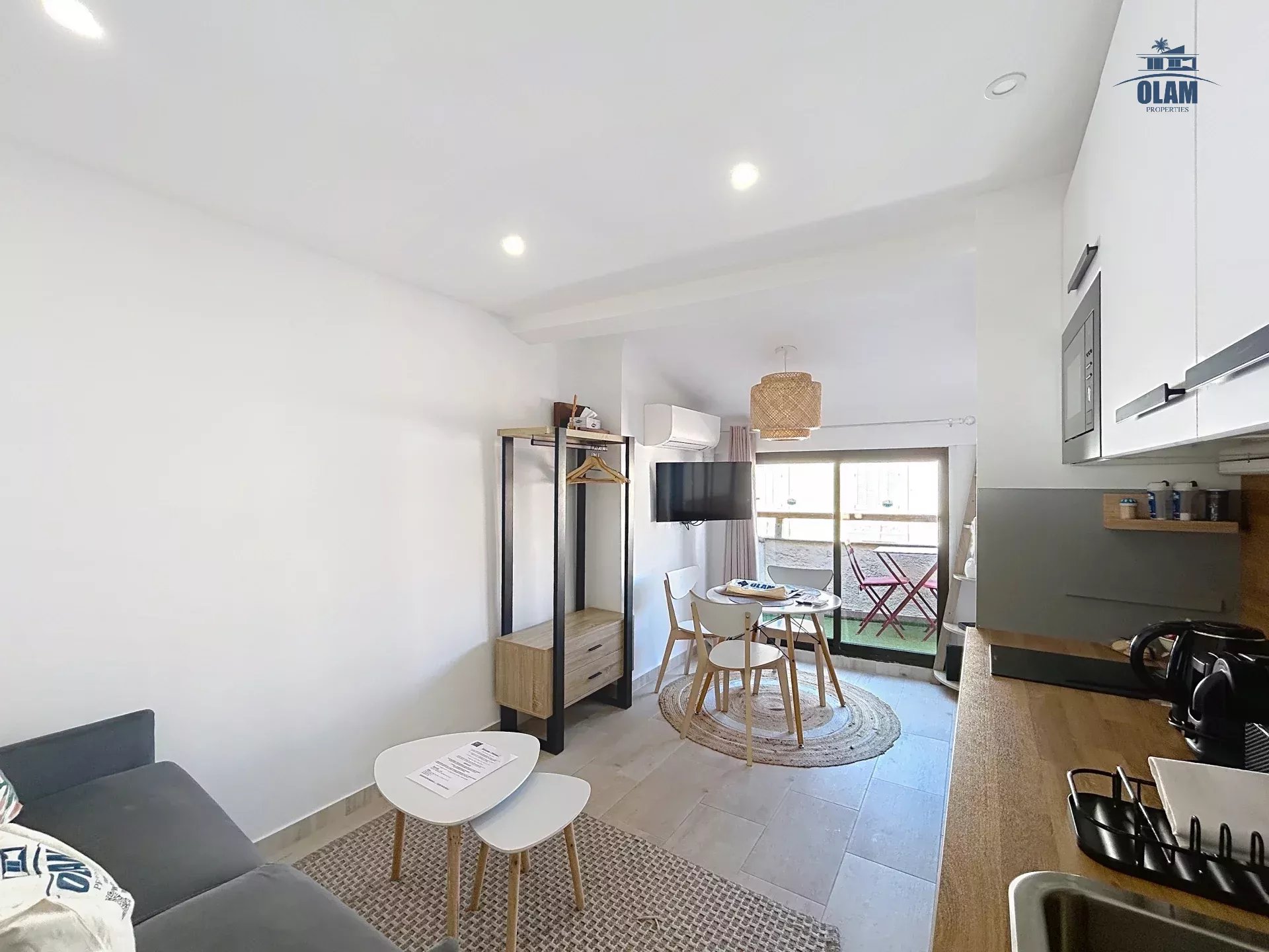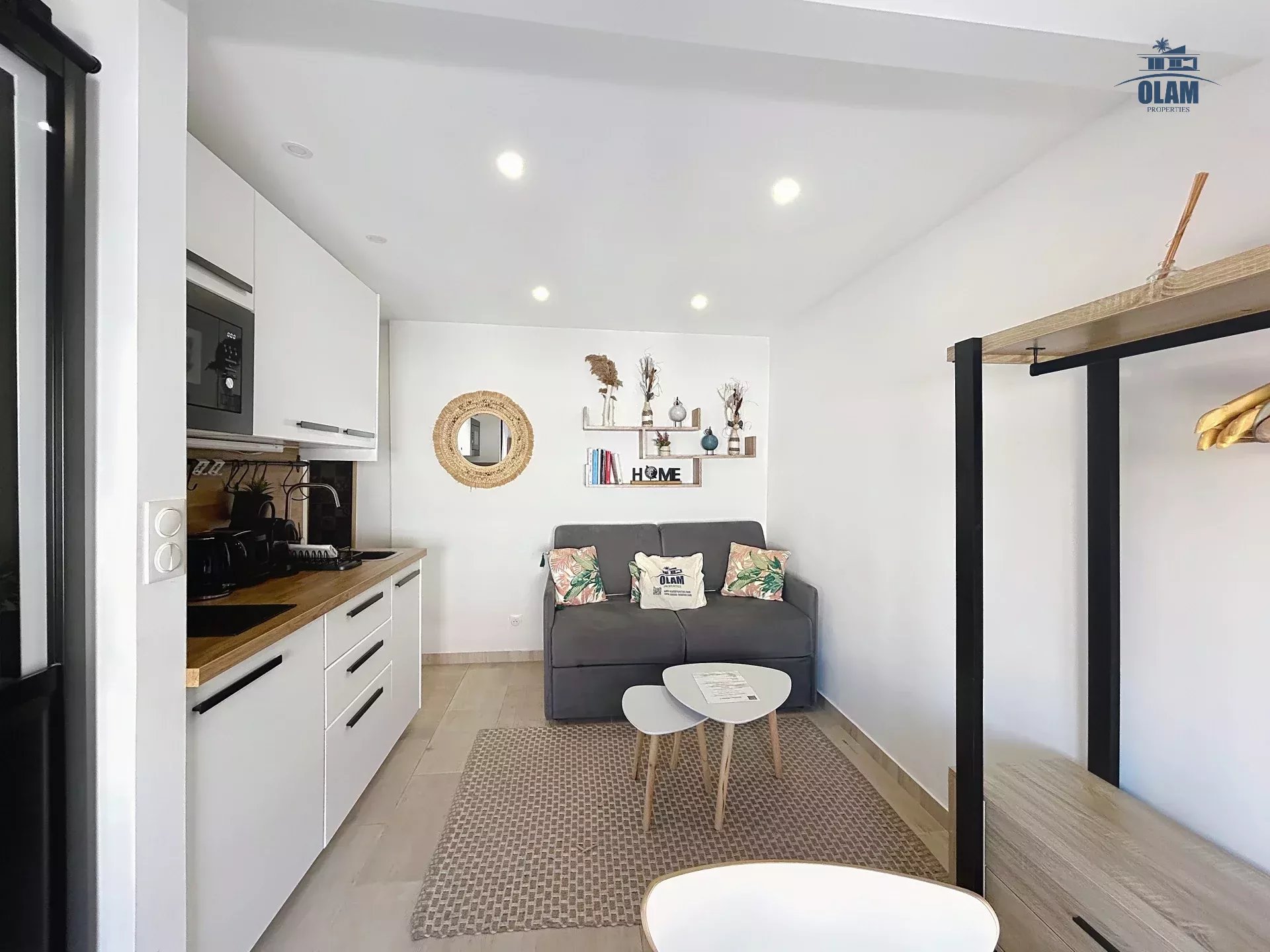 séjour avec canapé convertible ,une tv. Chambre avec lit pur 2 personnes (140cm), cuisine entièrement équipée : réfrigérateur, plaque de cuisson, four micro-ondes, cafetière,... salle de douche avec wc,