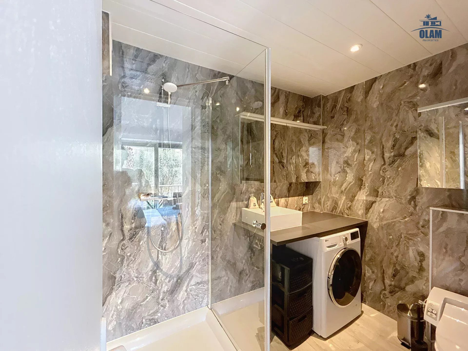 La chambre, véritable havre de paix, est dotée d’un lit confortable et d’une décoration épurée, propice à la détente. La salle de bain moderne, équipée d’une douche spacieuse et d’une machine à laver, ajoute une touche de praticité à votre séjour.