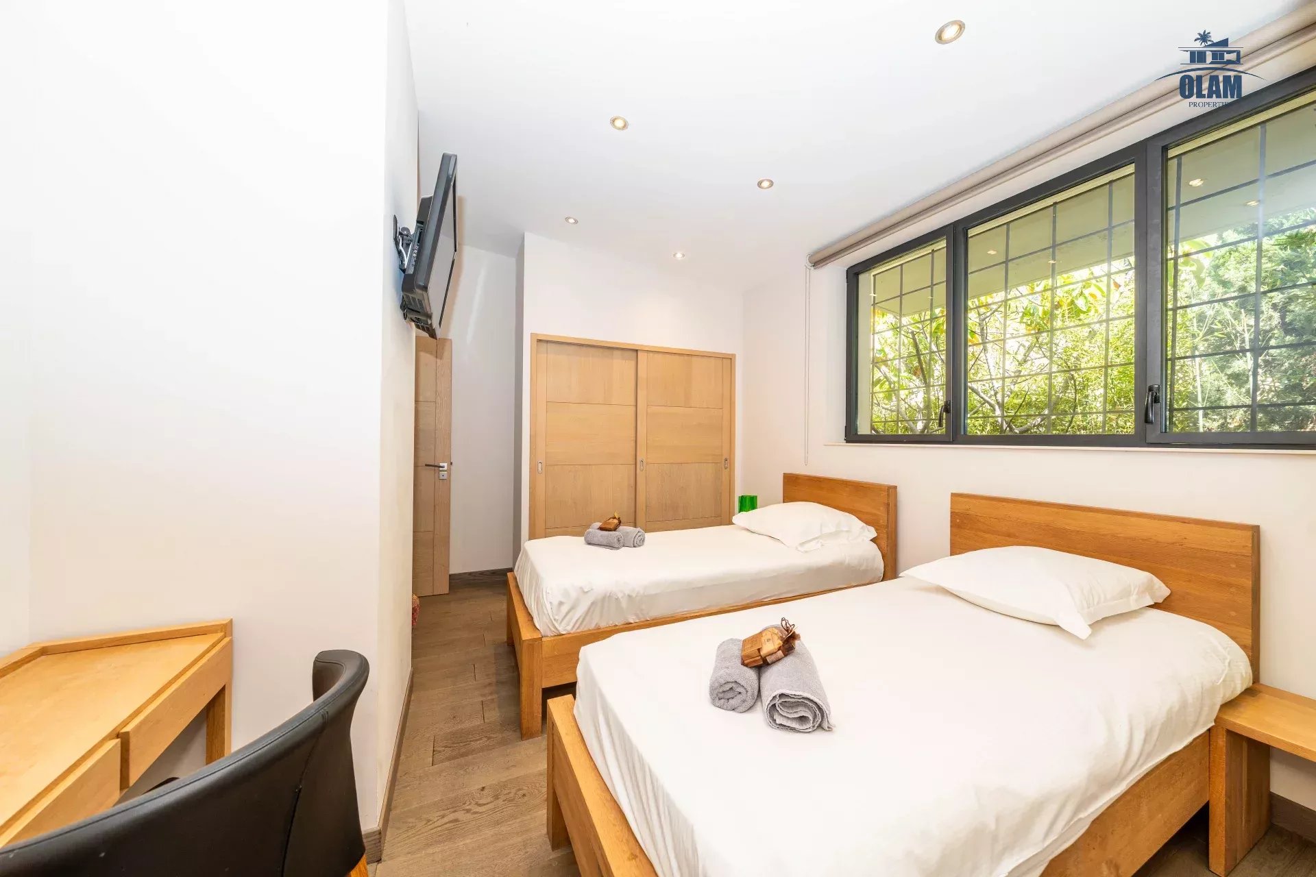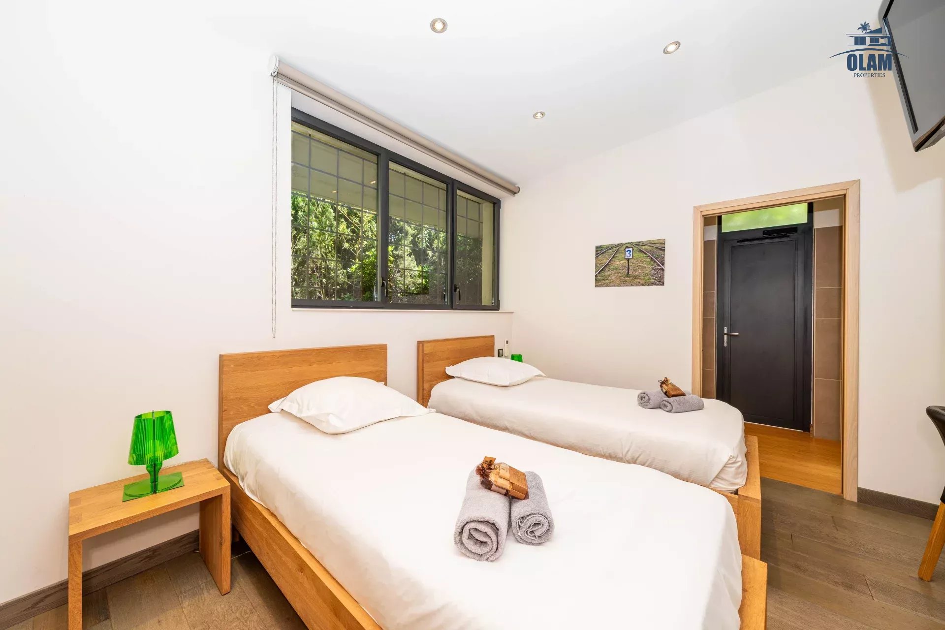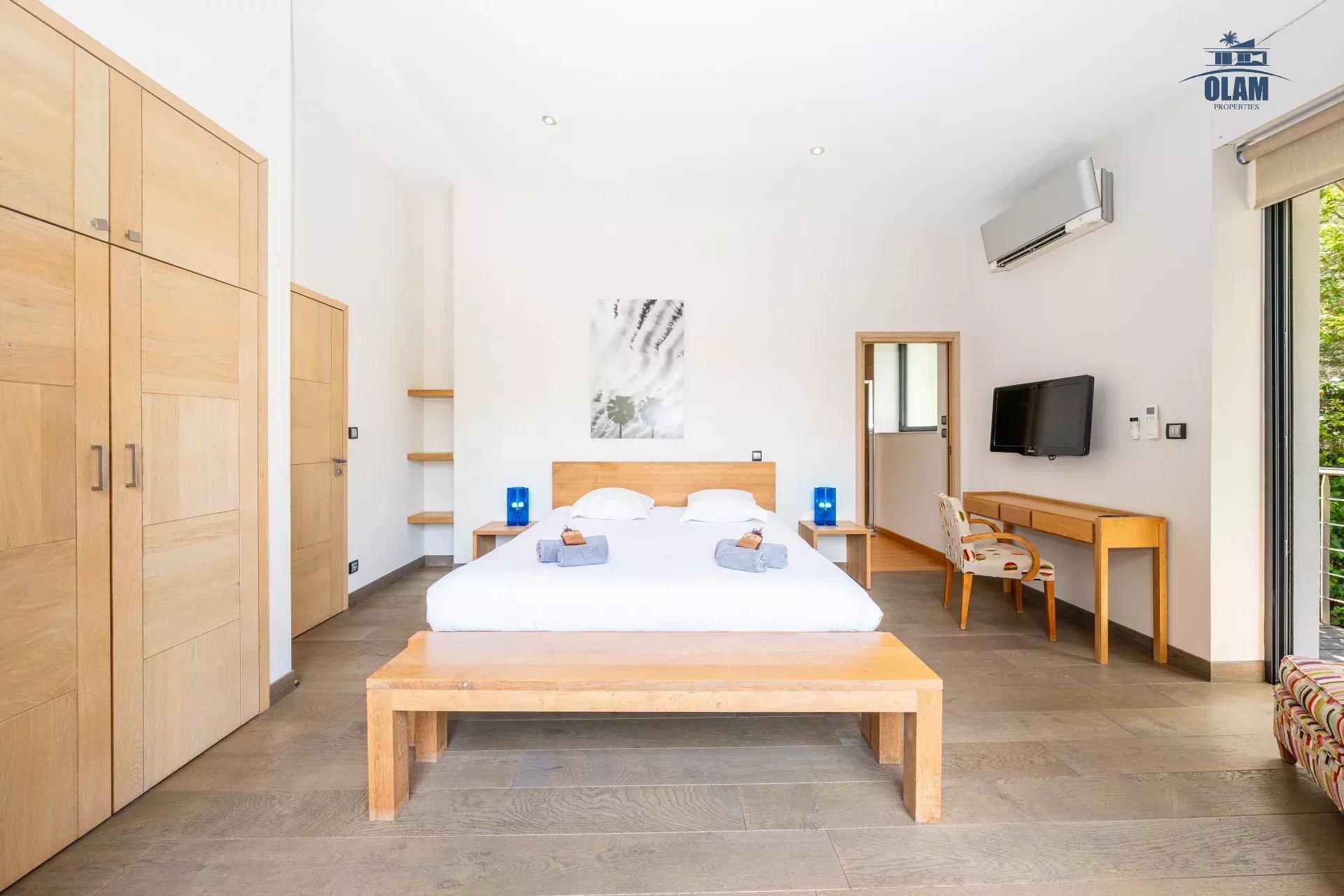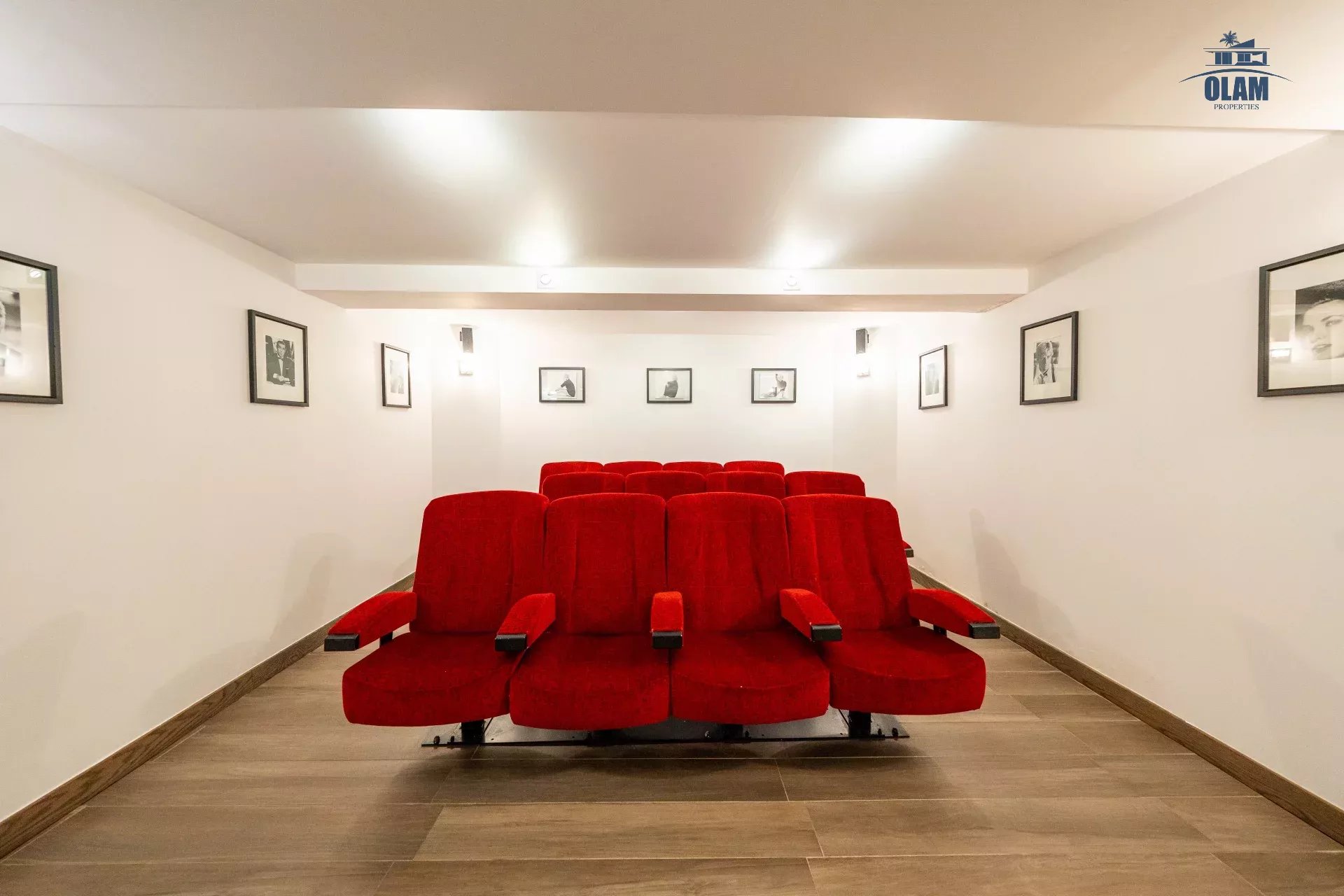 Pool level : junior bedroom #4 (2 single beds), junior bedroom #5 with double bed (180cm) with bathroom (bathtub) which can be shared with the junior, master bedroom #6 with double bed (180cm) with bathroom (bathtub), cinema room, laundry.
