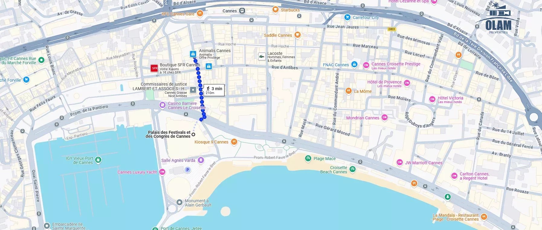 Situé à 2 pas de la Croisette, et au coeur de la rue d'antibes. L'appartement est situé au 5e étage (avec ascenseur jusqu'au 4e étage) au sein d'une résidence "Art déco". Son emplacement permet de rejoindre le Palais des Festivals et le boulevard de la Croisette en moins de 3 minutes à pieds.