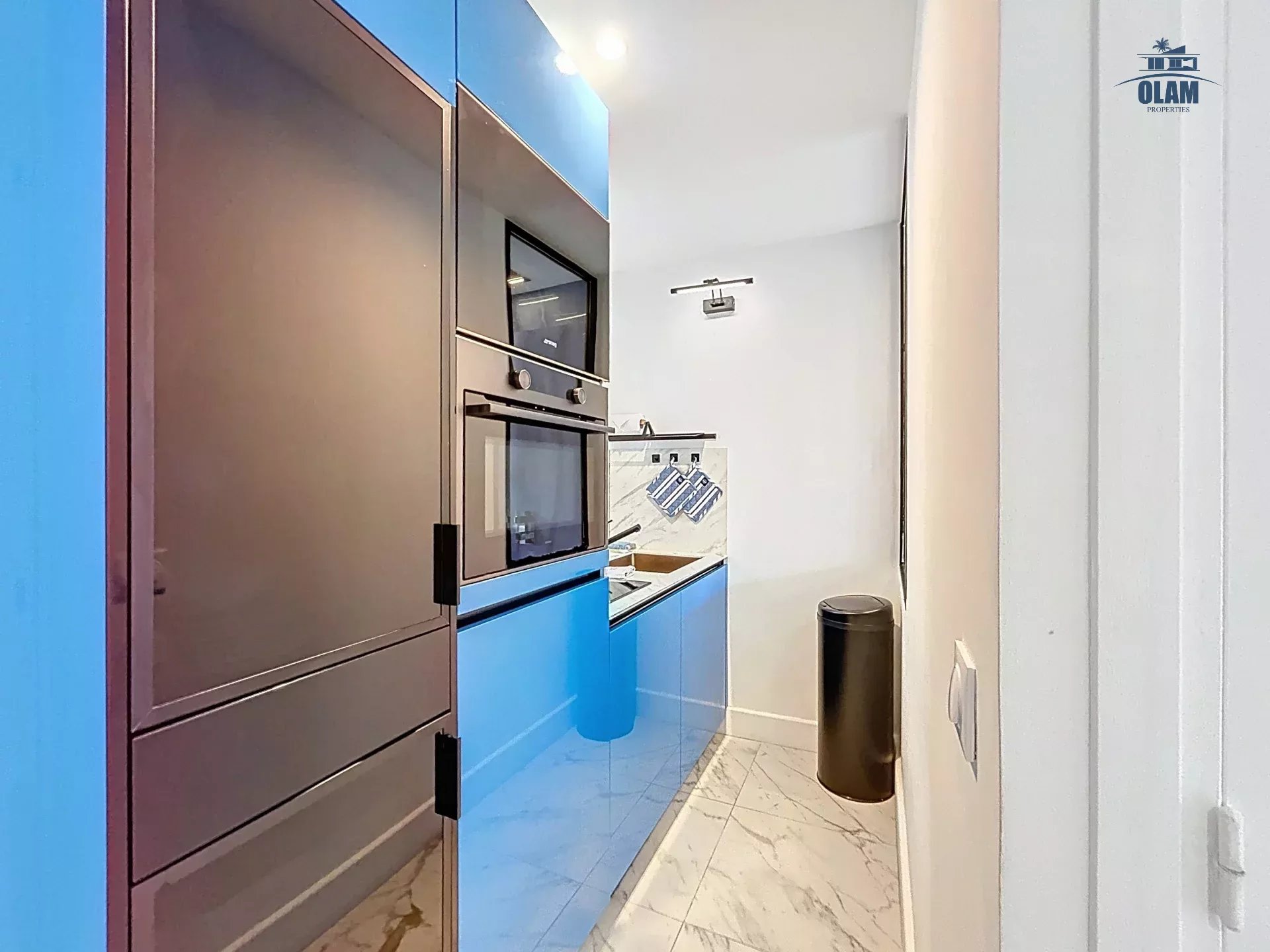 Dès l’entrée, vous serez séduit par une décoration soignée aux nuances de bleu, évoquant la mer Méditerranée toute proche. Le salon lumineux, doté d’un canapé confortable et d’une télévision à écran plat, invite à la détente après une journée ensoleillée. La cuisine, entièrement équipée avec des appareils modernes, offre un espace convivial pour préparer vos repas.