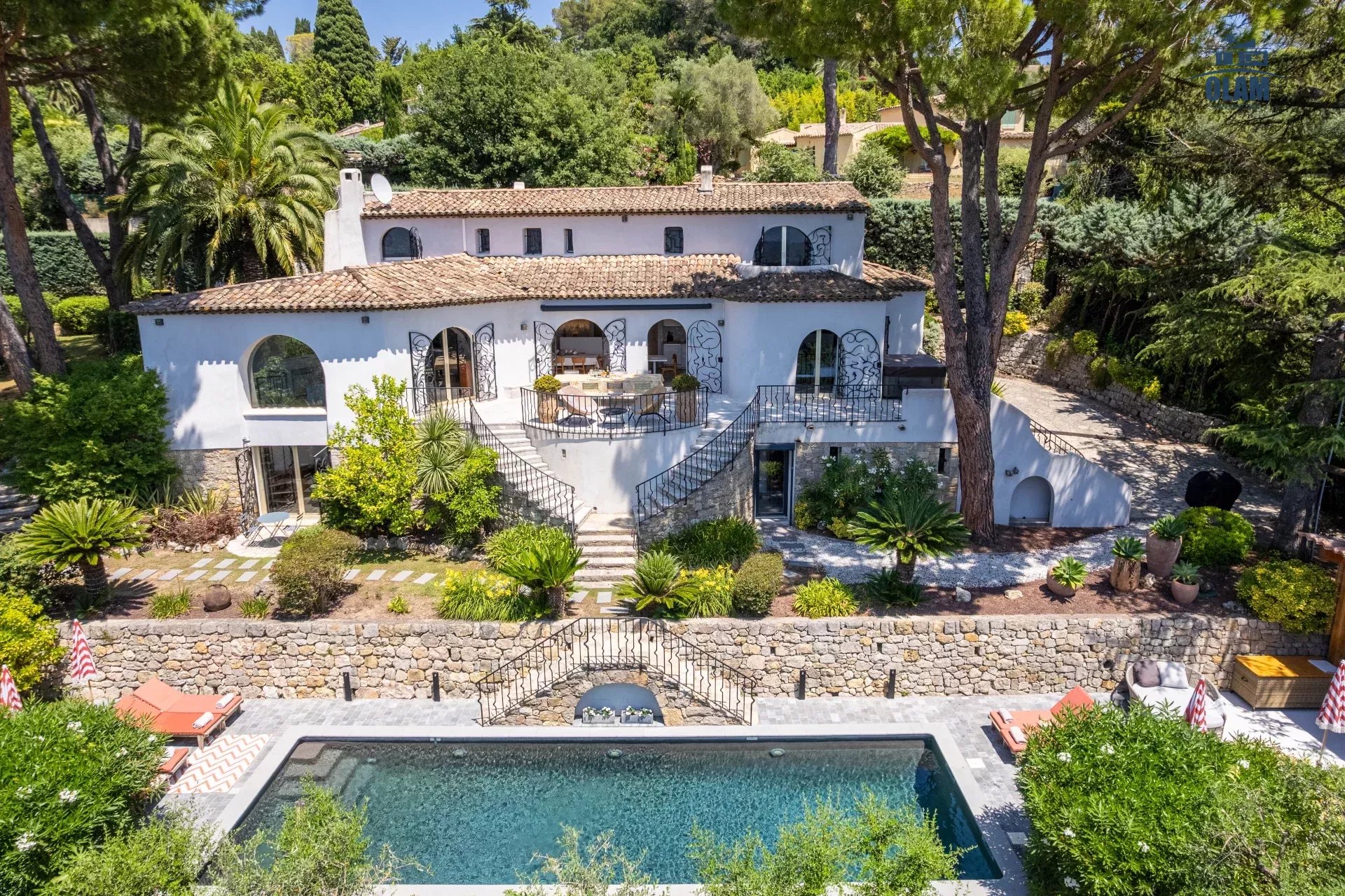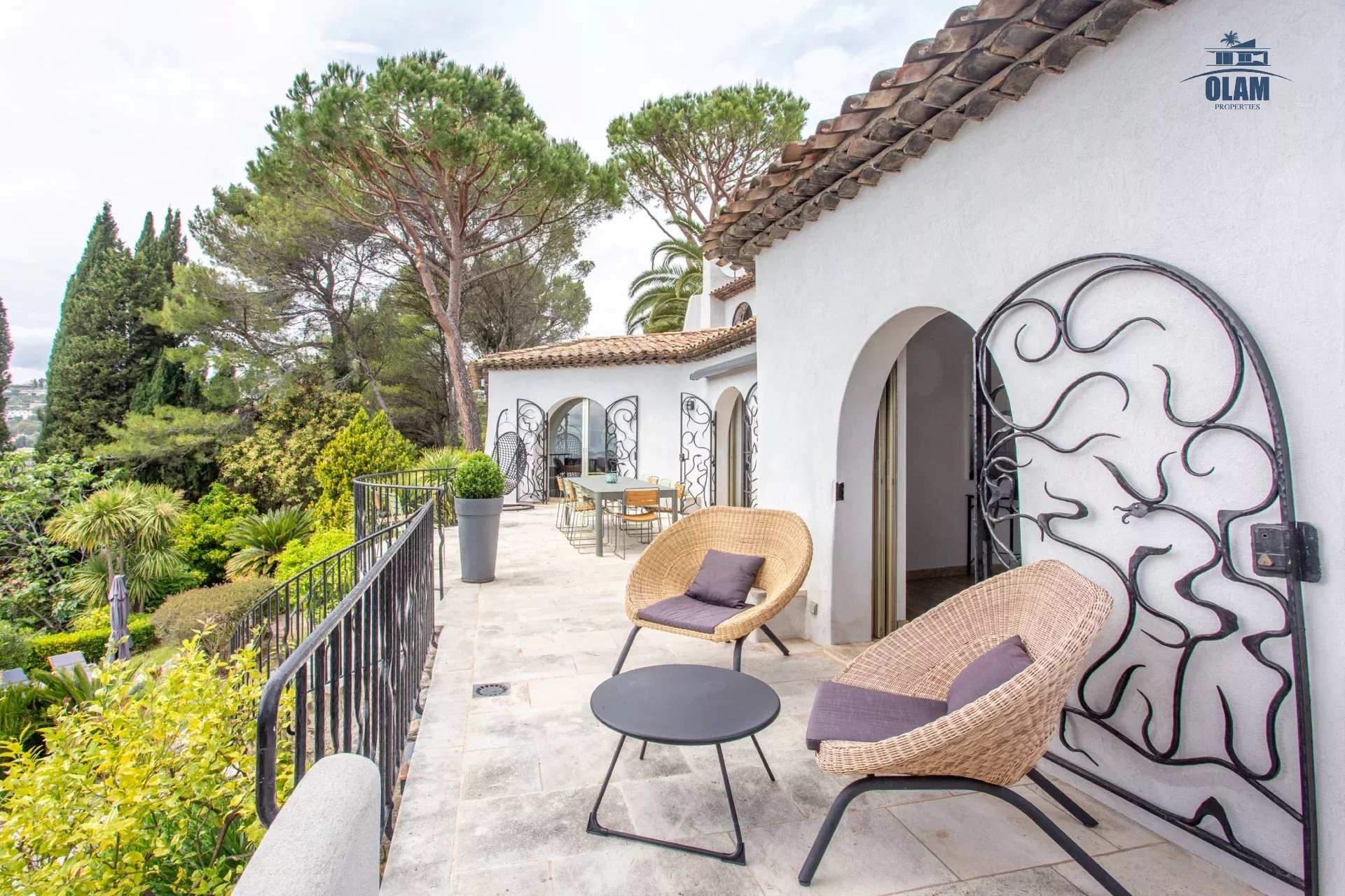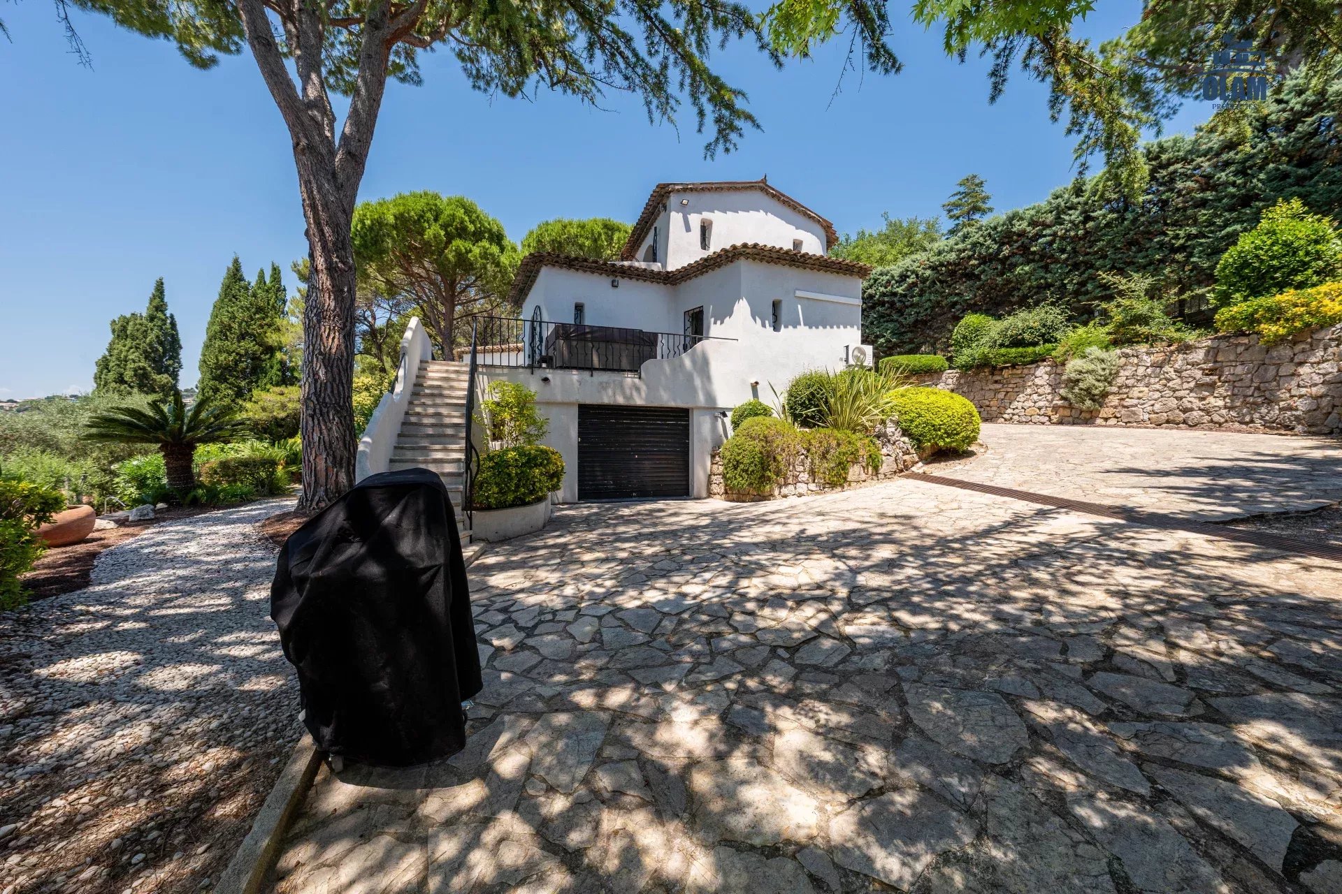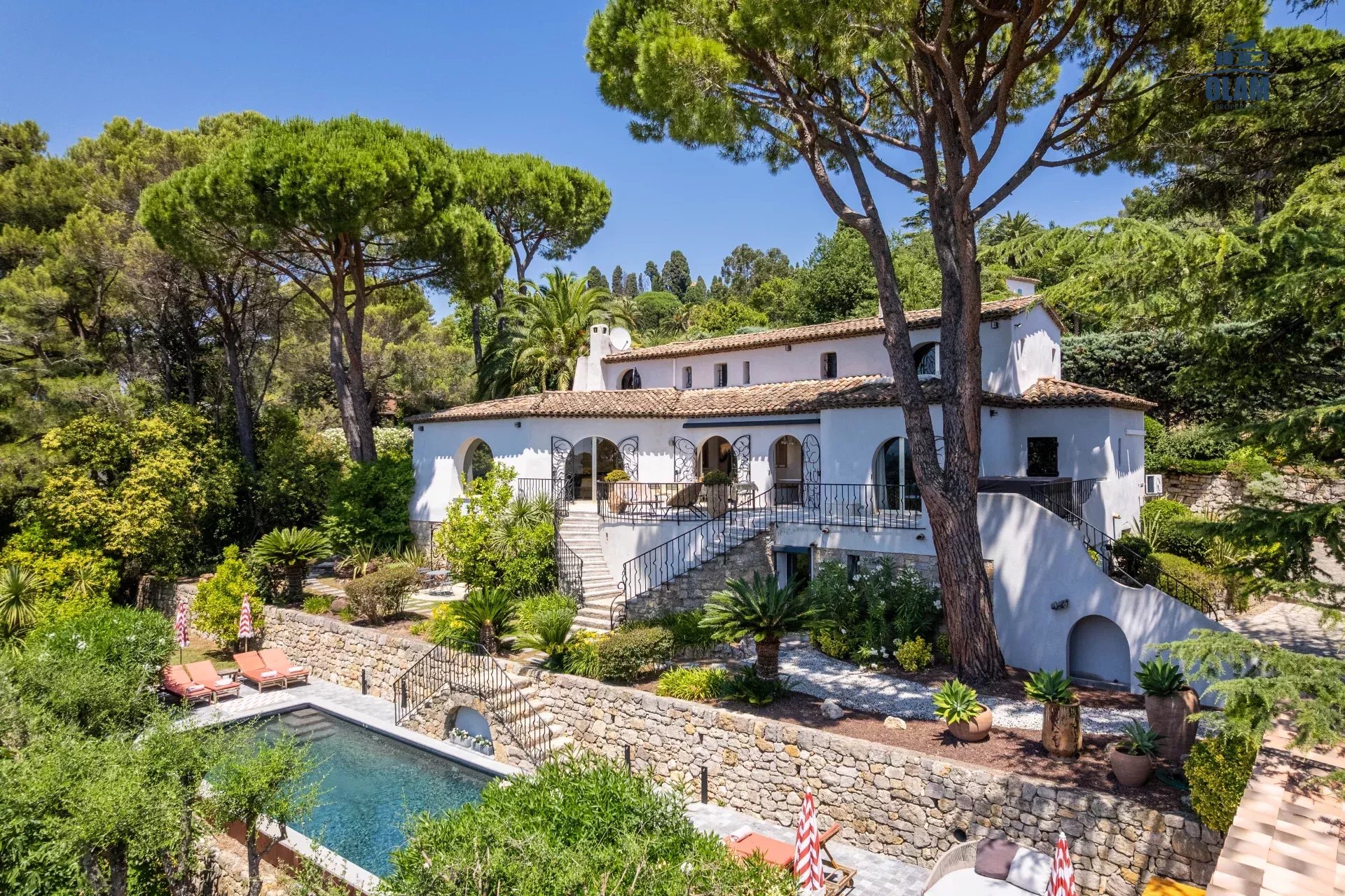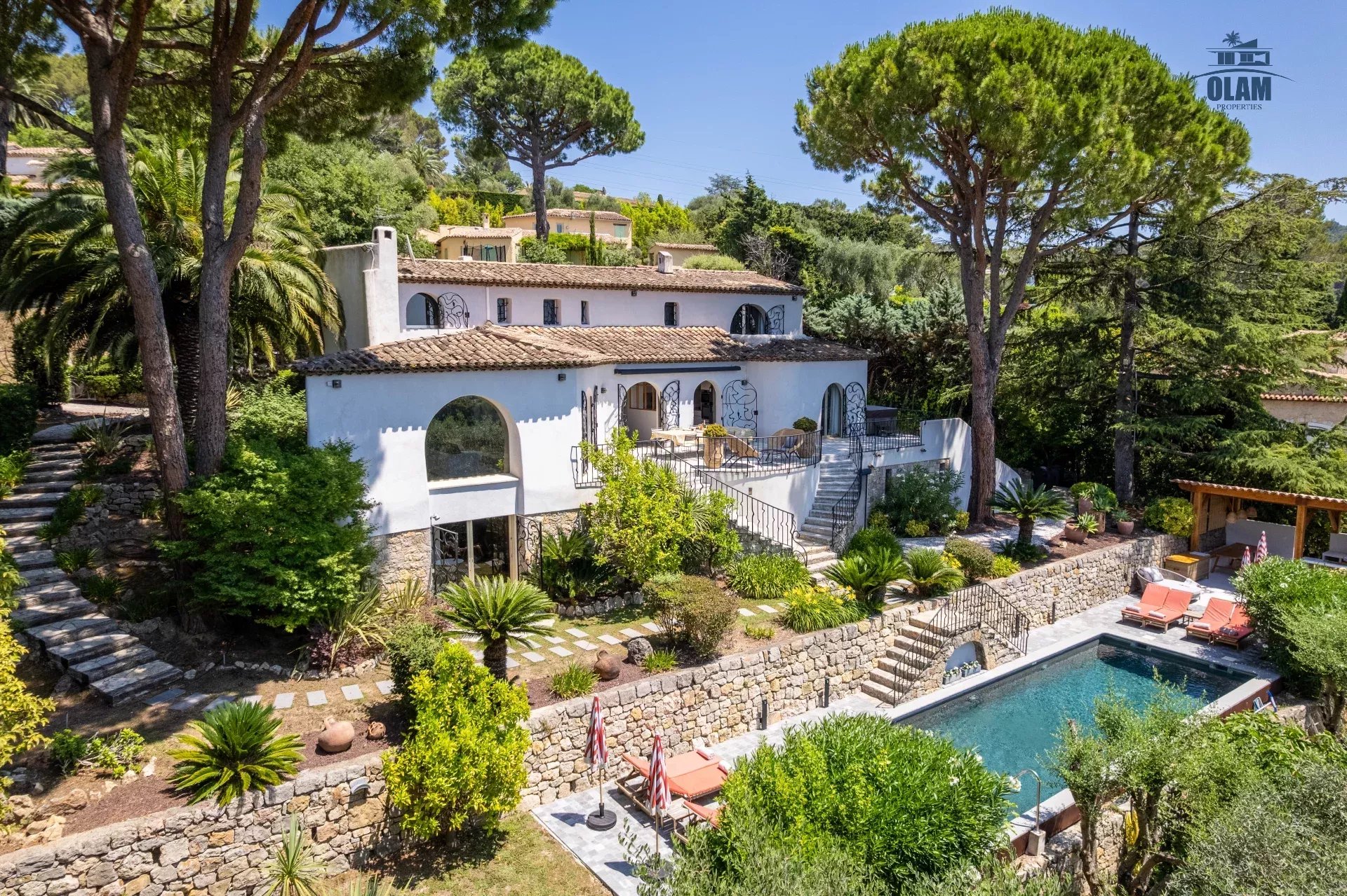 Dans un domaine privé, à proximité du village de Mougins (3mn en voiture), villa d’environ 250m2 composée comme suit :