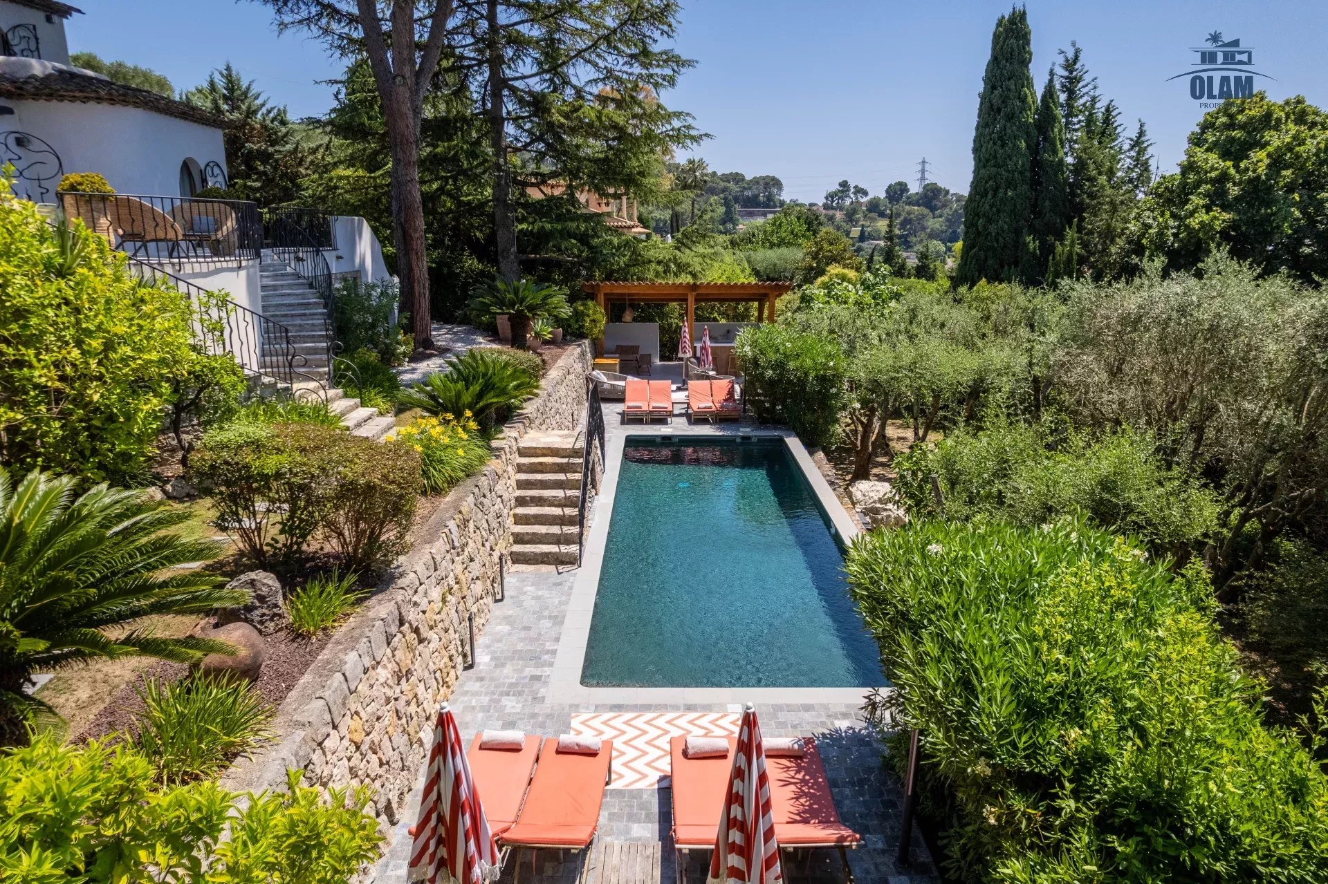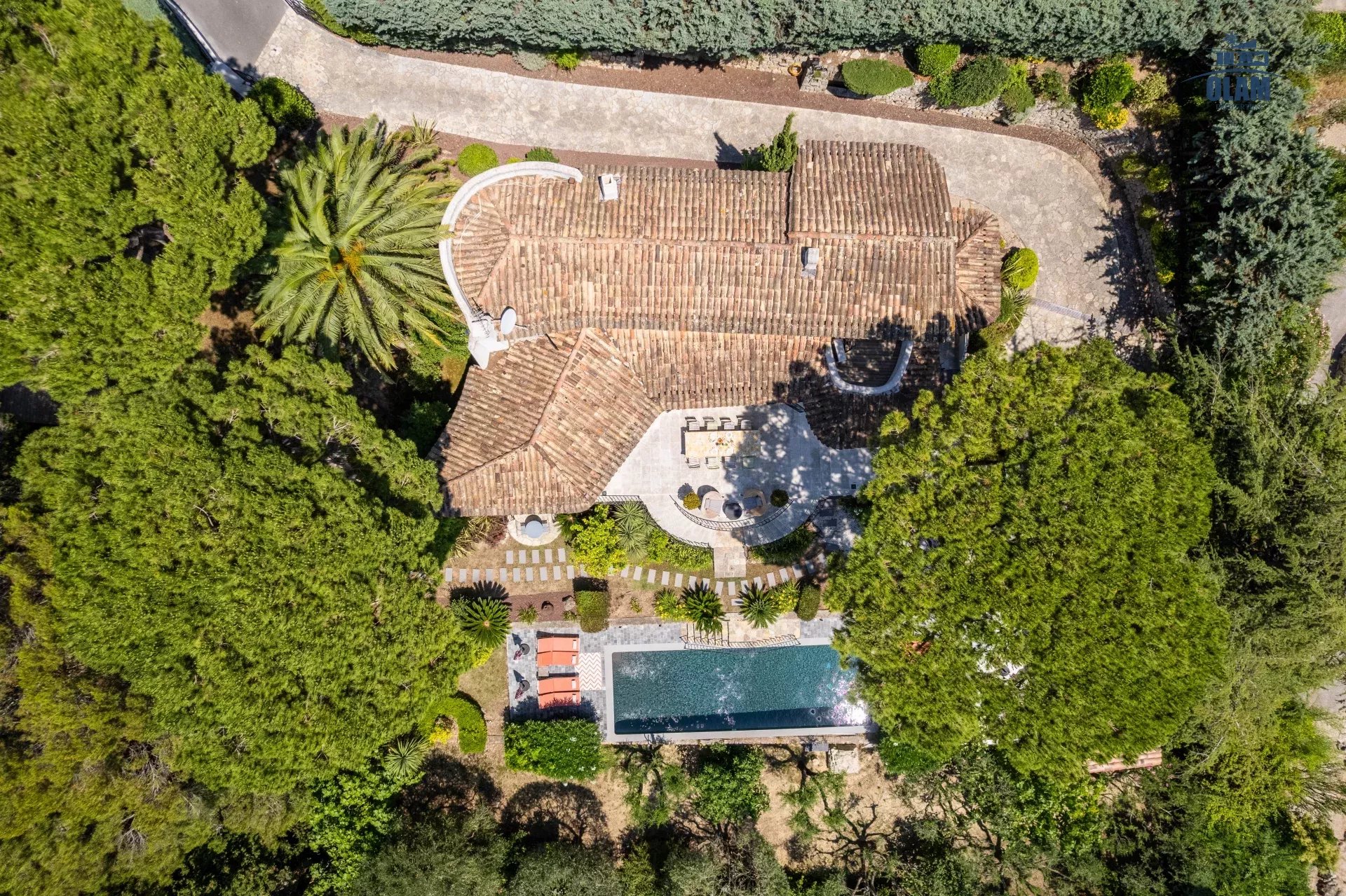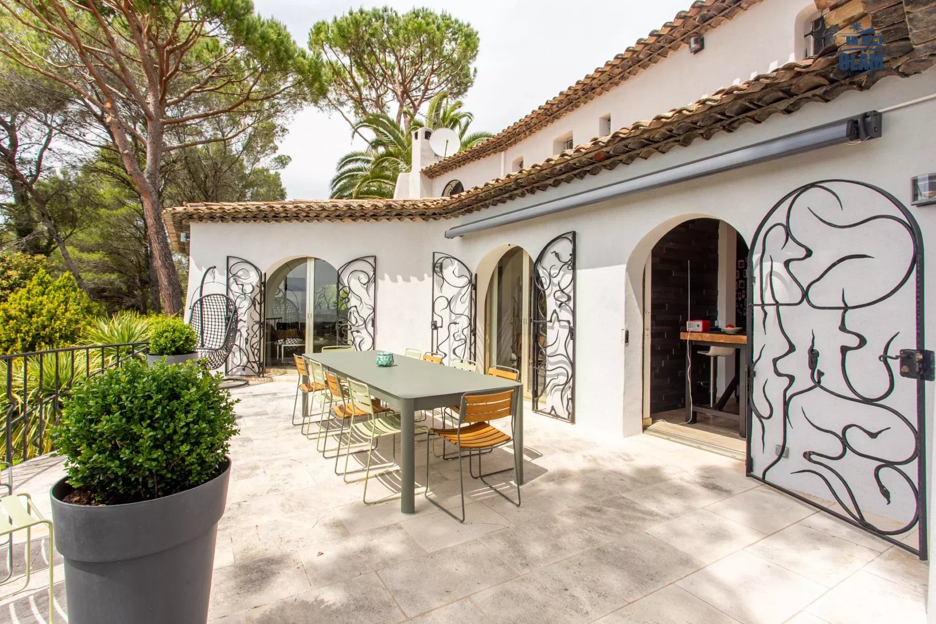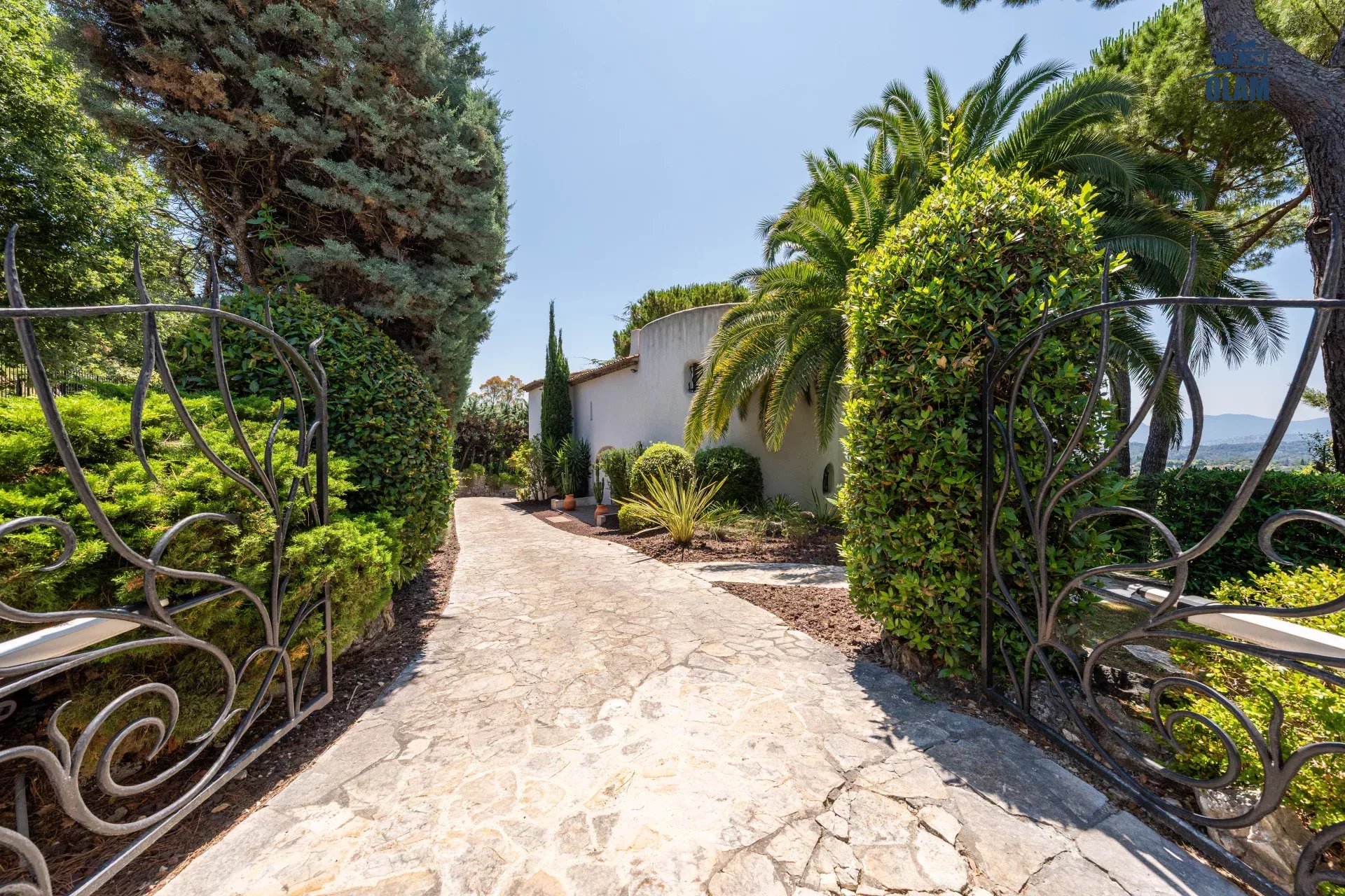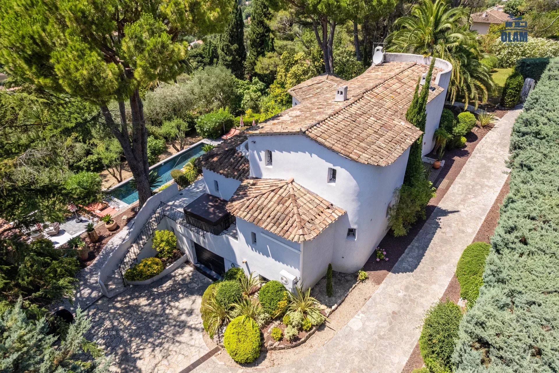 Dans un domaine privé, à proximité du village de Mougins (3mn en voiture), villa d’environ 250m2 composée comme suit :