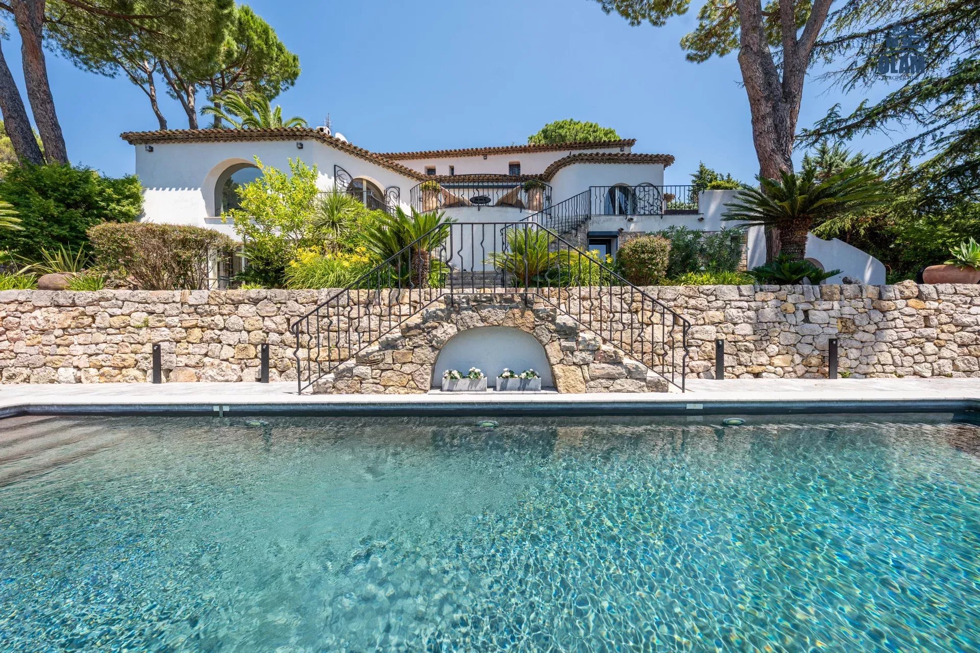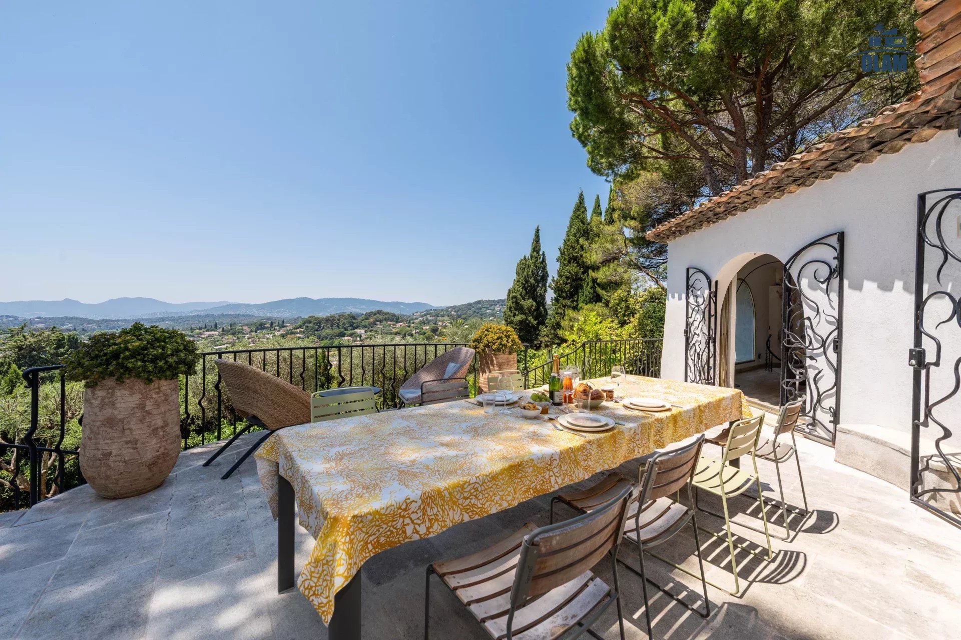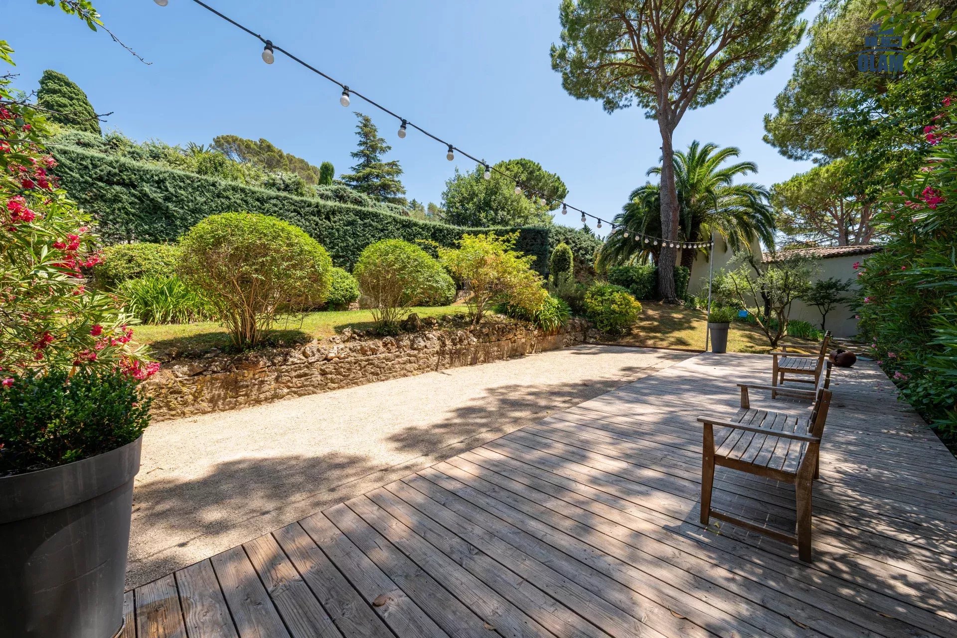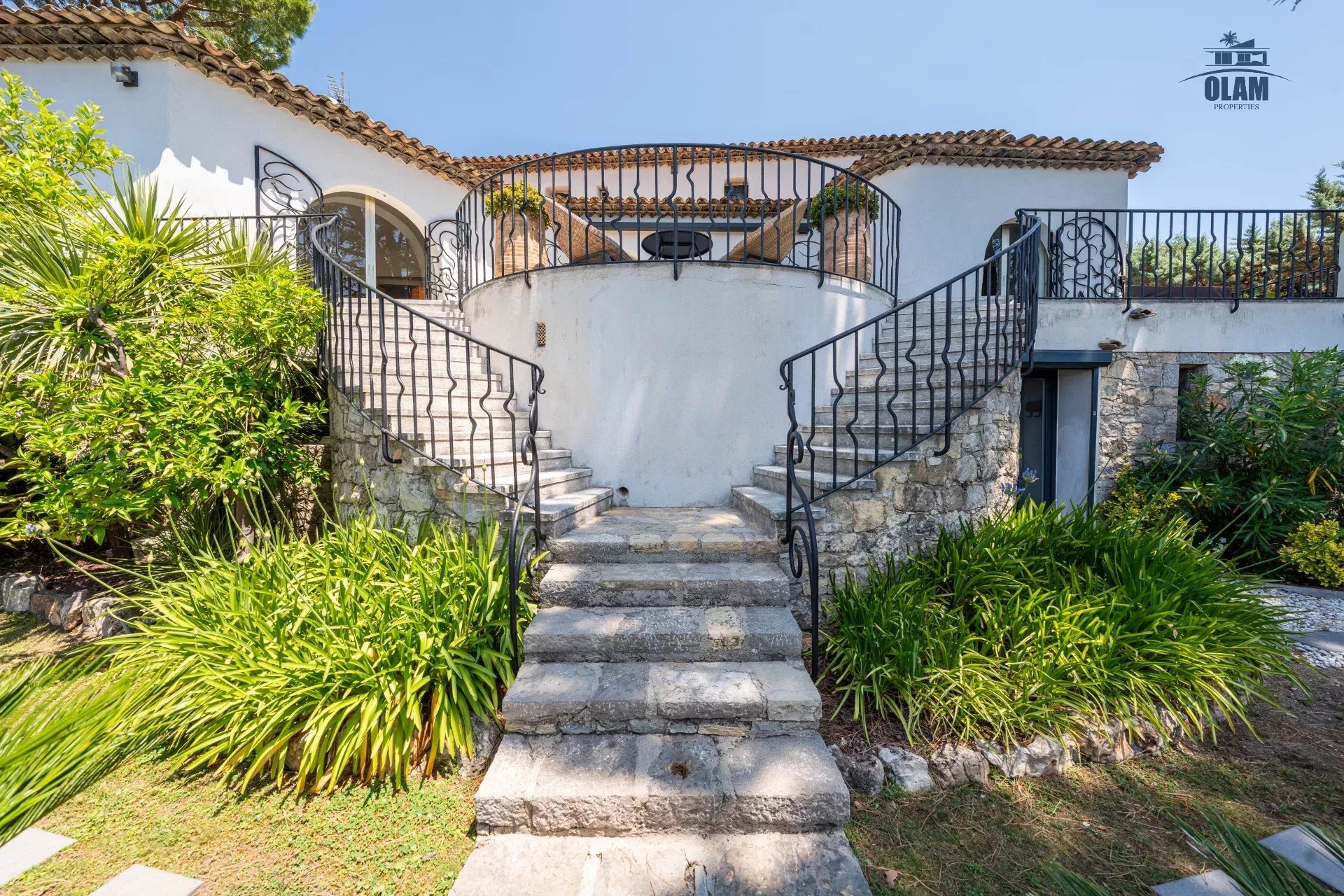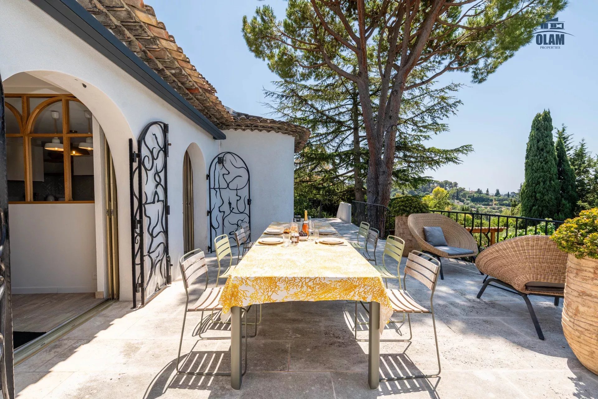 Dans un domaine privé, à proximité du village de Mougins (3mn en voiture), villa d’environ 250m2 composée comme suit :
