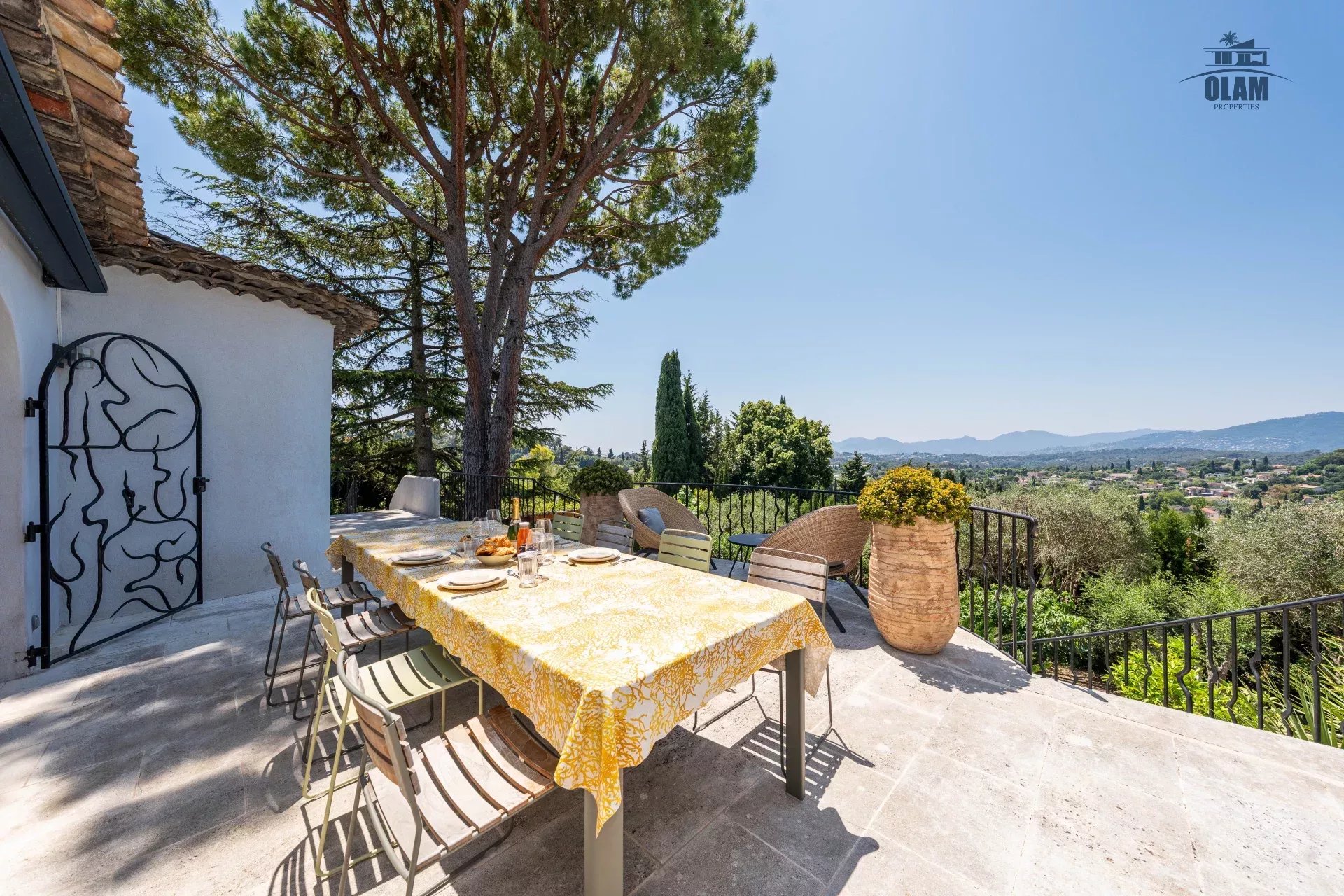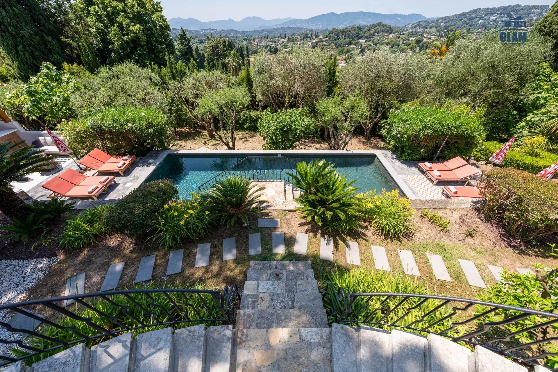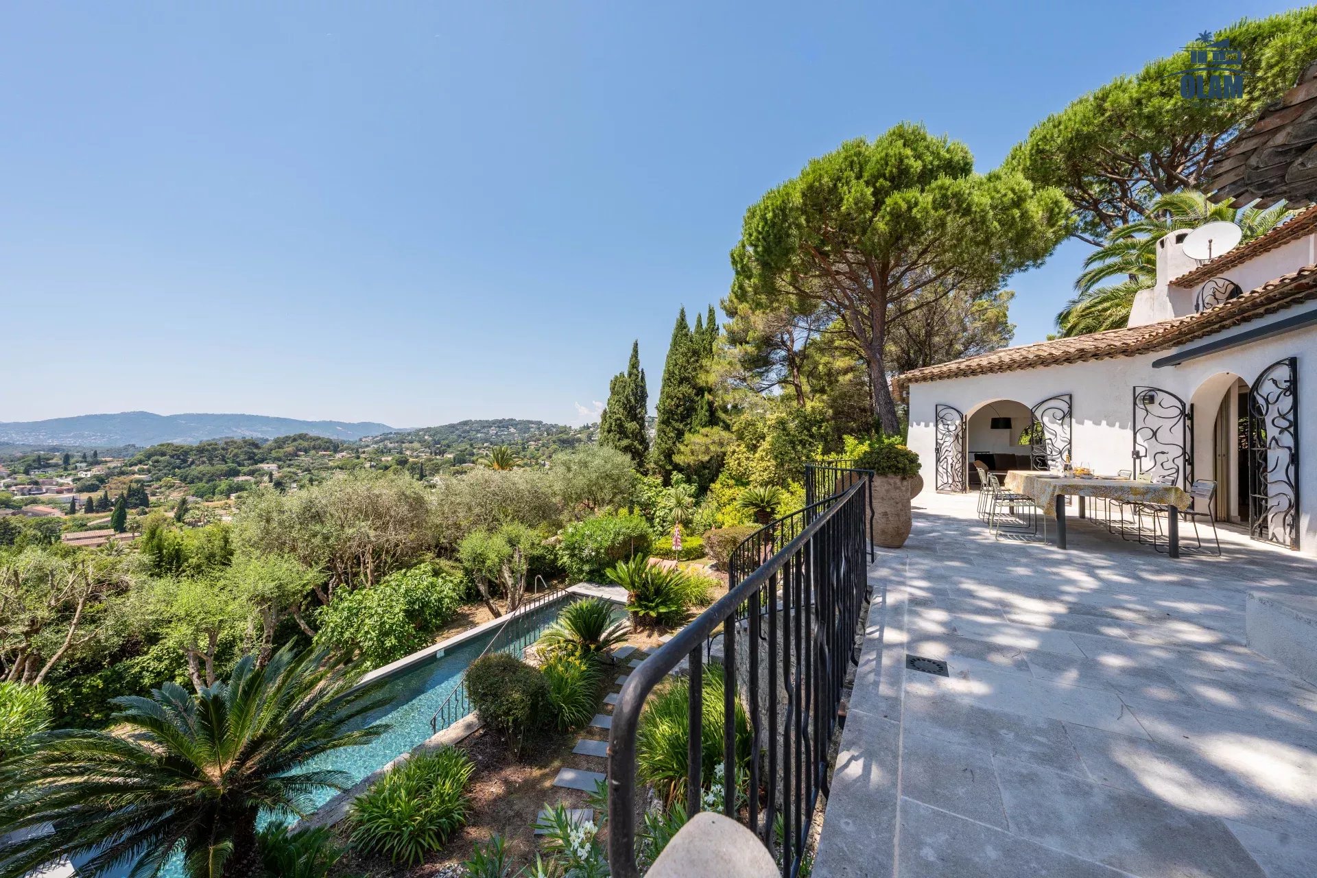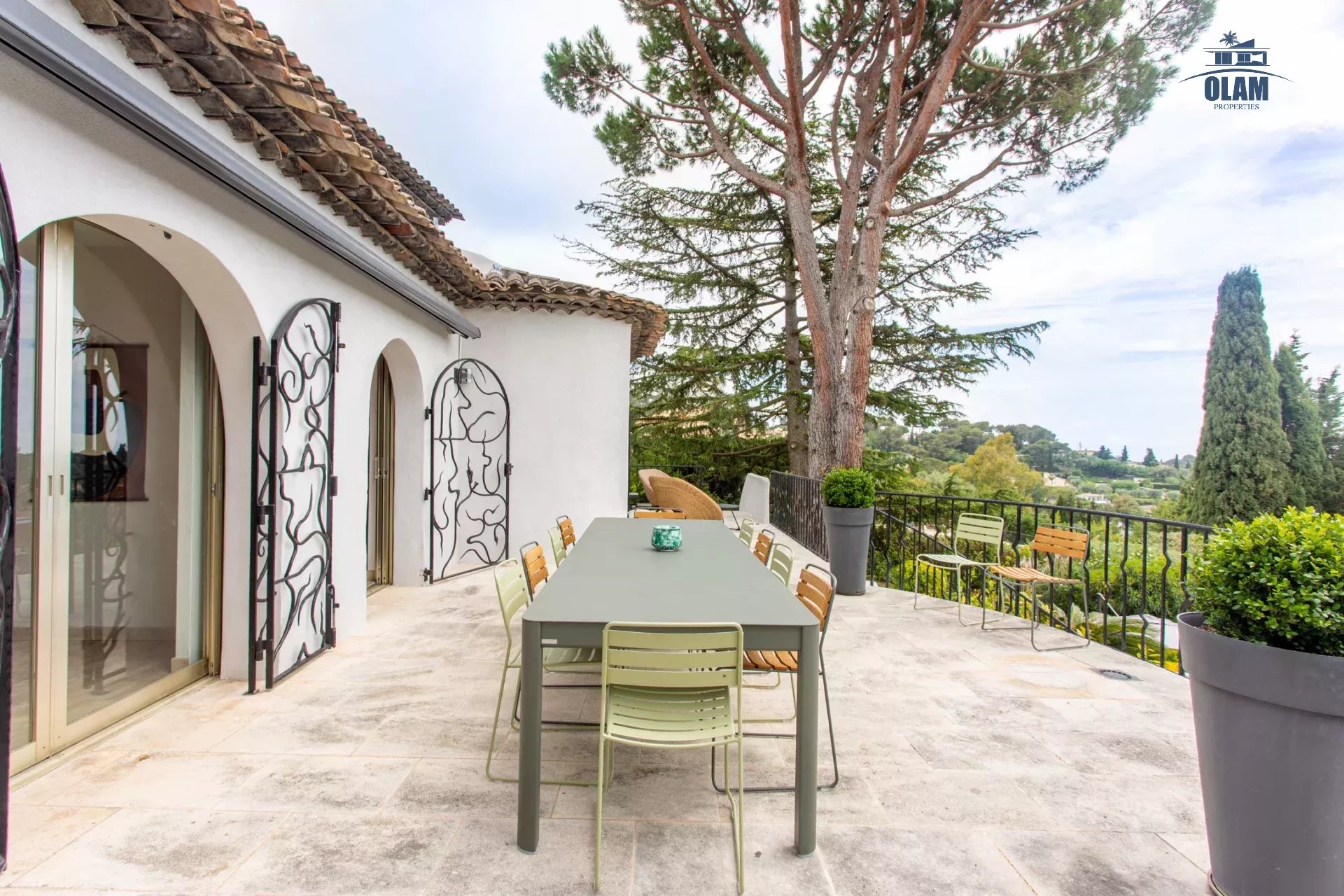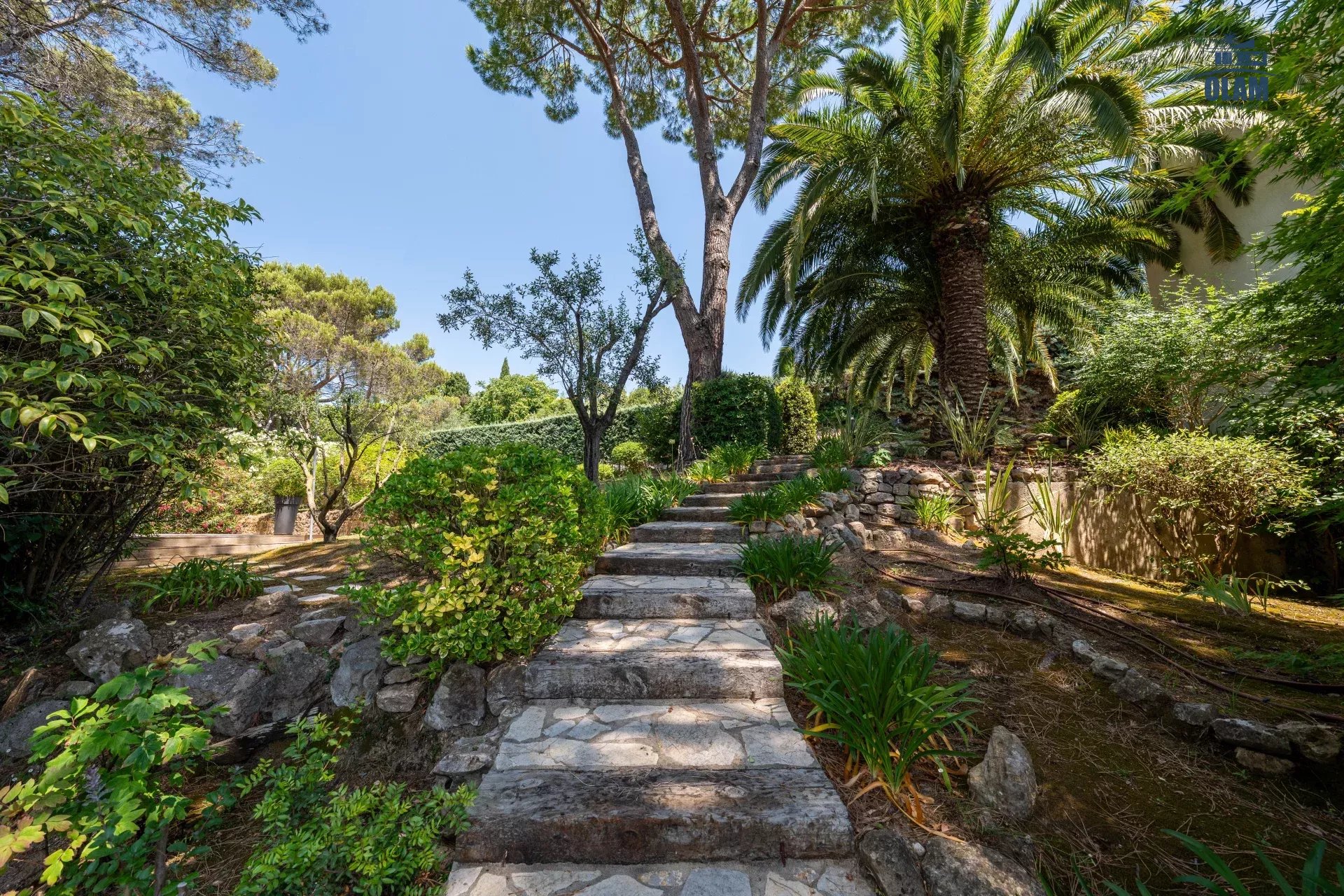 Dans un domaine privé, à proximité du village de Mougins (3mn en voiture), villa d’environ 250m2 composée comme suit :