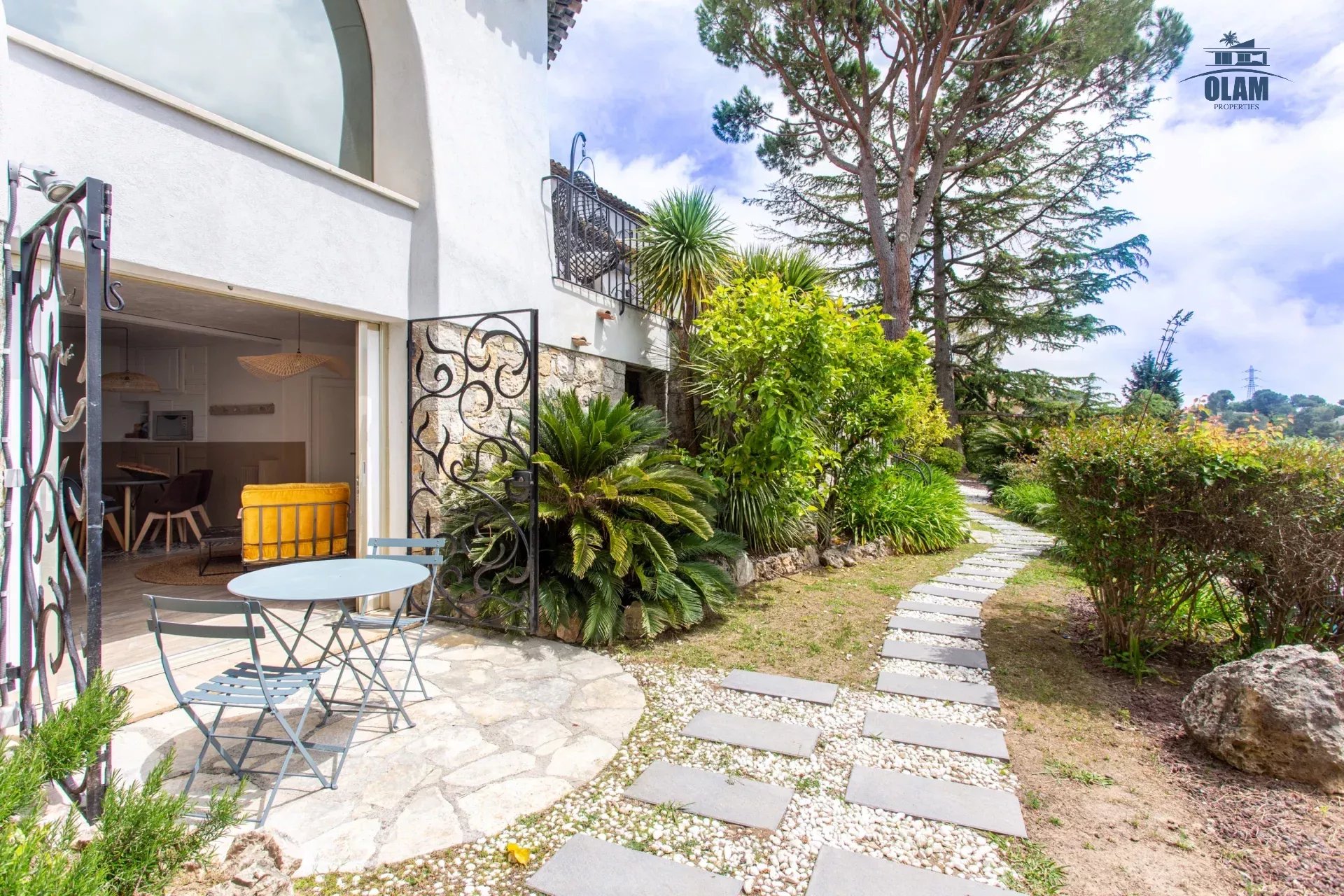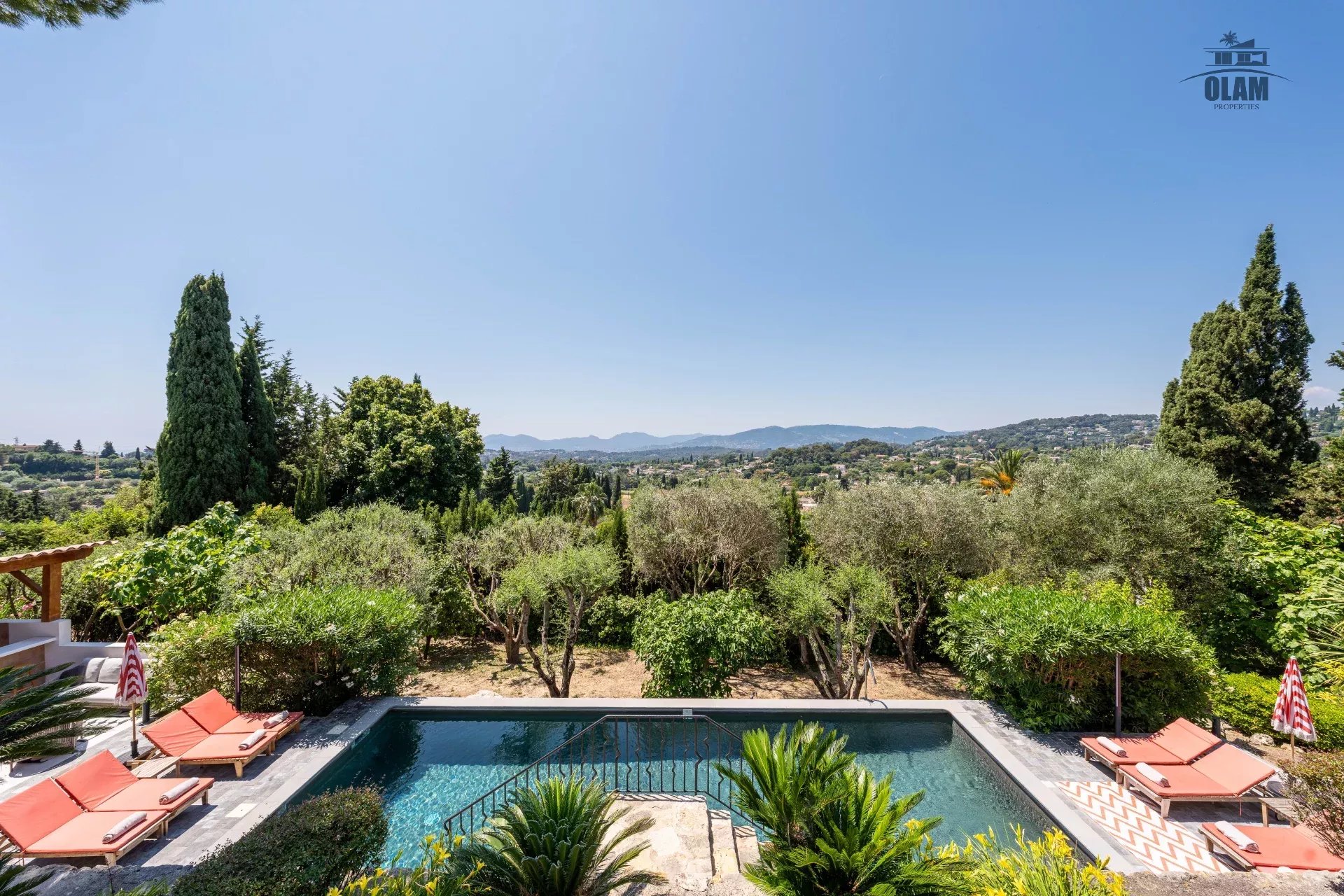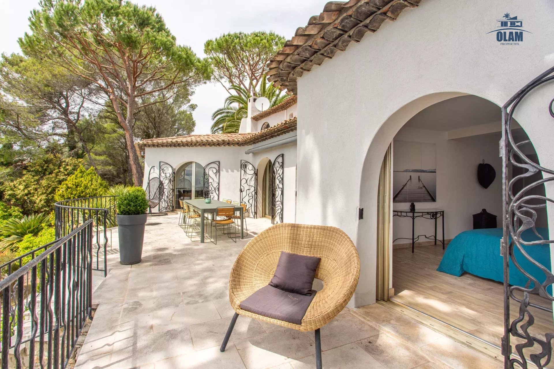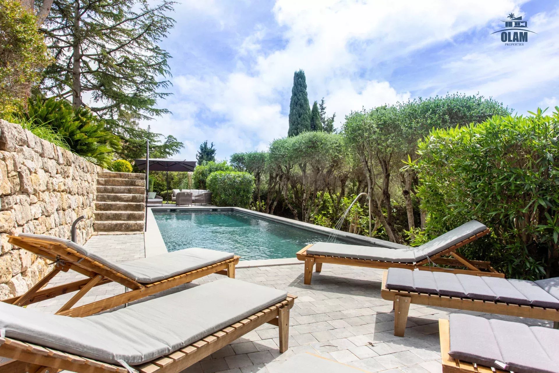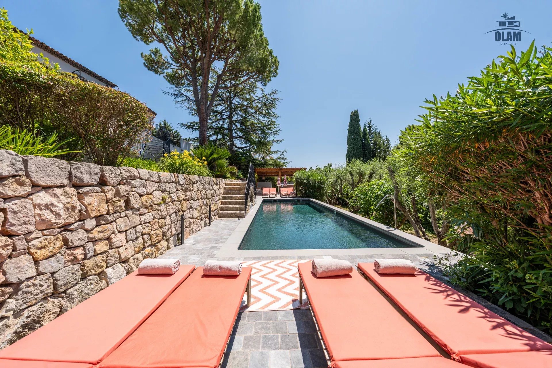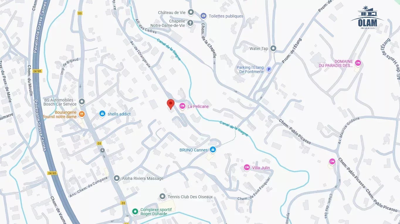 Dans un domaine privé, à proximité du village de Mougins (3mn en voiture), villa d’environ 250m2 composée comme suit :