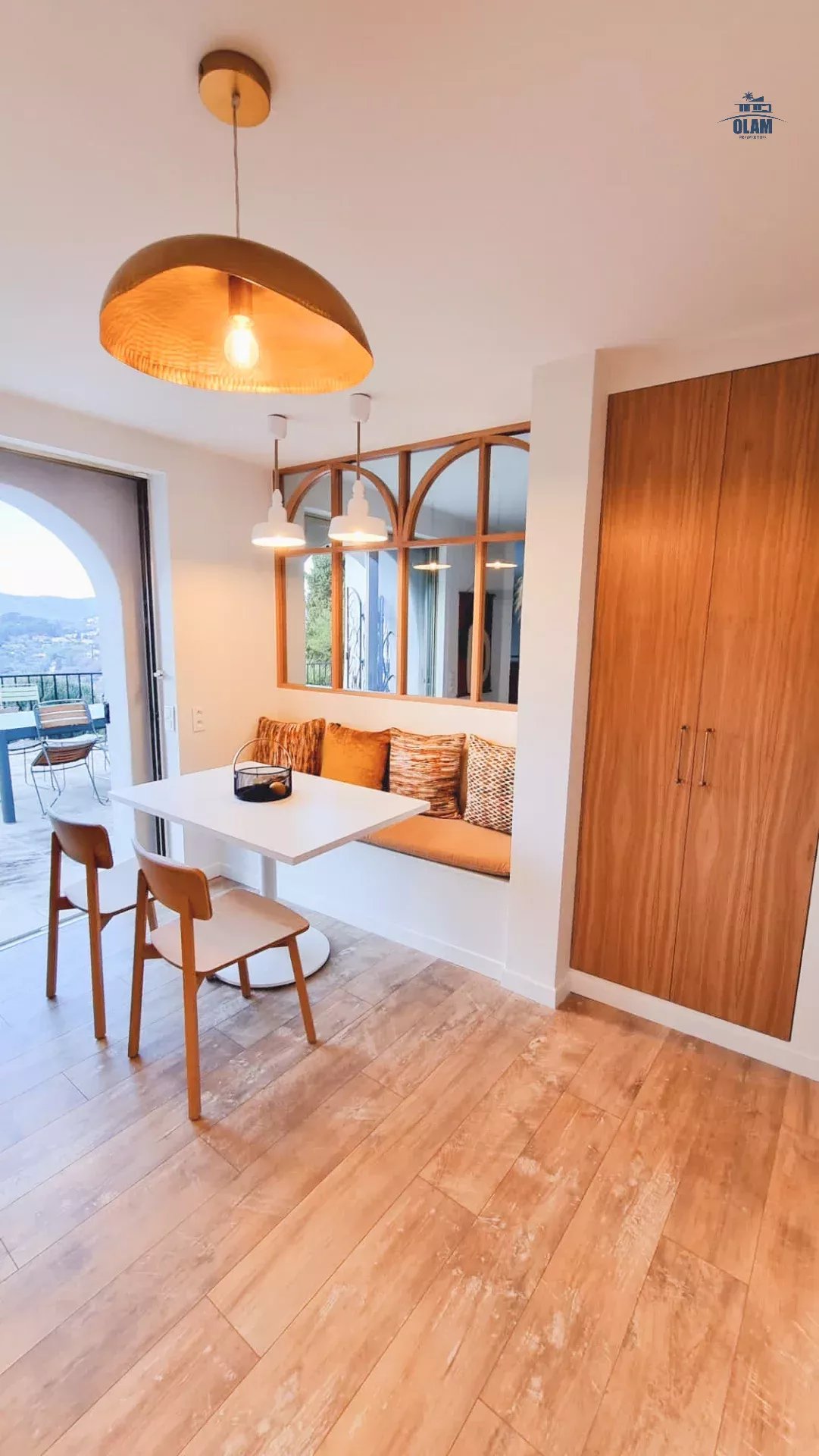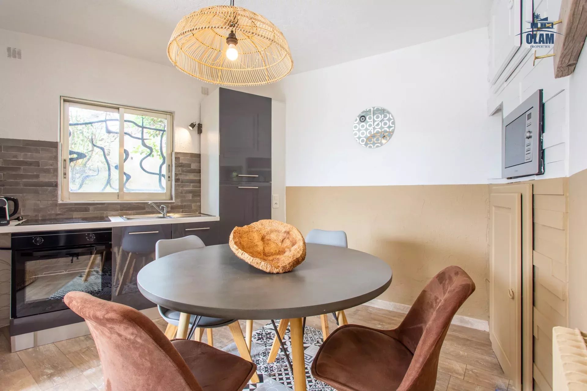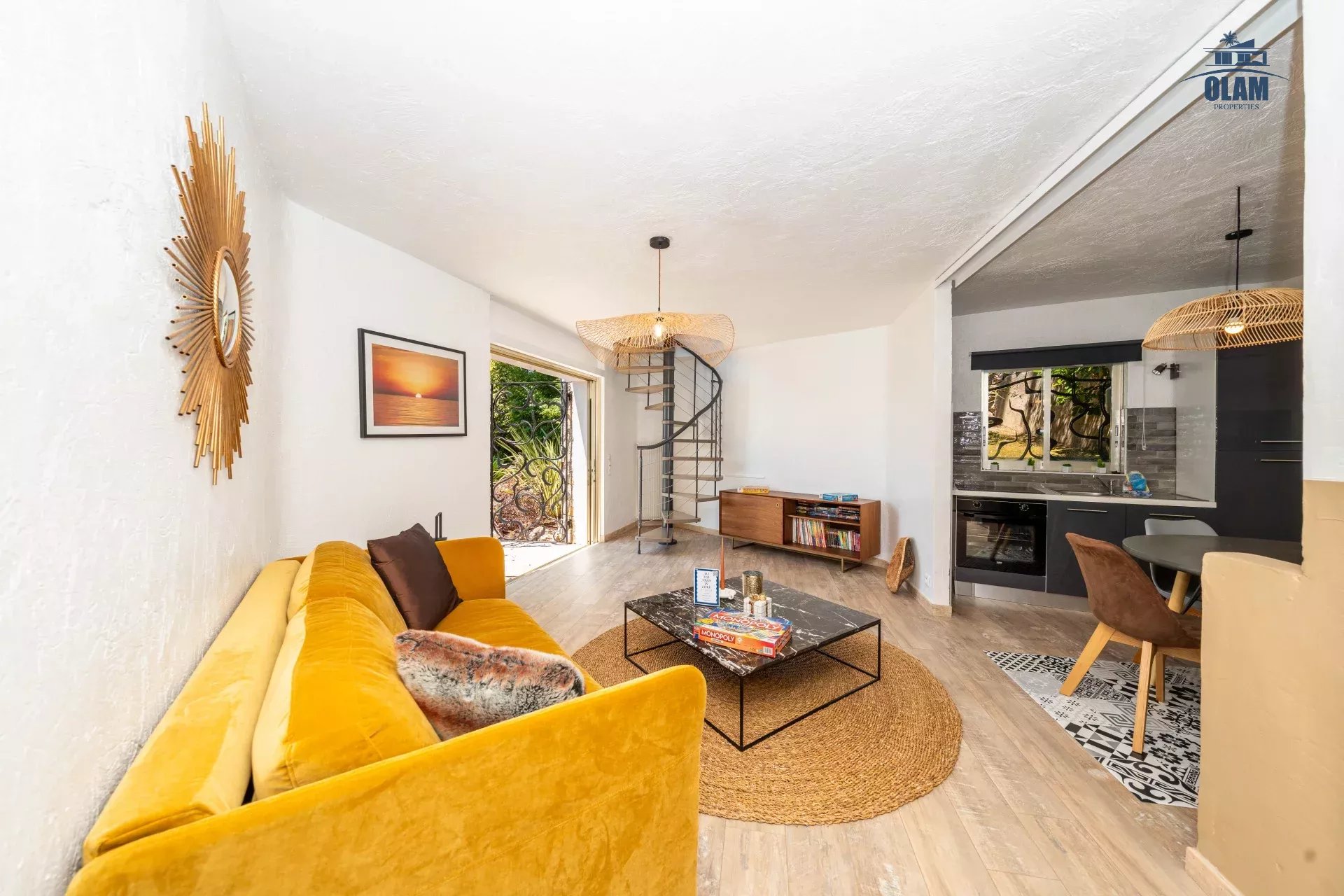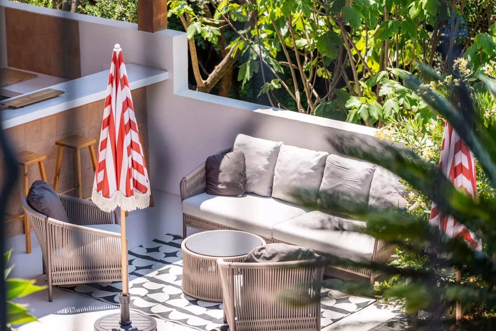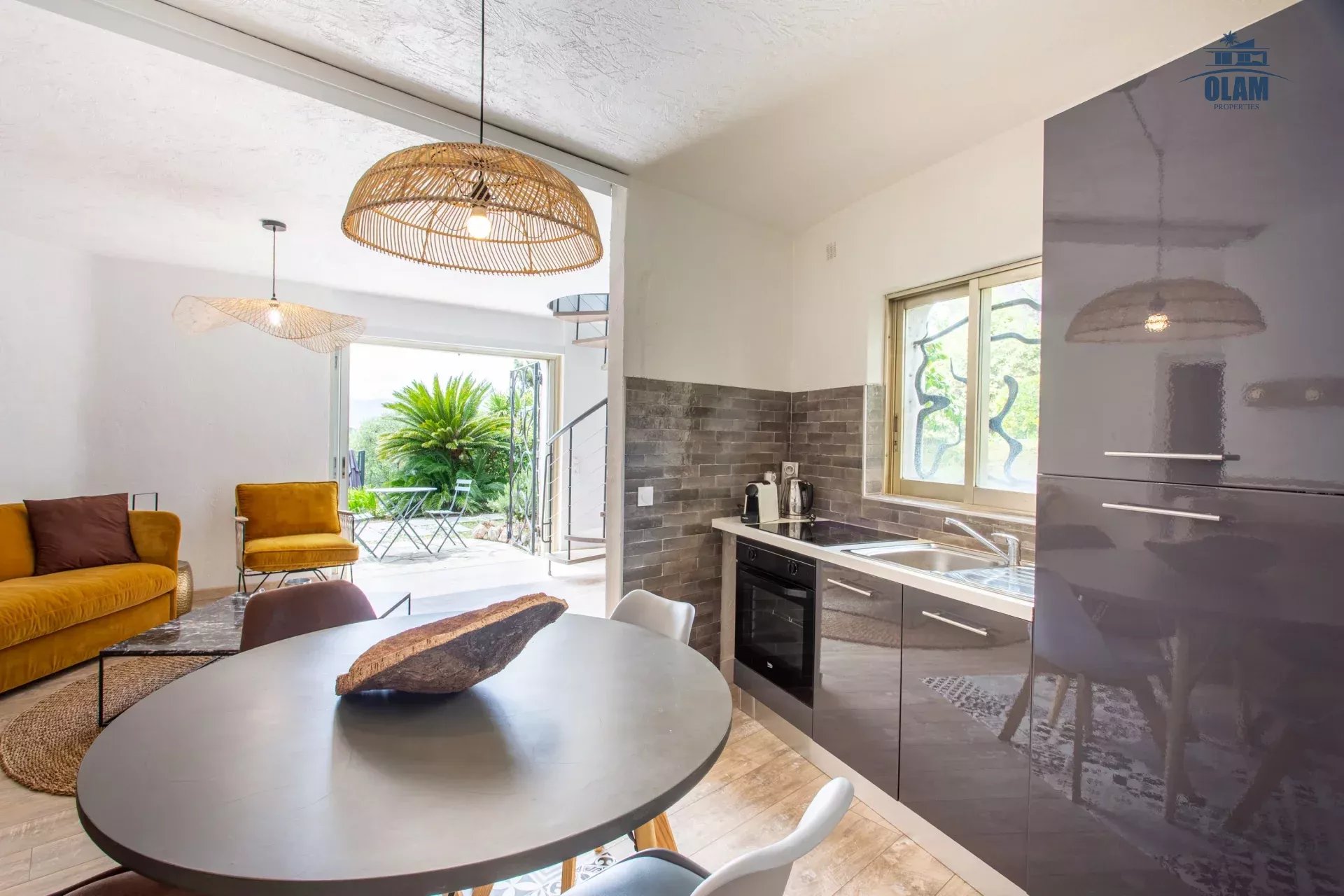 Toujours à ce niveau à l’extérieur se trouve une grande terrasse, un espace pour les repas et un jacuzzi.