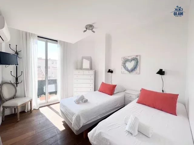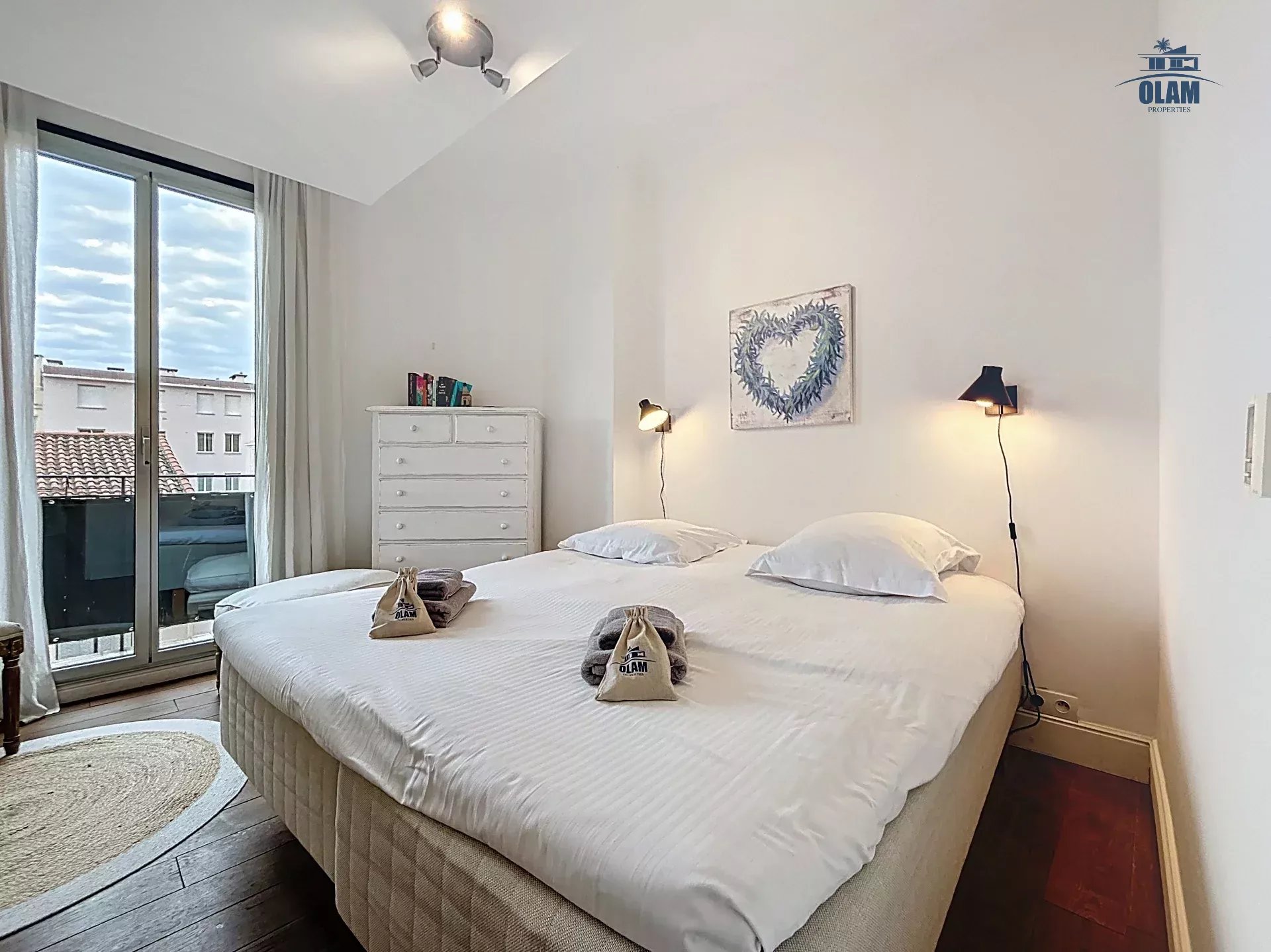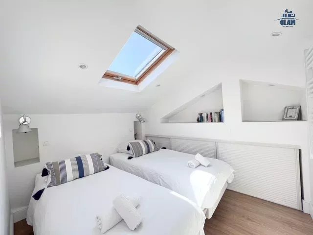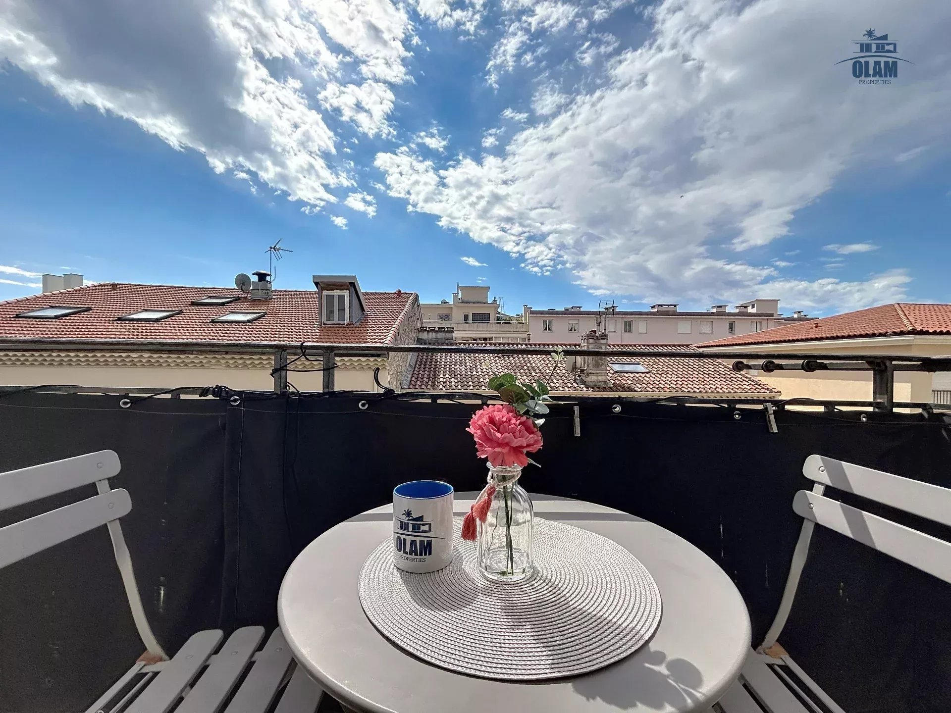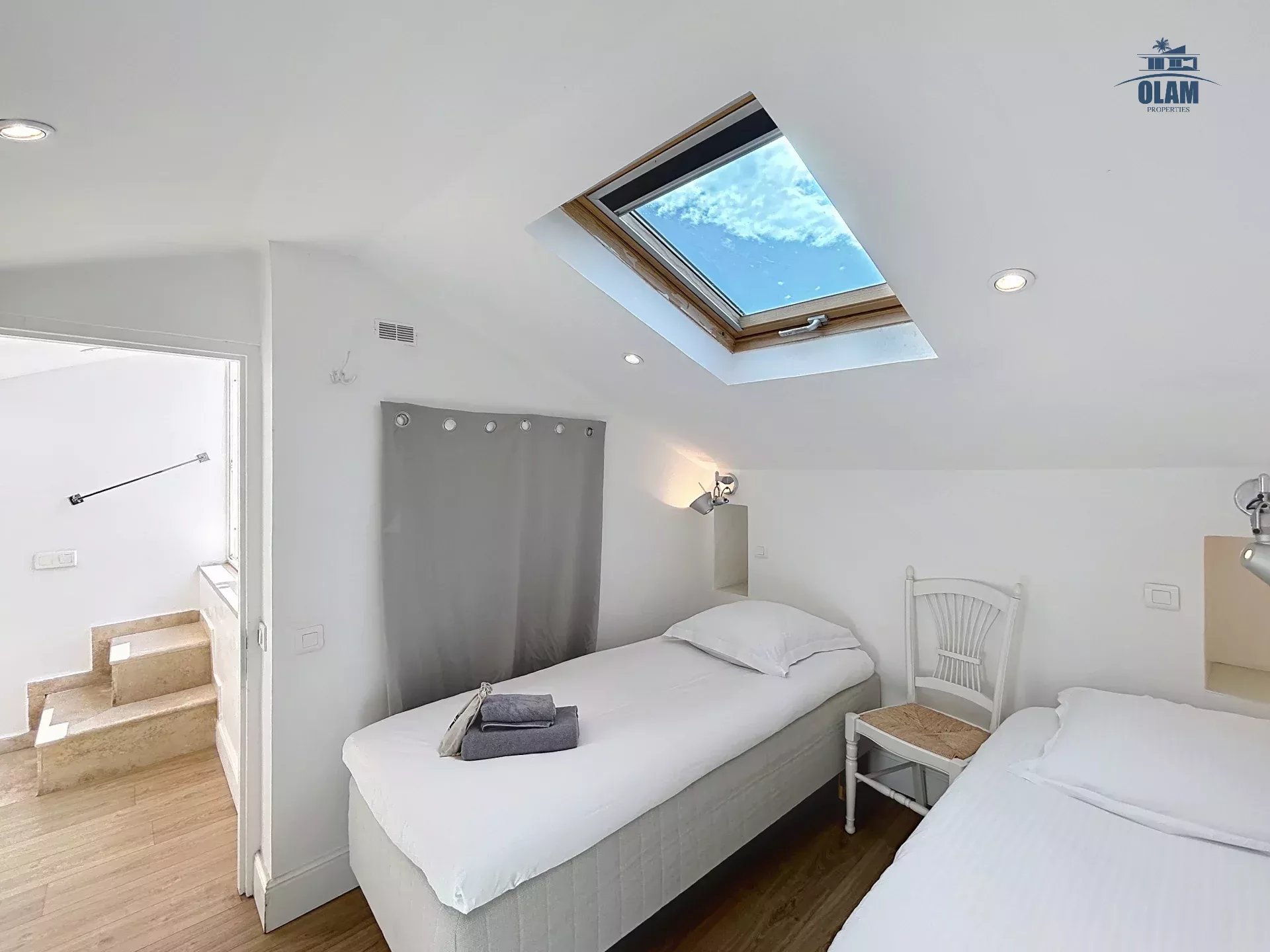 Au 2e niveau : une chambre avec 2 lits simples ou 1 grand lit, salle de bain avec baignoire (attention aux grands gabarits, les plafonds sont bas), terrasse tropezienne avec vue dégagée sur la baie de Cannes et une jolie table pour 2/3 personnes.