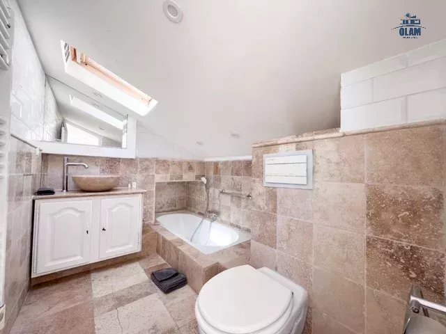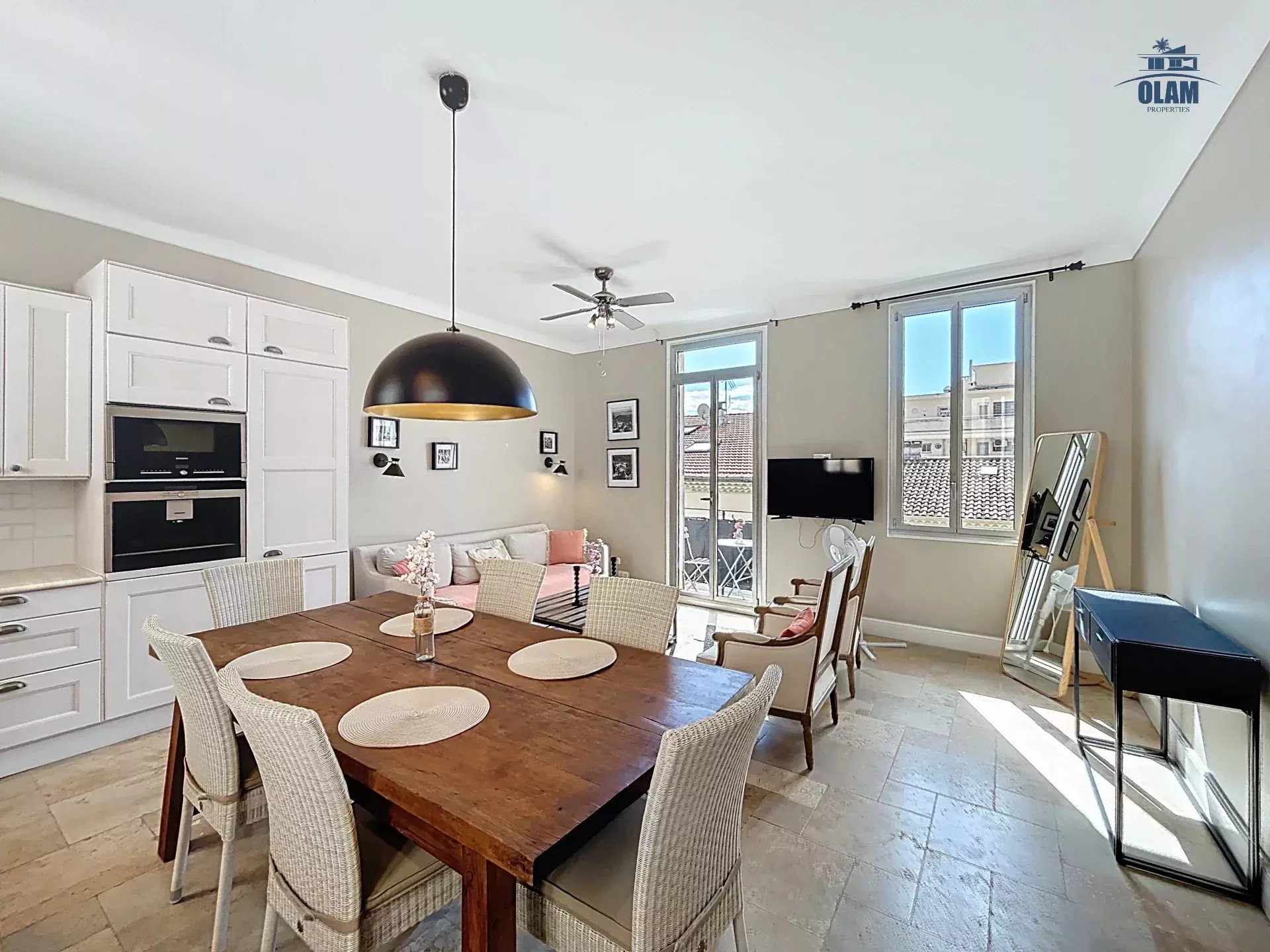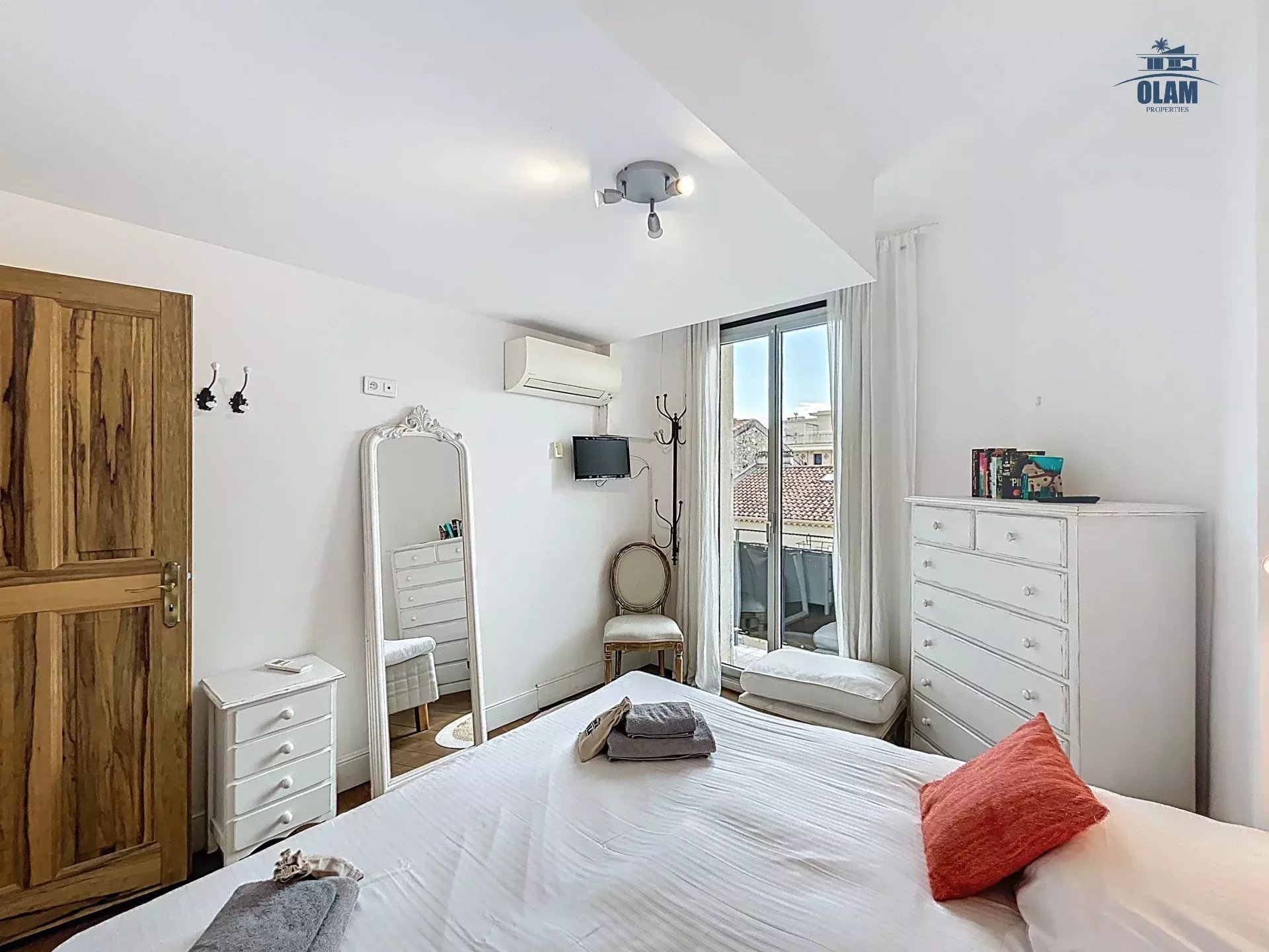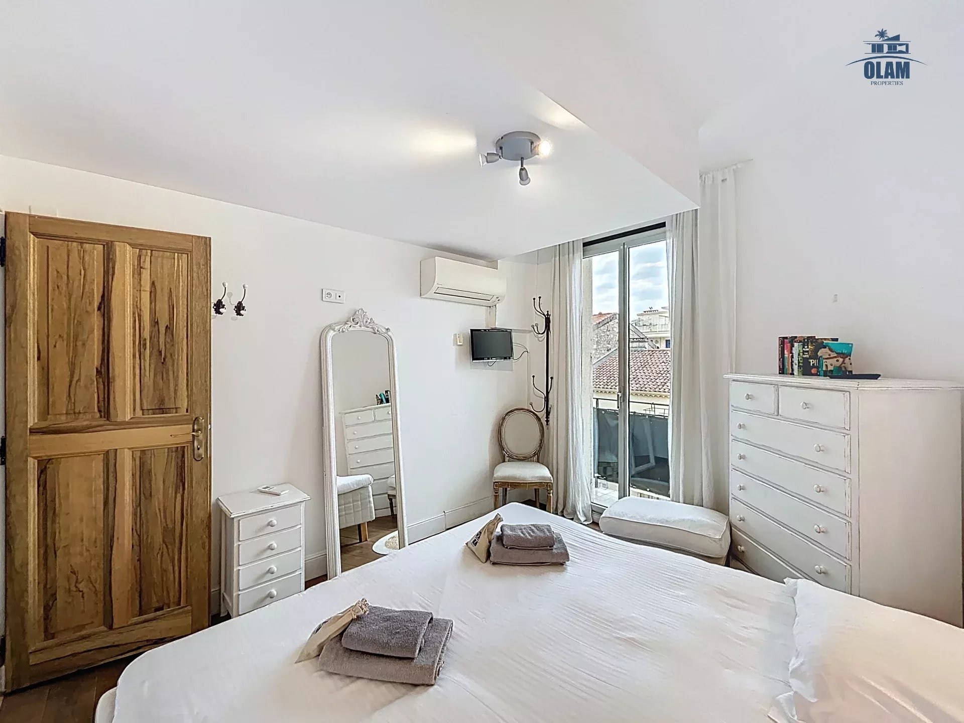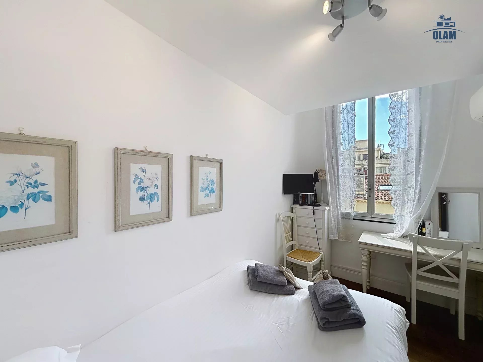 Au 2e niveau : une chambre avec 2 lits simples ou 1 grand lit, salle de bain avec baignoire (attention aux grands gabarits, les plafonds sont bas), terrasse tropezienne avec vue dégagée sur la baie de Cannes et une jolie table pour 2/3 personnes.