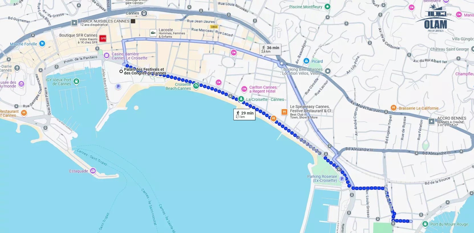 Plusieurs lignes de Bus desservent le quartier, vous aurez besoin d'environ 10 mn pour vous rendre au Palais des festivals.