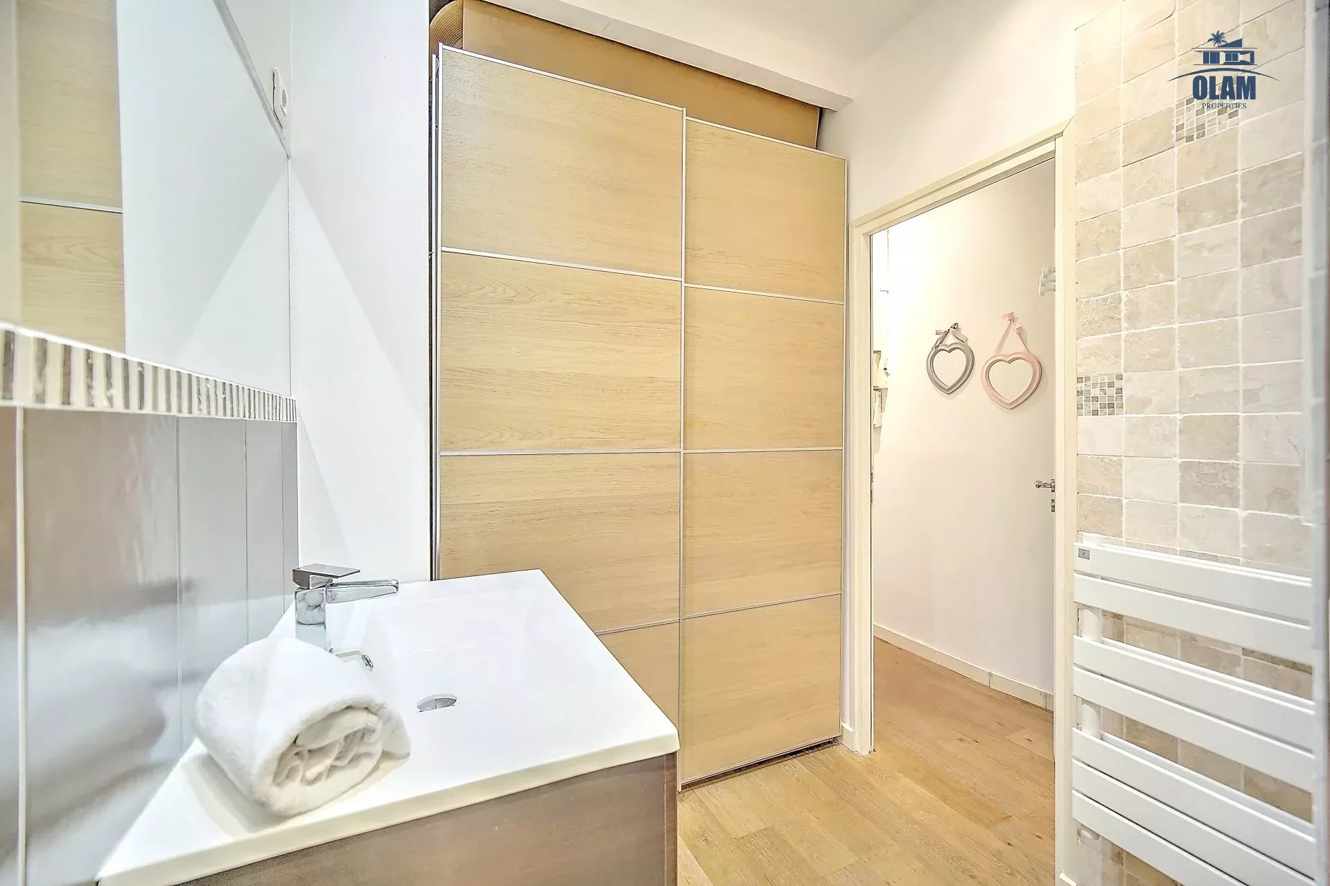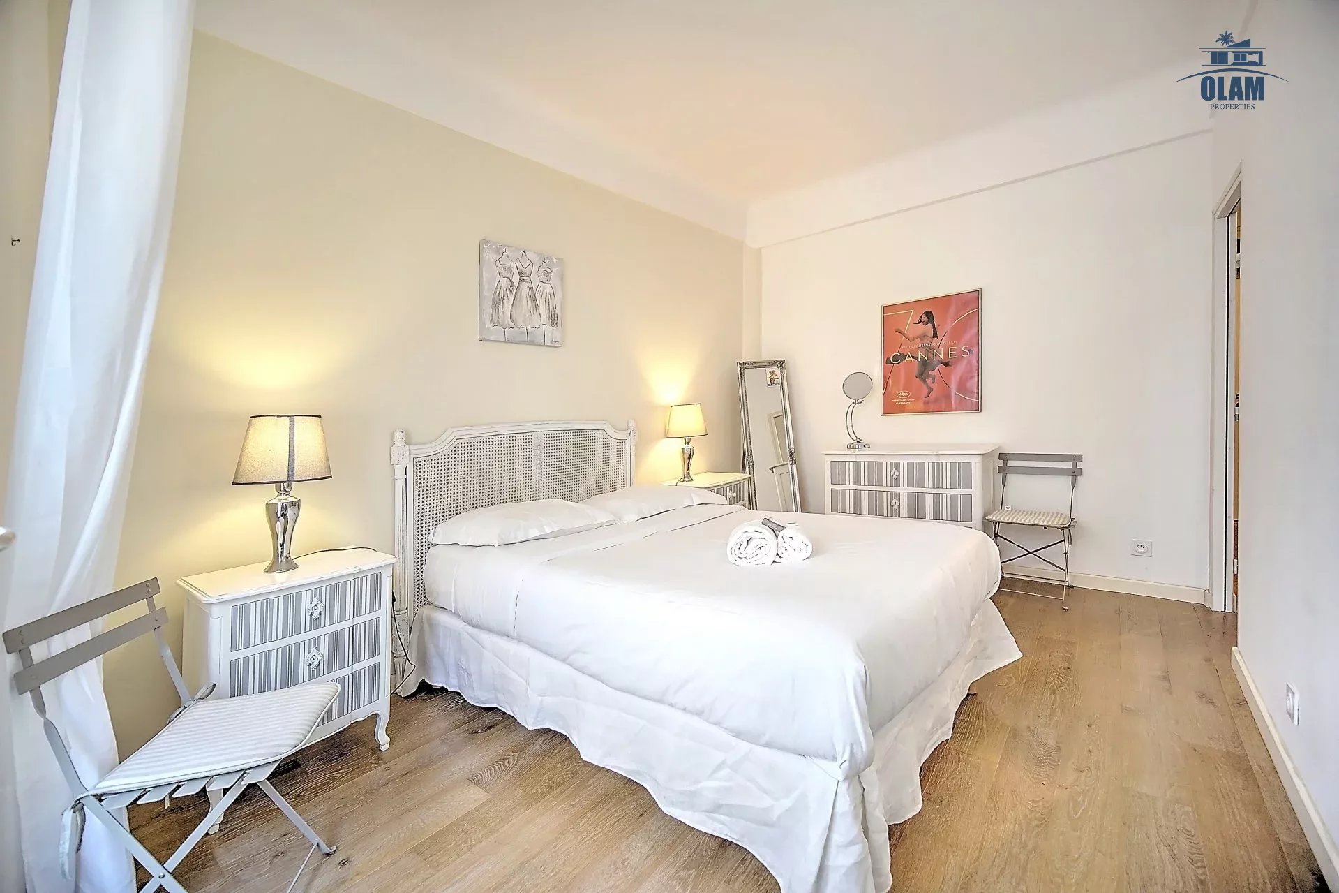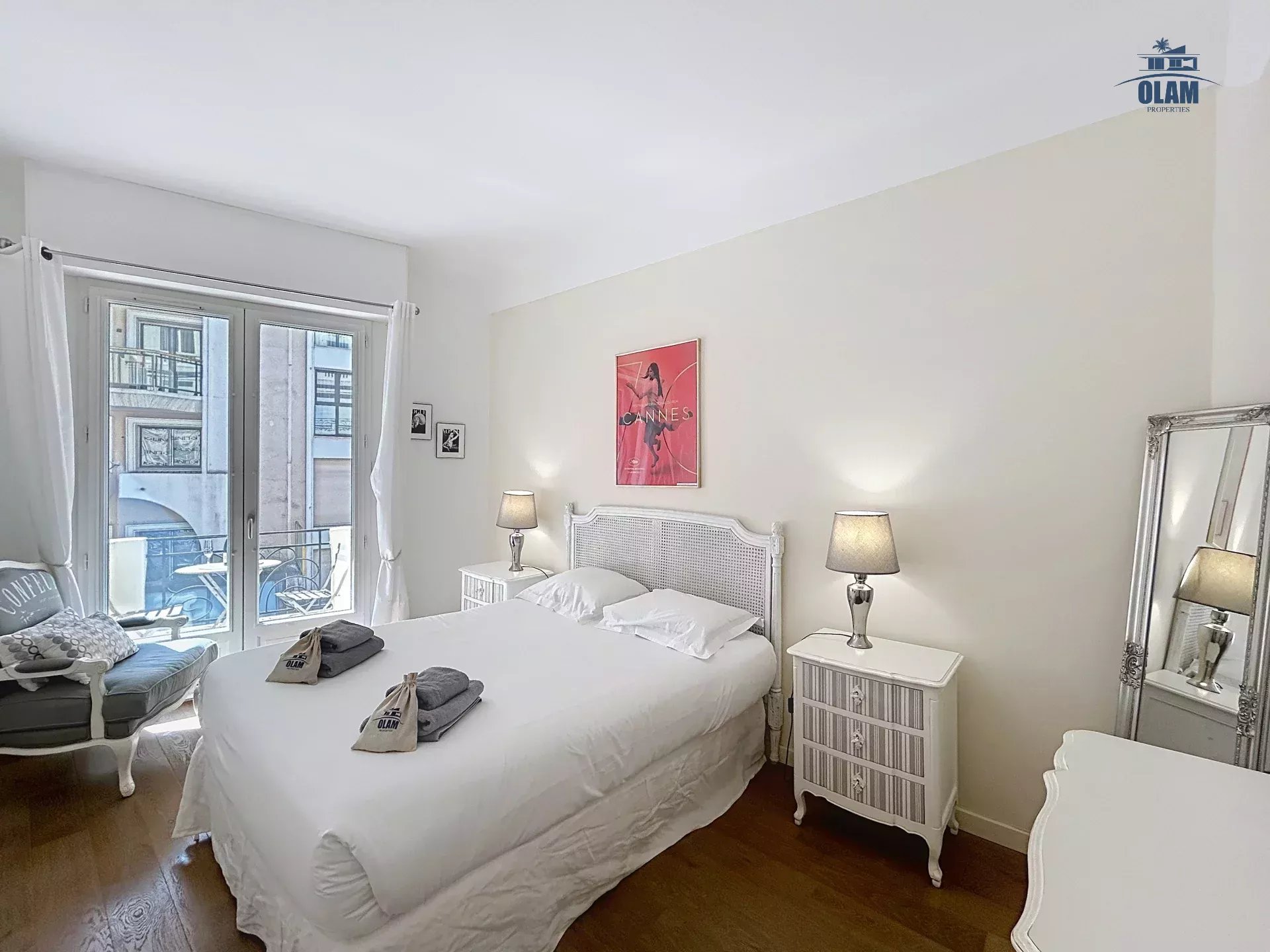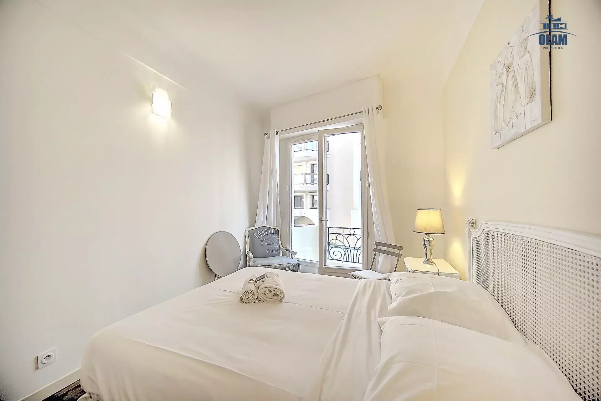 La chambre offre un grand lit double, à côté une salle de douche. Il est possible uniquement sur demande d'avoir un lit d'appoint dans le séjour (matelas). Le bien se situant dans un quartier animé de Cannes, il dispose du triple vitrage.