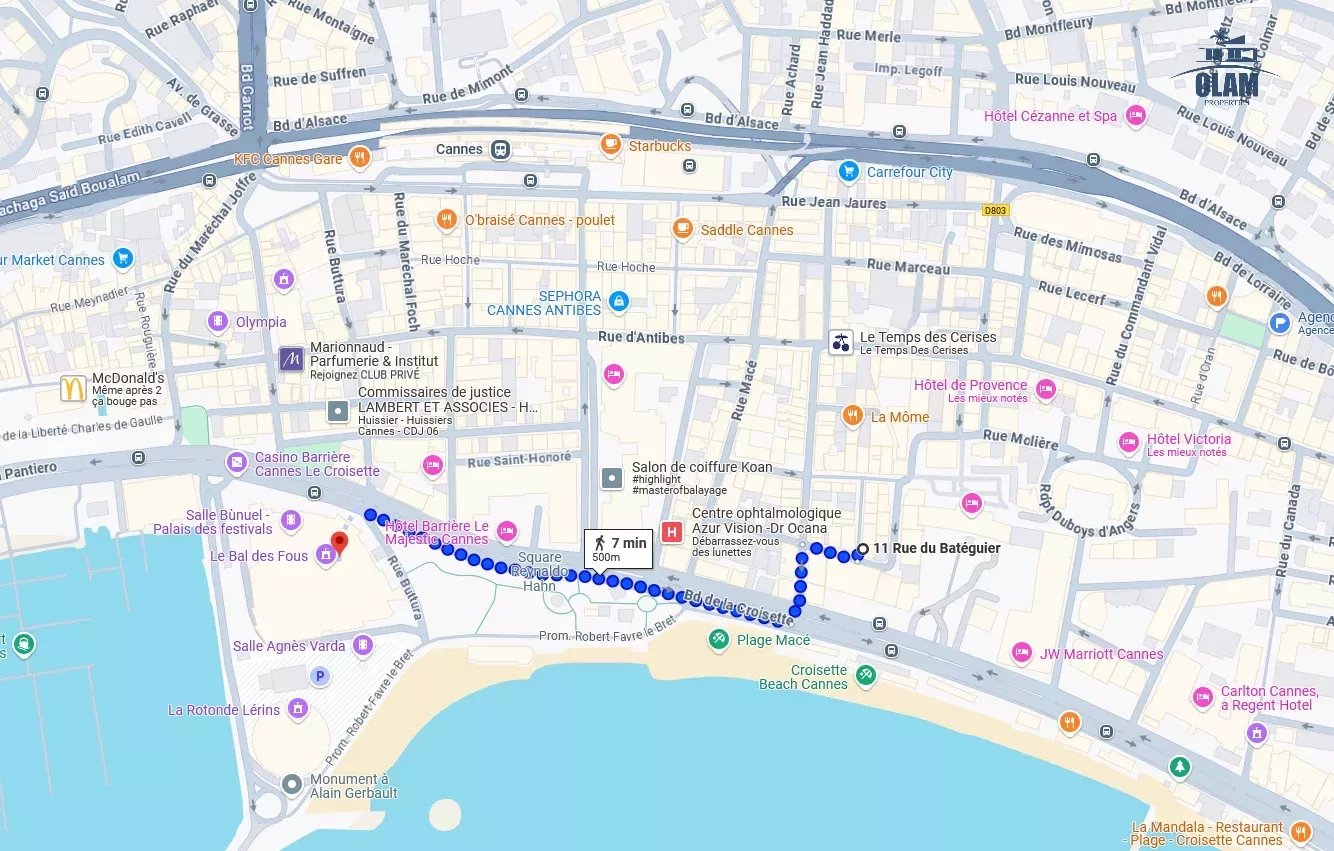 De part sa localisation au coeur du centre-ville, dans le quartier branché du Carré d'Or, à quelques mètres de la plage, tous les commerces sont à proximité. Vous pourrez découvrir la ville à pied puisque vous êtes à quelques de mètres de la rue commerçante principale, la rue d’Antibes. A quelques pas, vous serez sur la célèbre Croisette, la gare des trains ou encore de la rue des restaurants rue Hoche. Rendez-vous sur l'un des marchés provençaux Gambetta et Forville pour vous imprégner de l'authenticité de la ville. Non loin, partez à la rencontre des pêcheurs du Vieux port en passant par les charmantes ruelles de la vieille ville, de la rue piétonne Meynadier, et du Suquet qui sont proches.