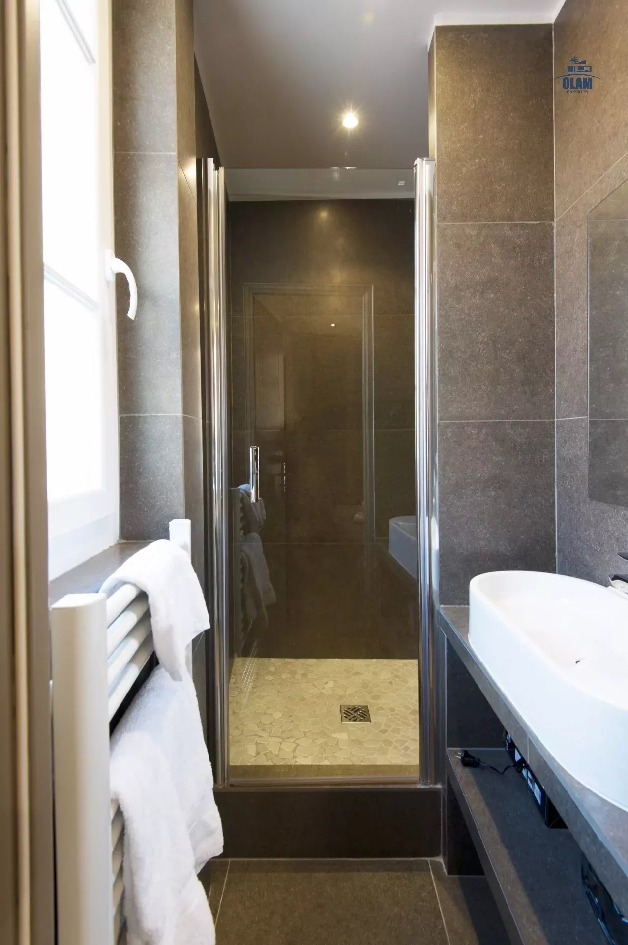 Chaque chambre a sa propre salle-de-bain avec douche. L'une d'elle a également un toilette séparé. Des toilettes invités sont aussi disponibles.