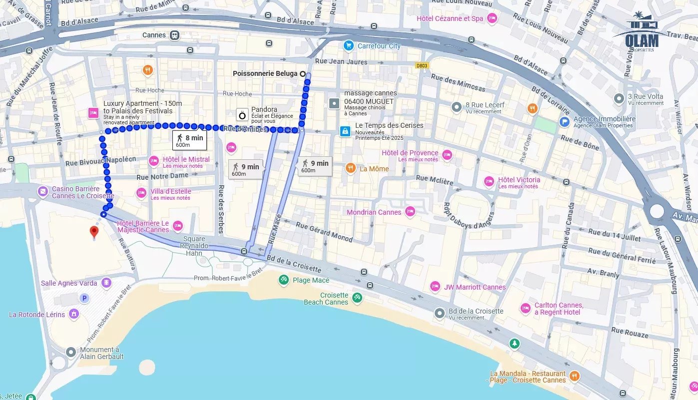 Le logement est situé en plein coeur de Cannes, place Gambetta à 150 m de la gare SNCF, 200 m de la Croisette et environ 500 m du Palais du festival.