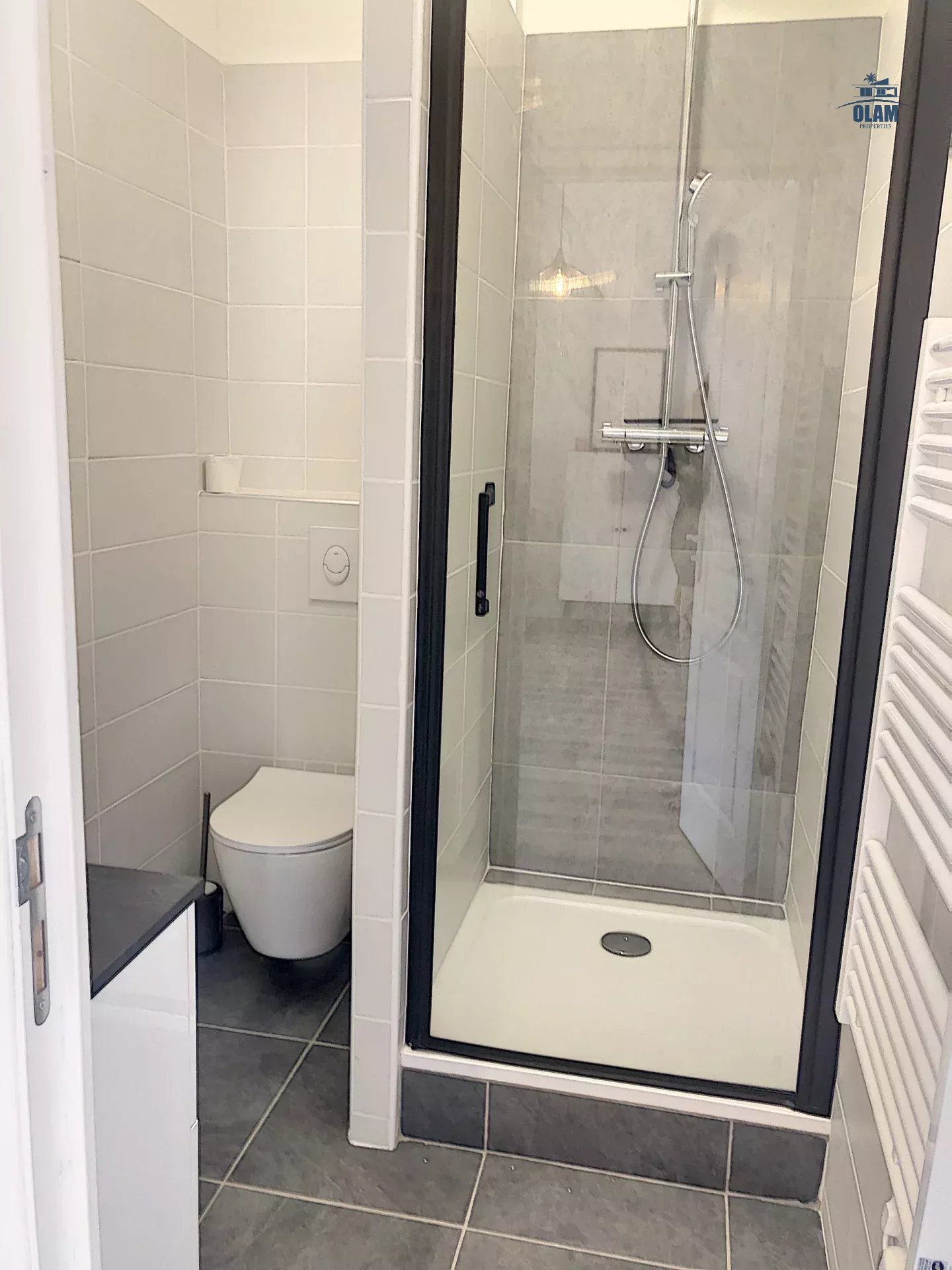 La salle de bain vous offre une belle douche avec des toilettes.