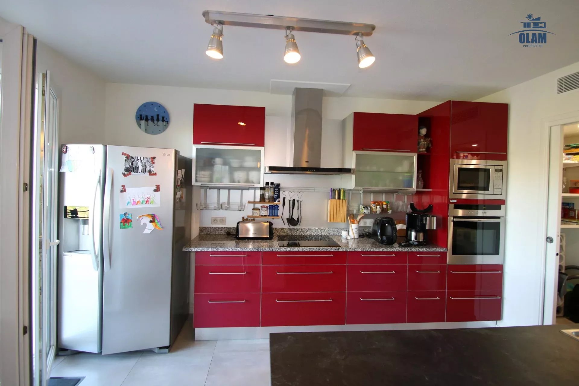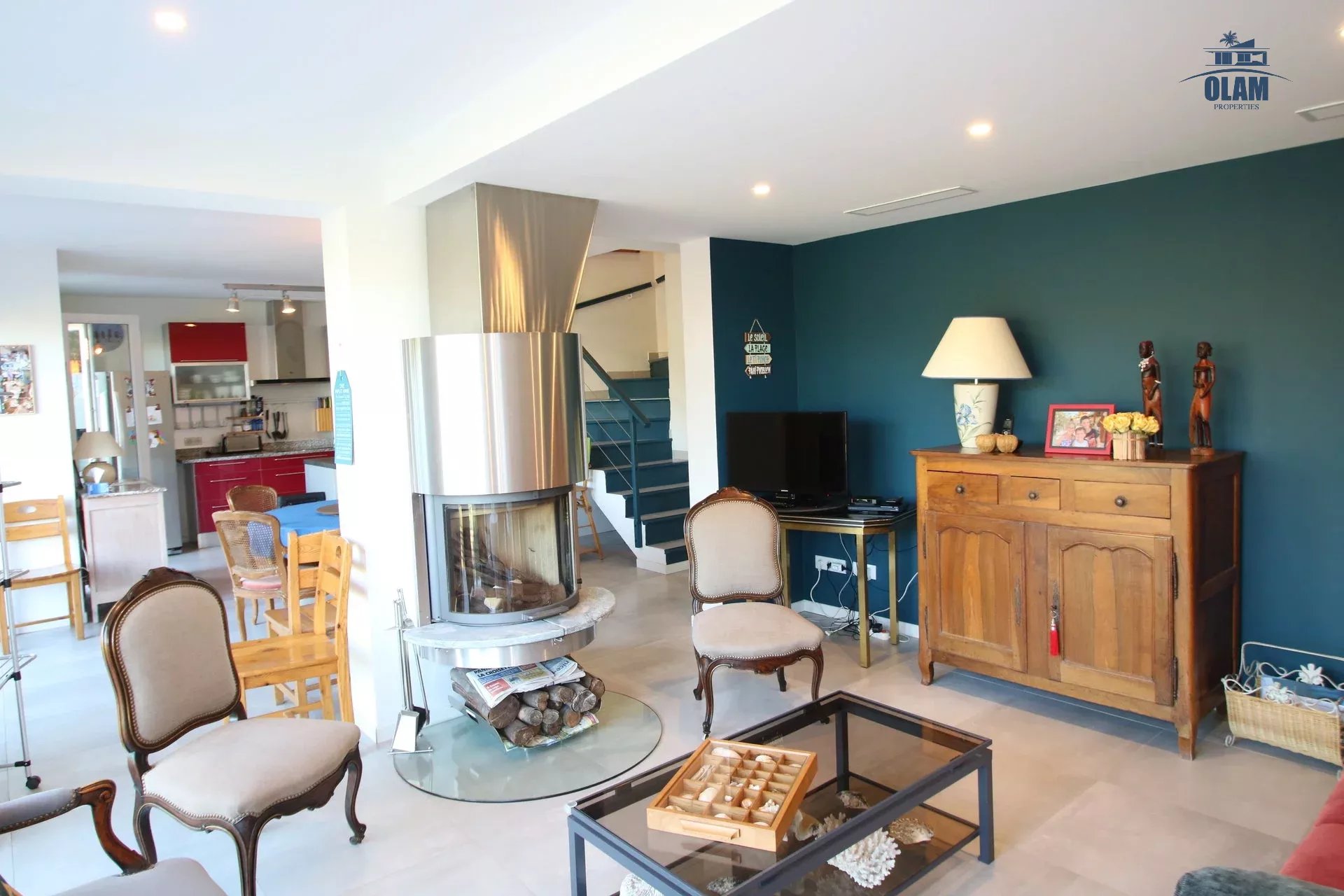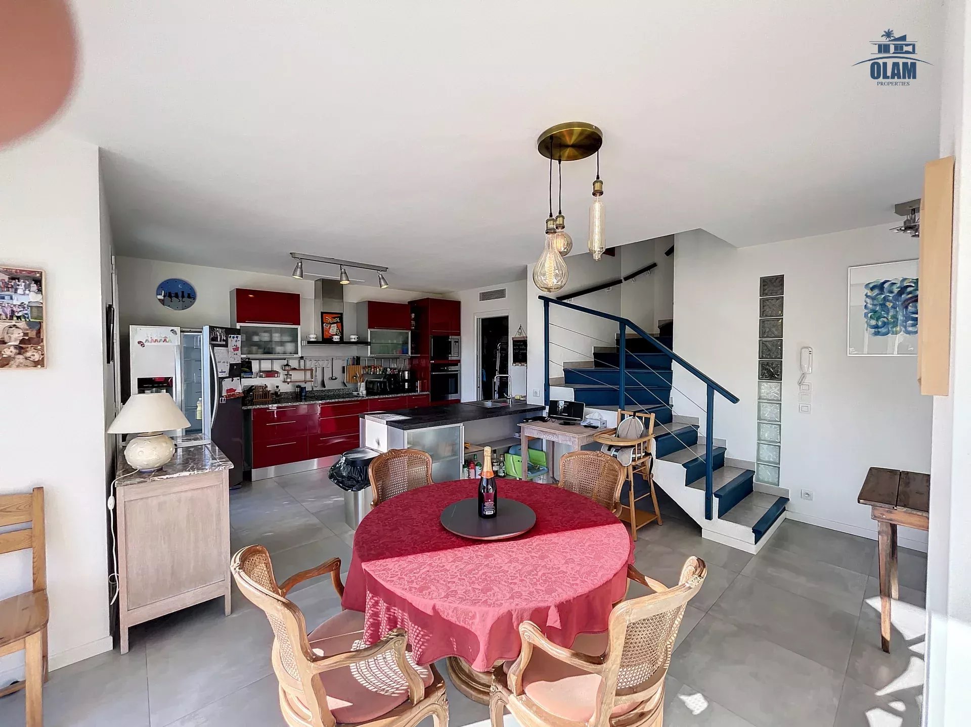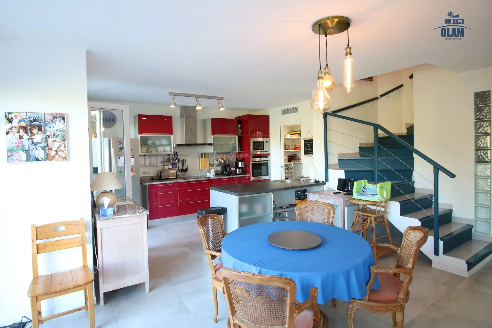 Le rez-de-chaussée se compose d'un grand et confortable séjour, disposant d'un confortable canapé convertible, d'un coin bureau et salle à manger, d'une cuisine entièrement équipée et fonctionnelle (frigo américain double, four, machine à café, lave-vaisselle...) , d'une chambre de maître avec salle de douche et un wc indépendant.
