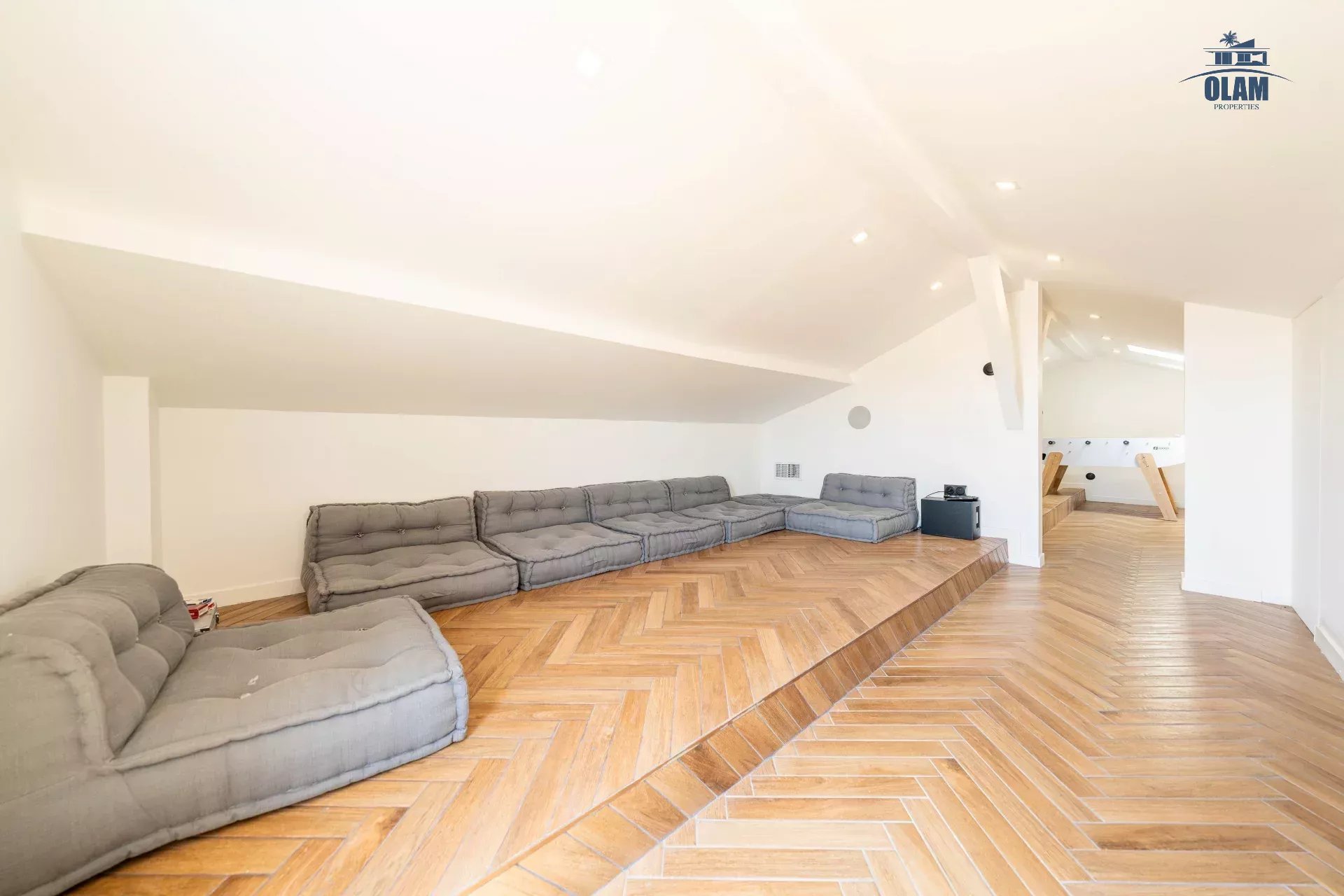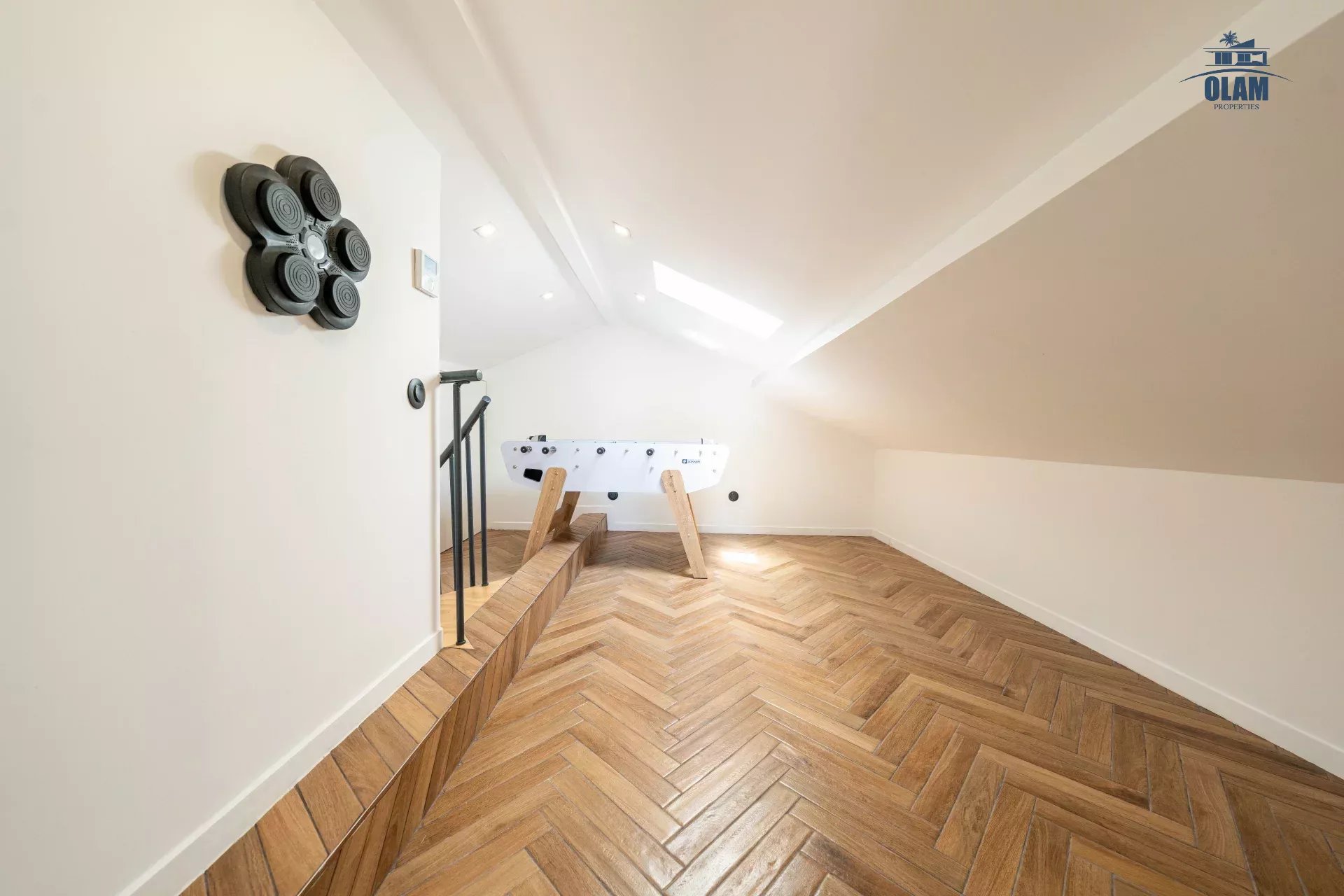 Des combles aménagés climatisés, transformés en un espace de loisirs avec babyfoot et un grand écran TV, parfait pour des moments de divertissement en famille ou entre amis.