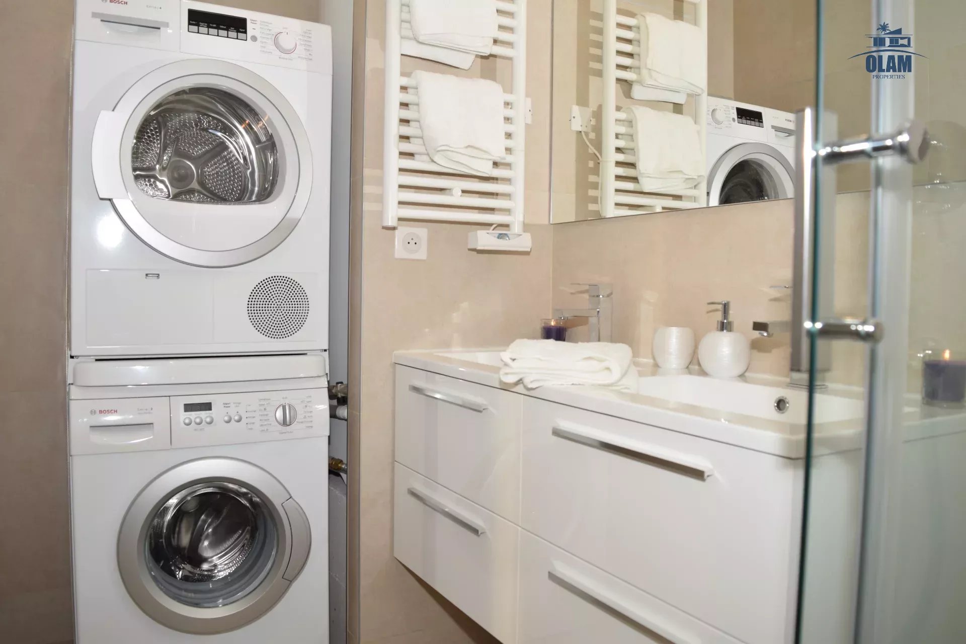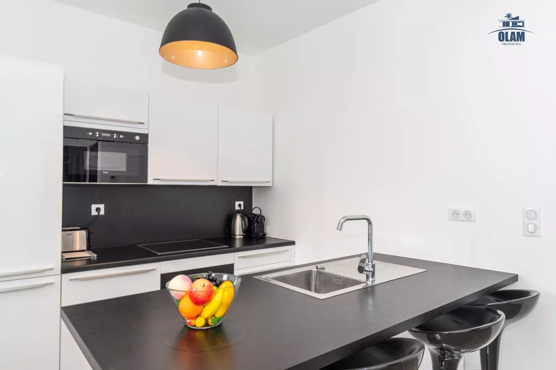 et dispose d'une cuisine américaine entièrement équipée (frigidaire et congélateur, micro ondes, machine espresso, bouilloire, lave linge et sèche linge, lave vaisselle), ouvre sur une pièce à vivre vaste et lumineuse, qui dispose d'un canapé convertible haut de gamme pour un excellent sommeil.