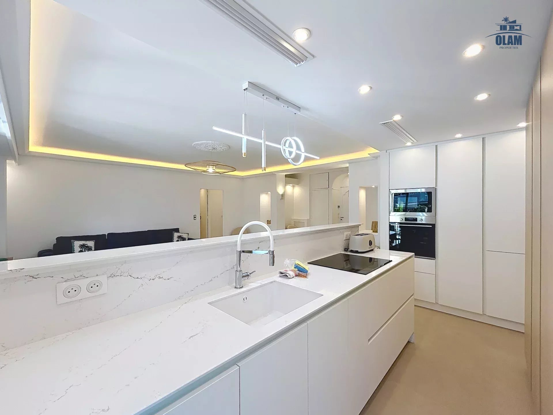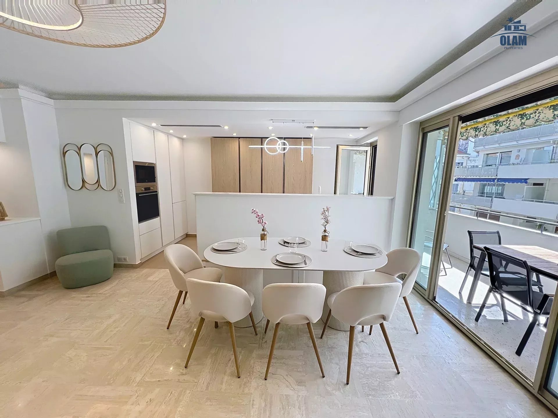 Conçu comme un véritable havre de paix au cœur de l'effervescence de Cannes, l’appartement séduit par ses volumes généreux et sa luminosité naturelle. L’espace de vie principal s’ouvre sur un vaste salon à l’atmosphère accueillante, idéal pour se relaxer après une journée de découvertes ou de rendez-vous professionnels. La configuration ouverte relie harmonieusement le salon à une grande salle à manger et à une cuisine moderne, parfaitement équipée pour répondre à toutes vos envies culinaires, des repas improvisés aux dîners plus élaborés.