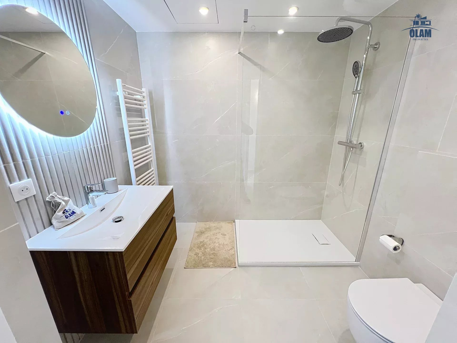 Pour votre confort, l’appartement comprend également une salle de bain contemporaine et des toilettes séparées, afin de faciliter le quotidien des séjours en famille ou entre amis.