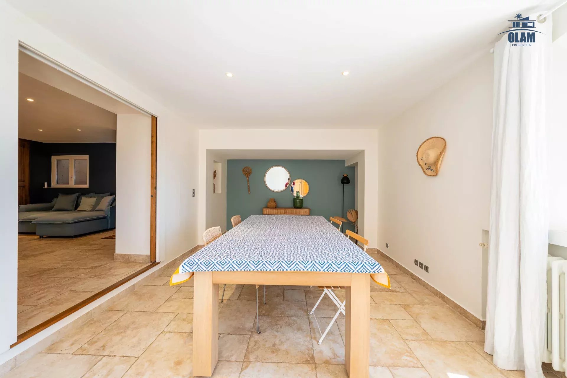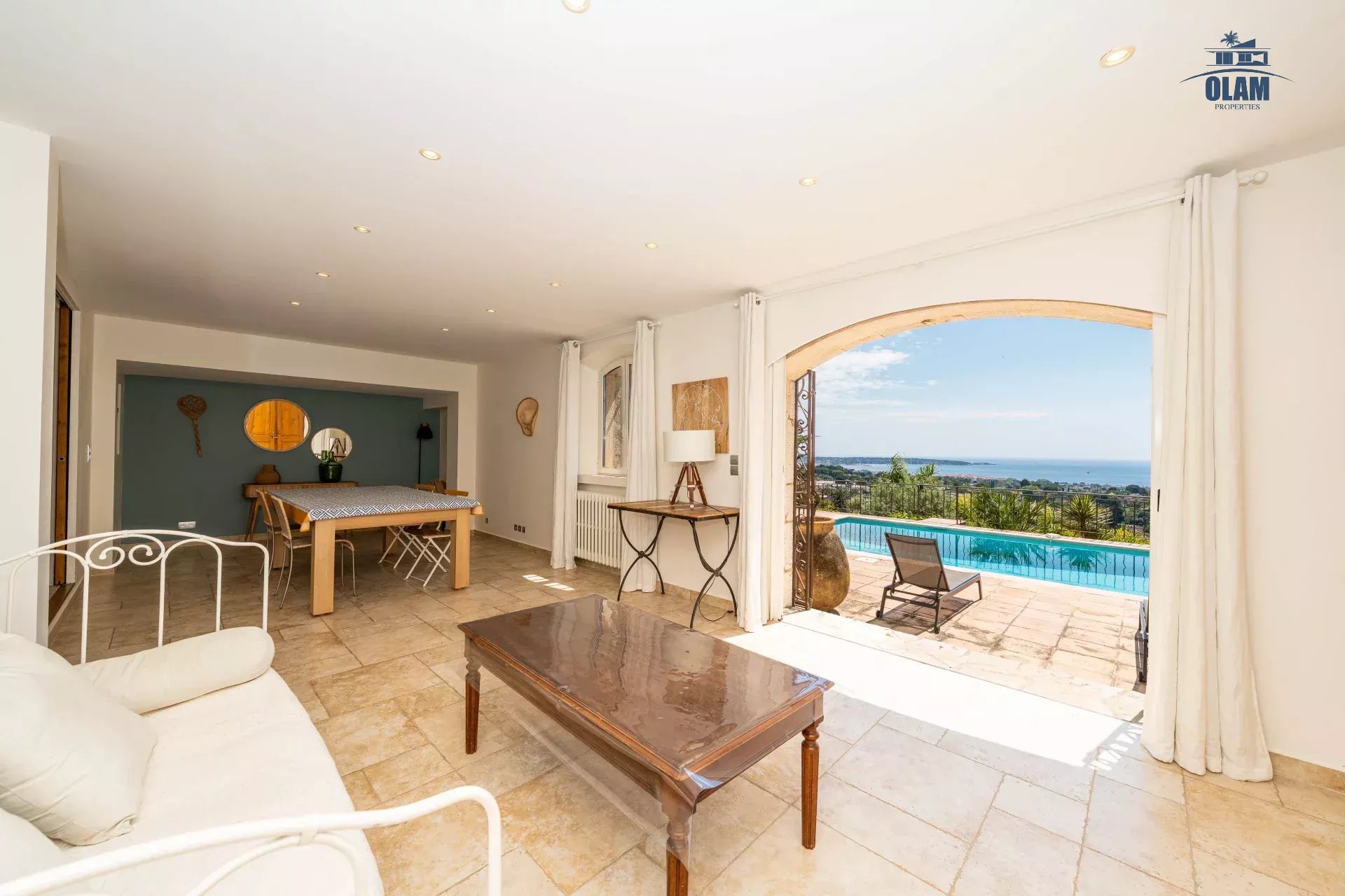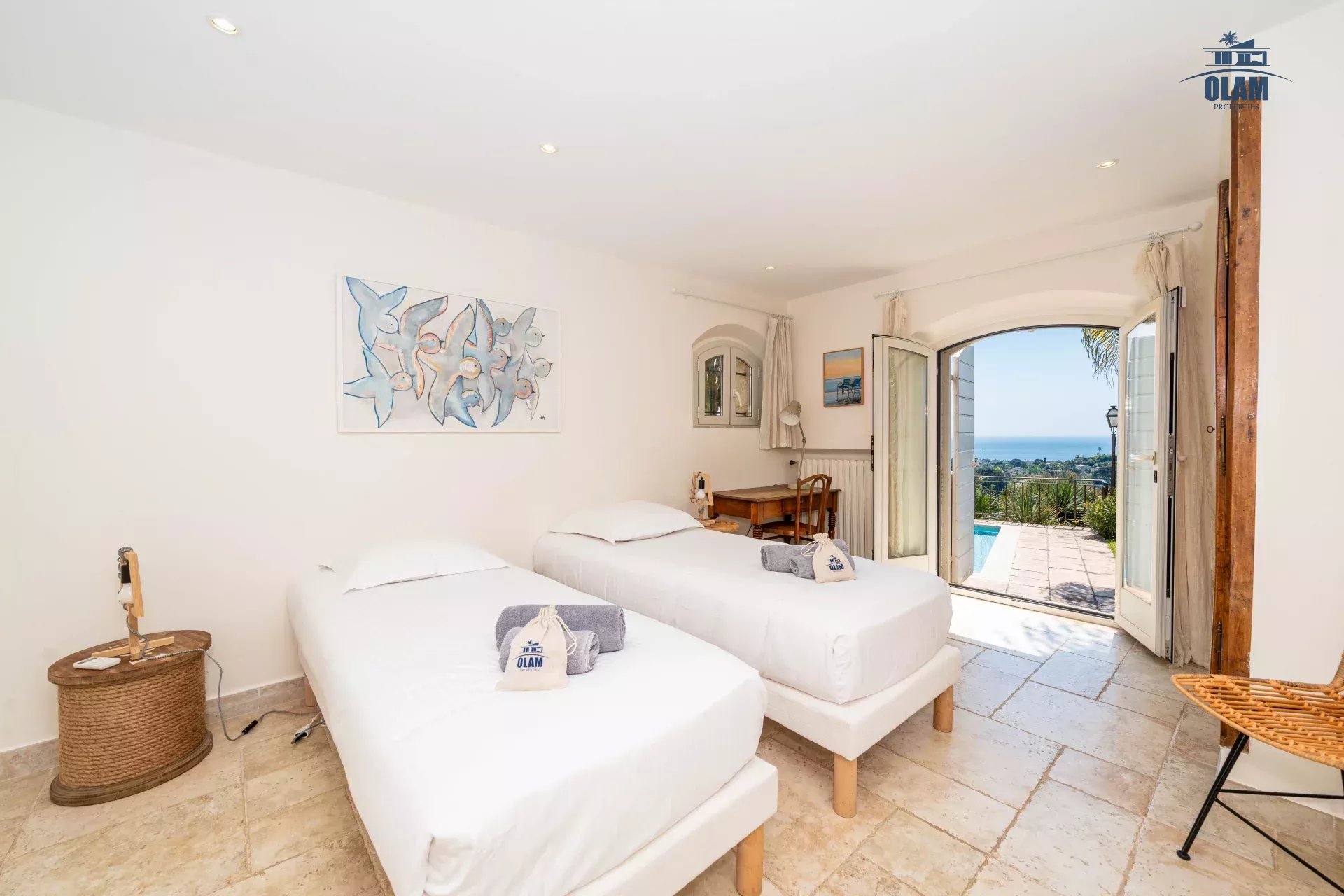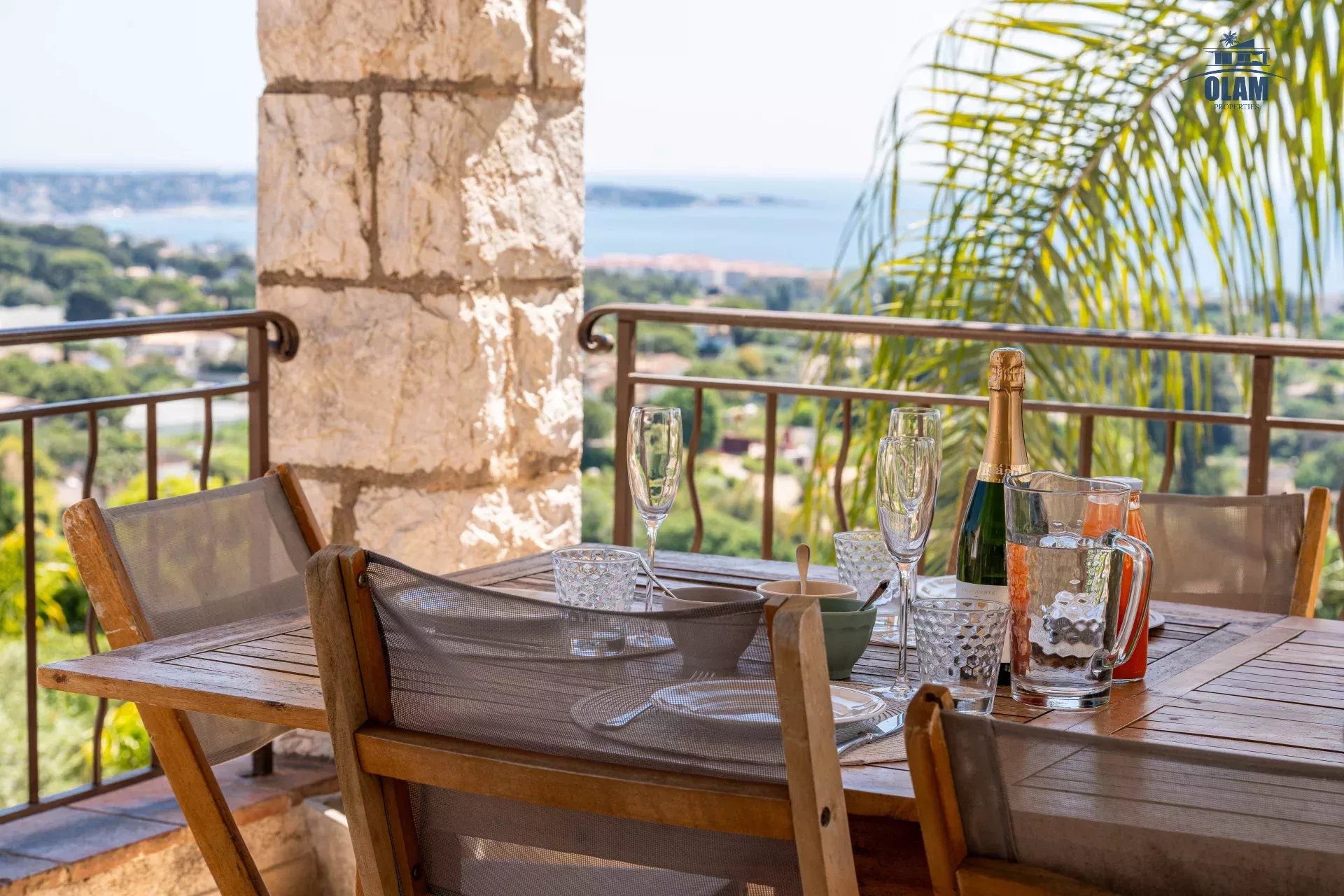 - Au rez-de-chaussée : un grand salon avec vue sur la mer, une grande cuisine toute équipée ouverte sur la salle à manger. Un hall d'entrée spacieux avec toilettes invités. Une grande chambre avec vue sur la baie d'antibes et ses 3 lits simples ou 1 grand lit puis sa salle de bain avec wc, douche et baignoire.