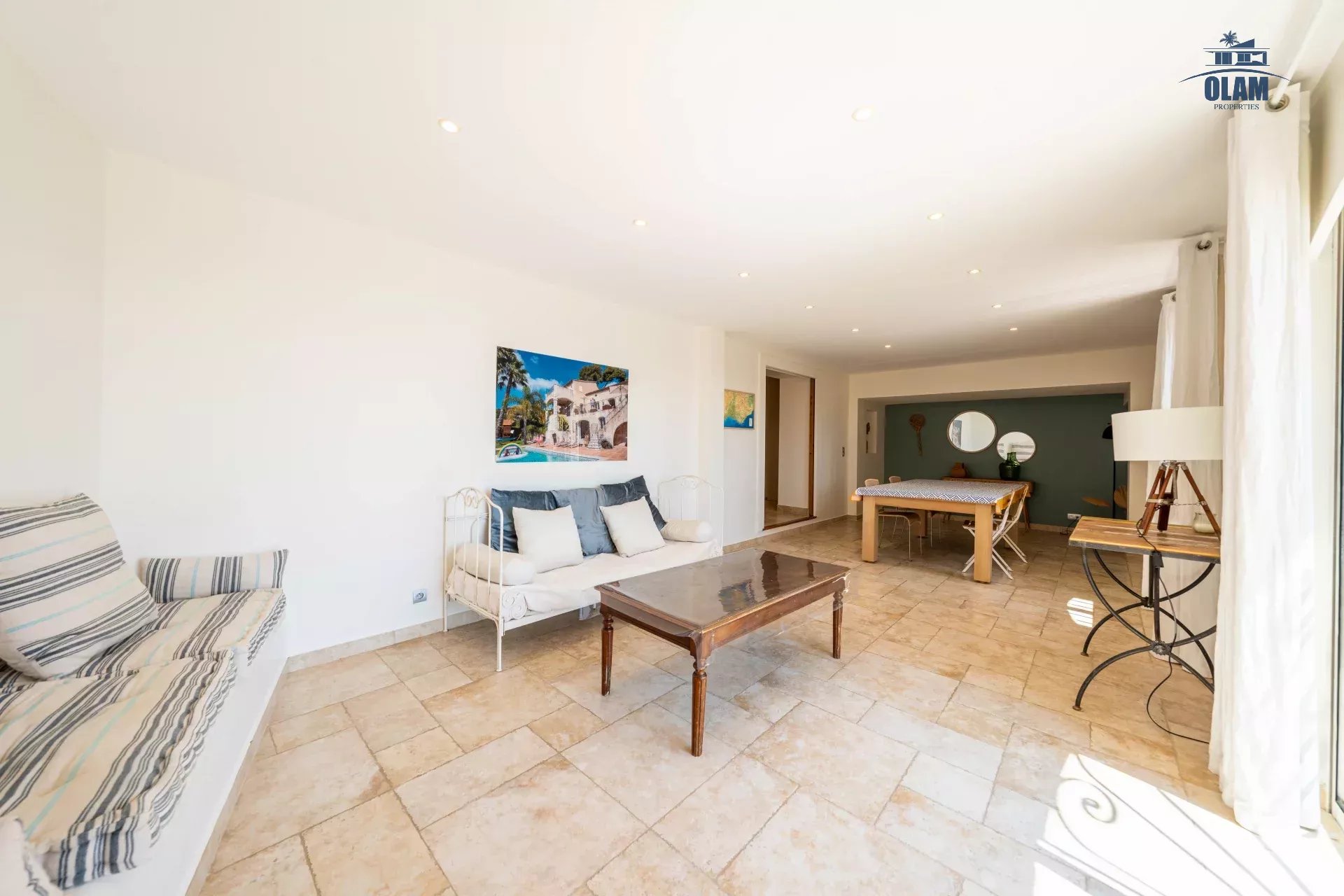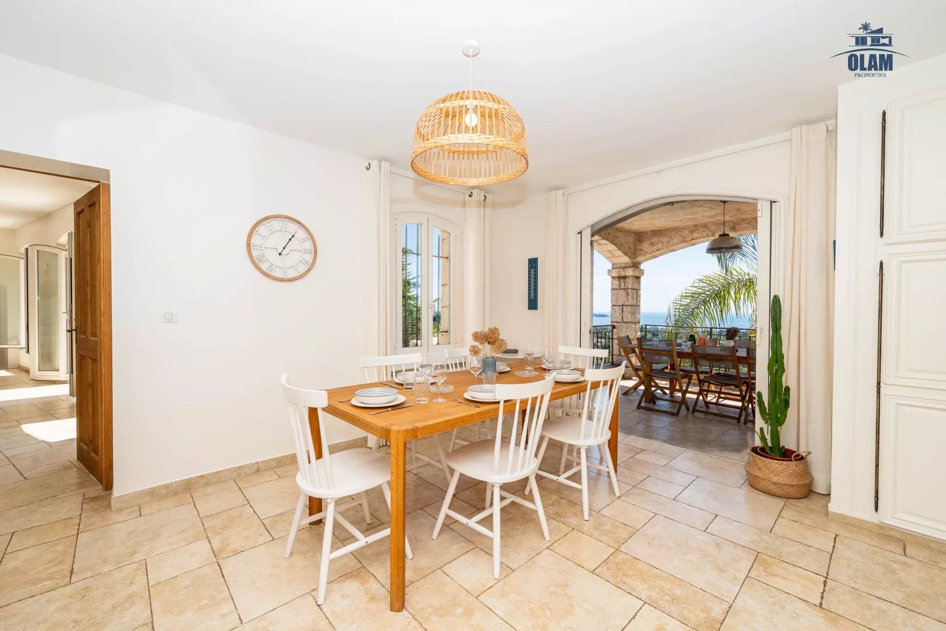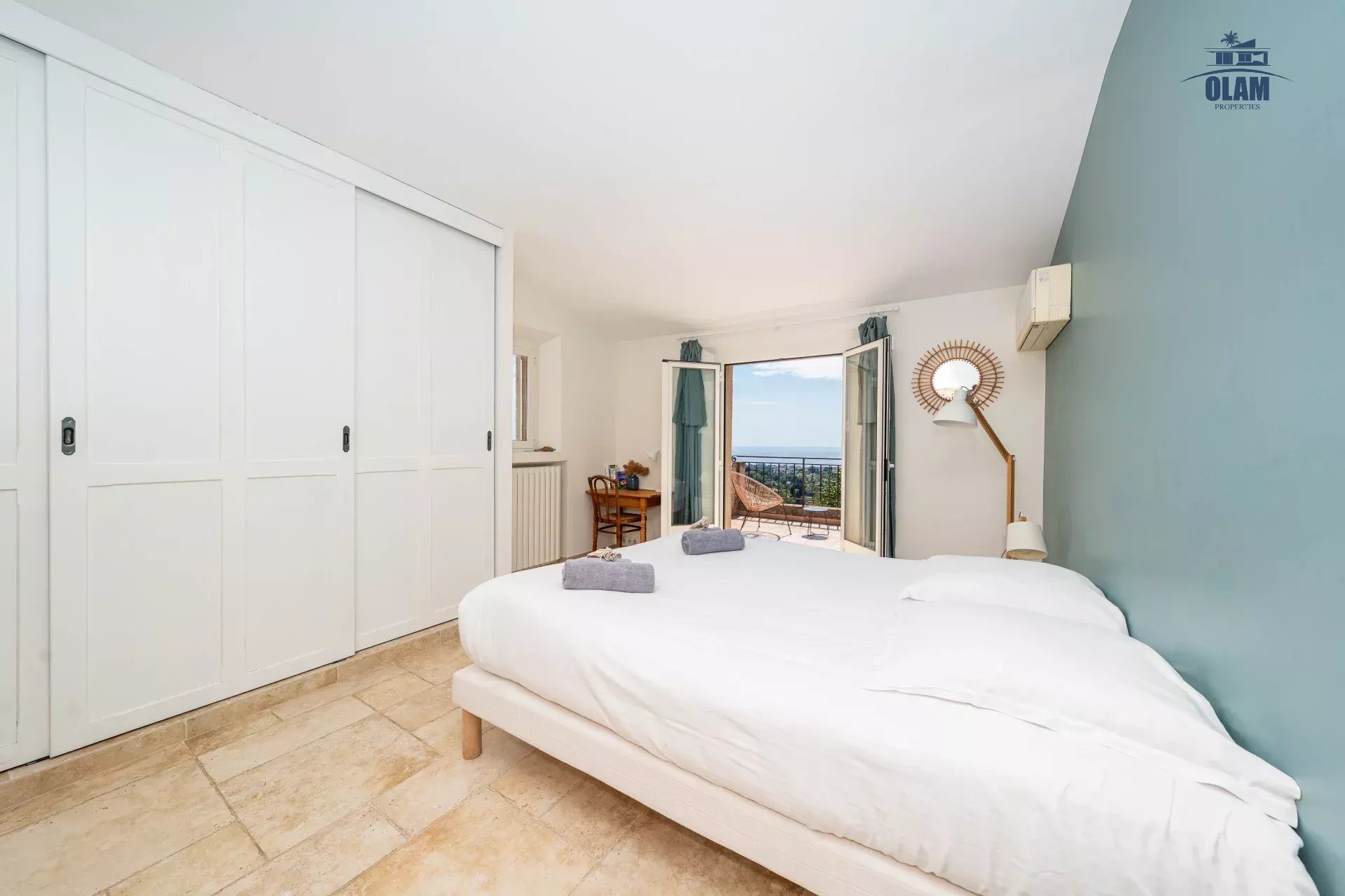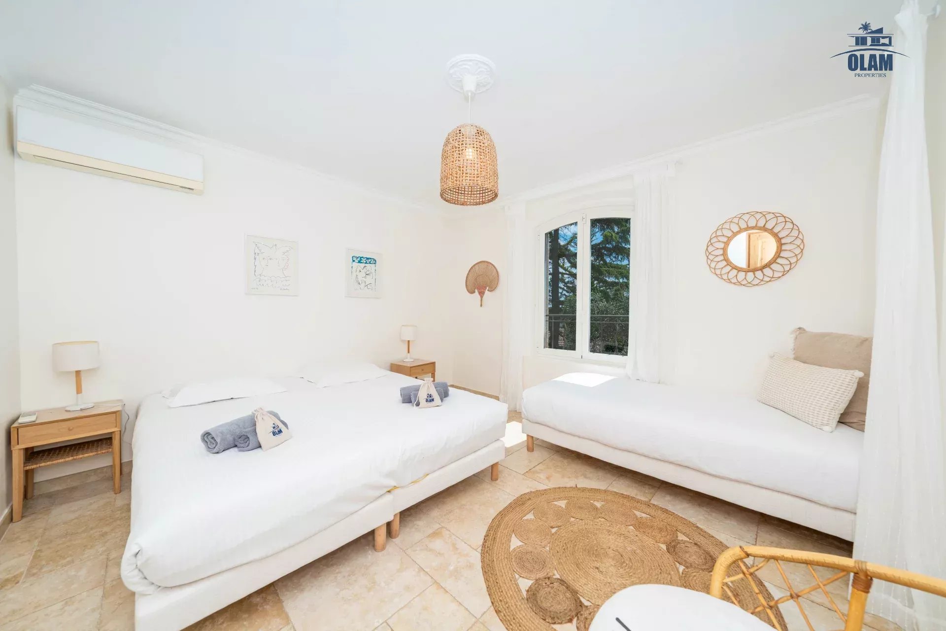 - Au rez-de-chaussée : un grand salon avec vue sur la mer, une grande cuisine toute équipée ouverte sur la salle à manger. Un hall d'entrée spacieux avec toilettes invités. Une grande chambre avec vue sur la baie d'antibes et ses 3 lits simples ou 1 grand lit puis sa salle de bain avec wc, douche et baignoire.