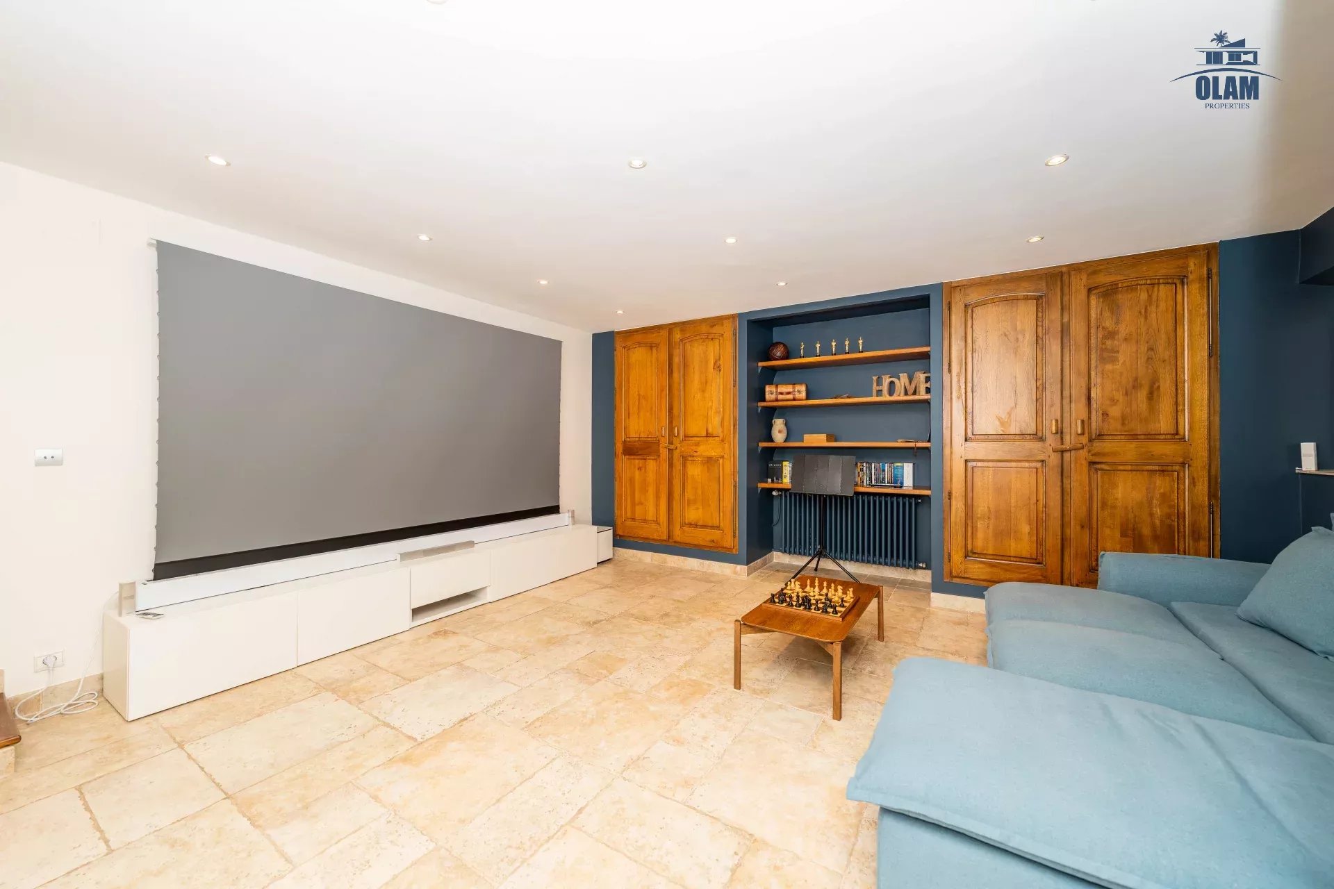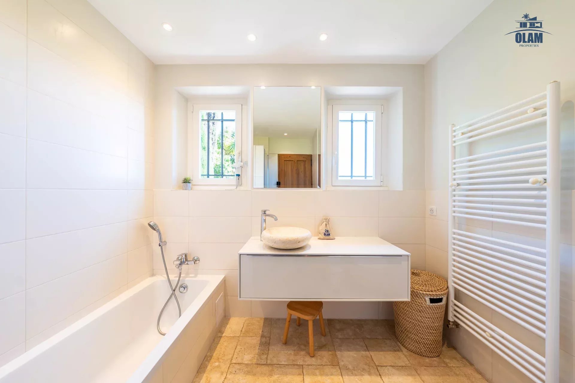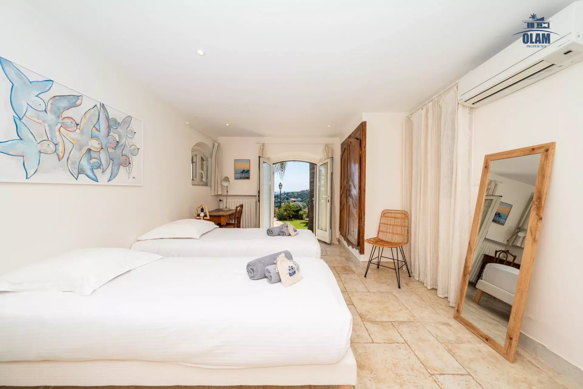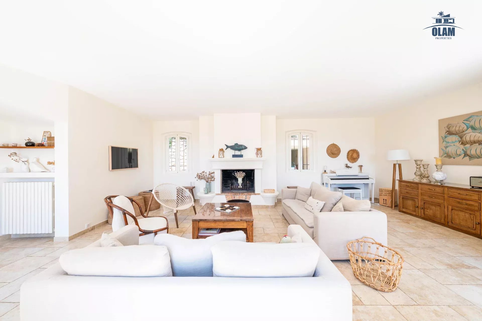 - Au rez-de-jardin : 2 chambres donnant sur le jardin avec chacune leur salle de douche et wc. Une salle de cinéma, un salon, une buanderie. L’ensemble des pièces (salons, salle à manger, cuisine et les 4 suites) ont vue sur la mer.
