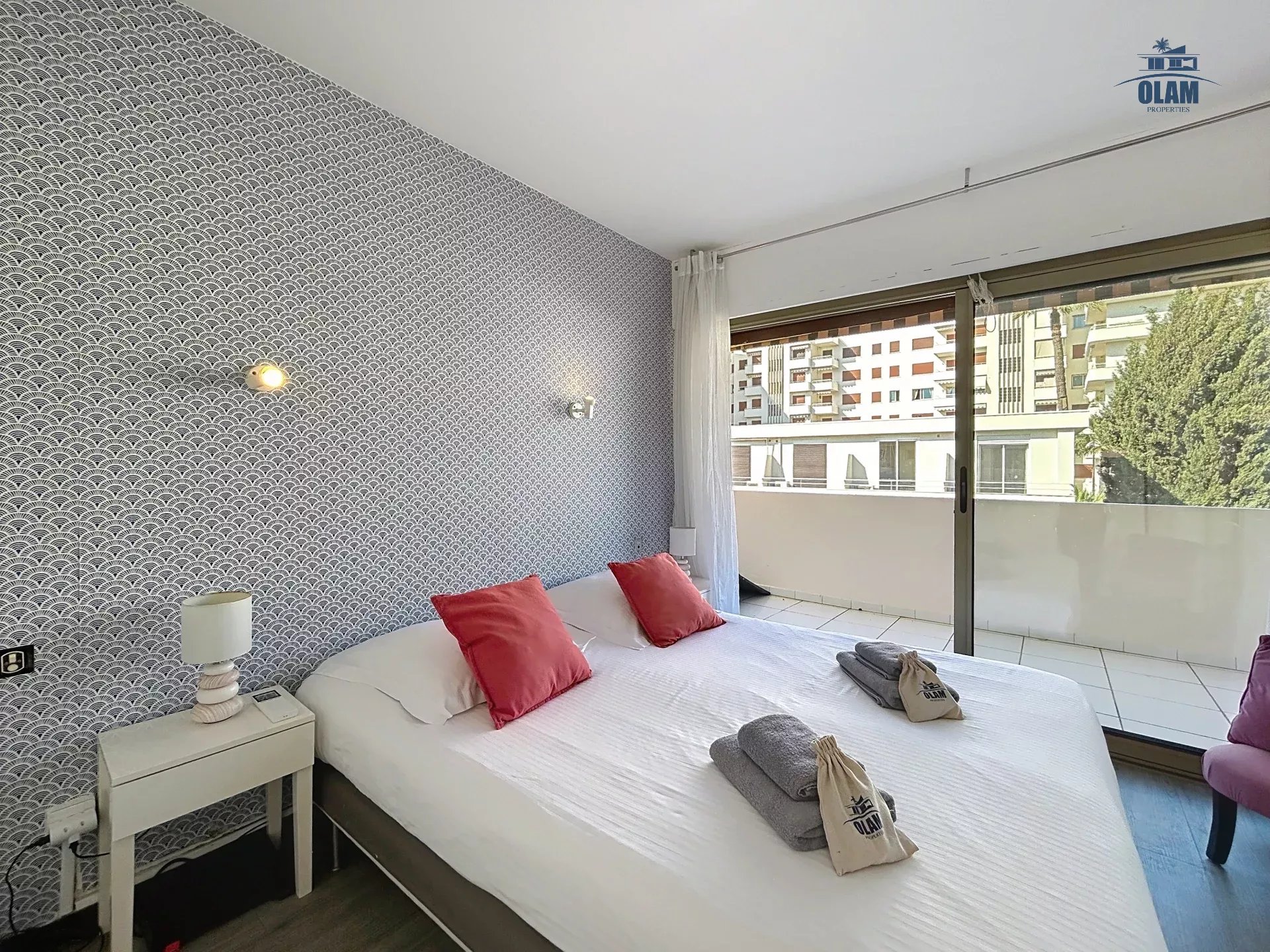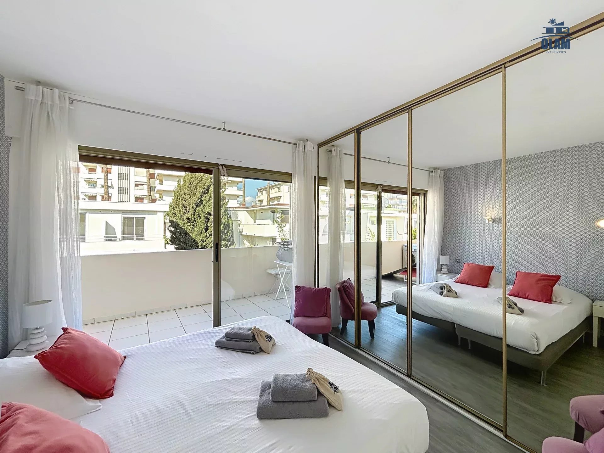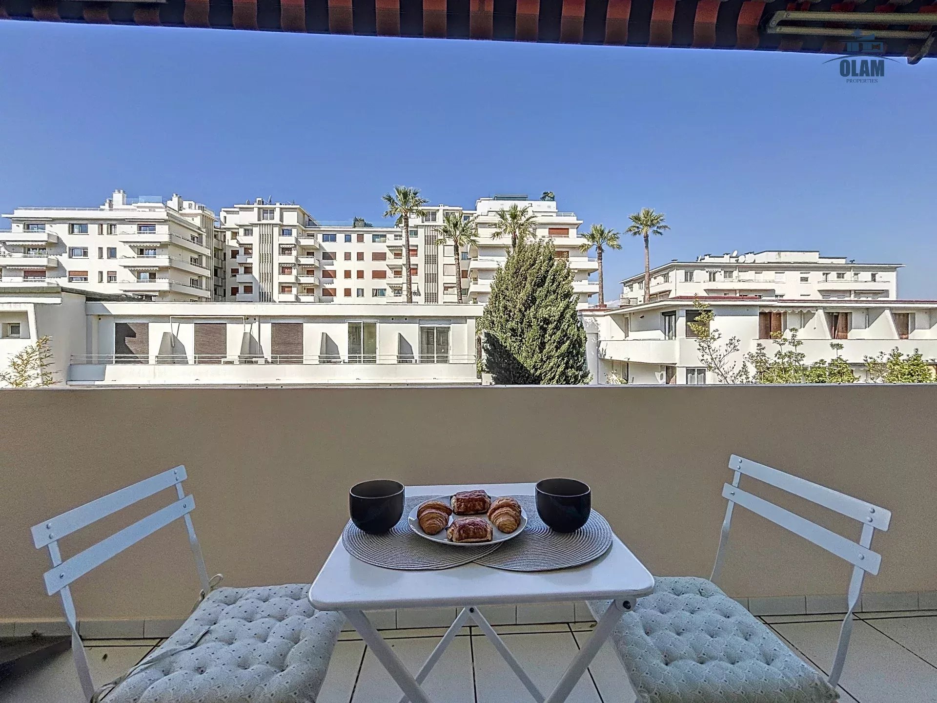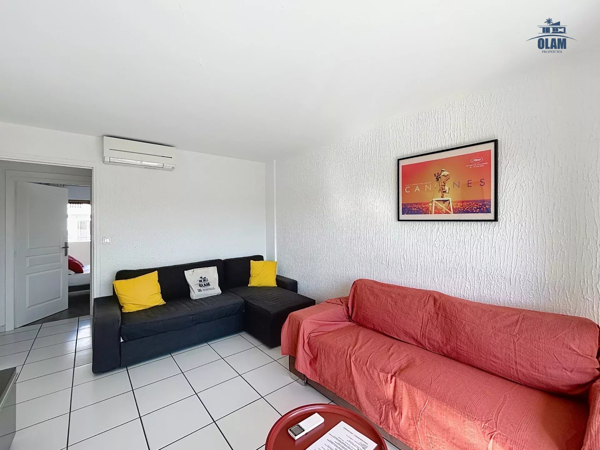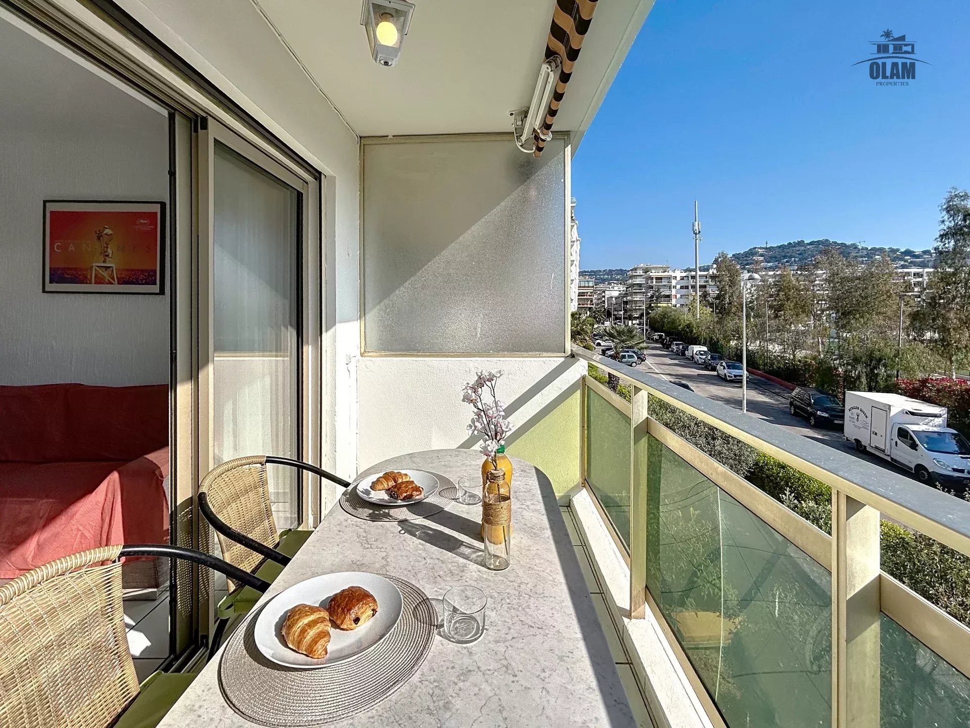Idéalement situé, face aux plages de la Croisette, à moins de 50m de la célèbre avenue. Tous les commerces sont à moins de 2 minutes à pied de l'immeuble tels que pharmacie, supermarché, boulangerie, banque... Transports en commun à 100m. L'appartement se situe dans un domaine sécurisé et fermé! Parking facile. Appartement situé au 2ème étage sans ascenseur d'une jolie résidence avec salon, cuisine séparée, salle de douche avec wc, chambre avec la possibilité d'avoir 2 lits simples ou 1 grand lit. Une terrasse complète le bien.