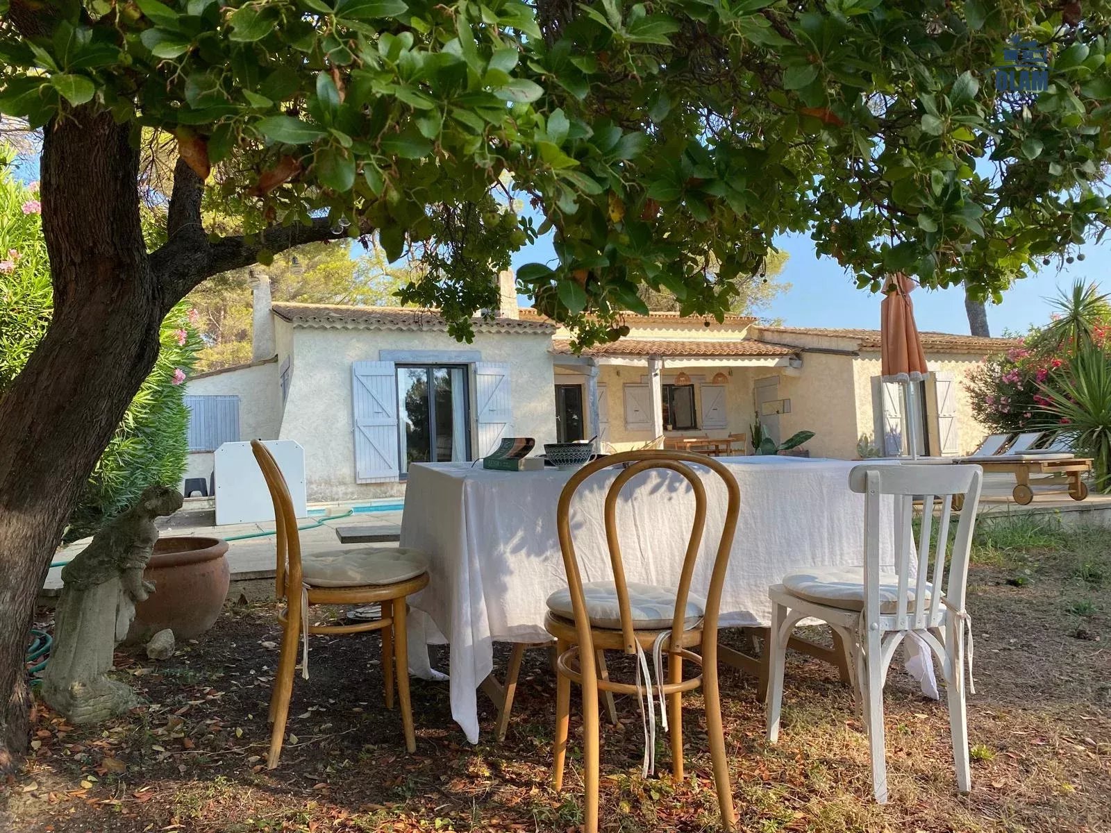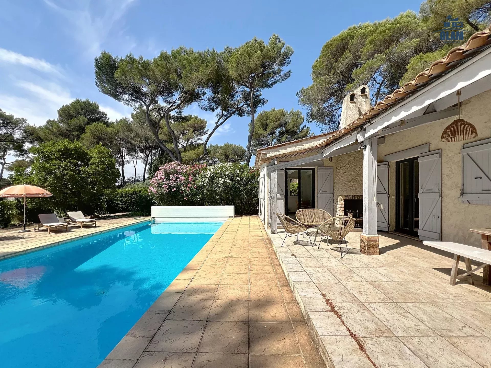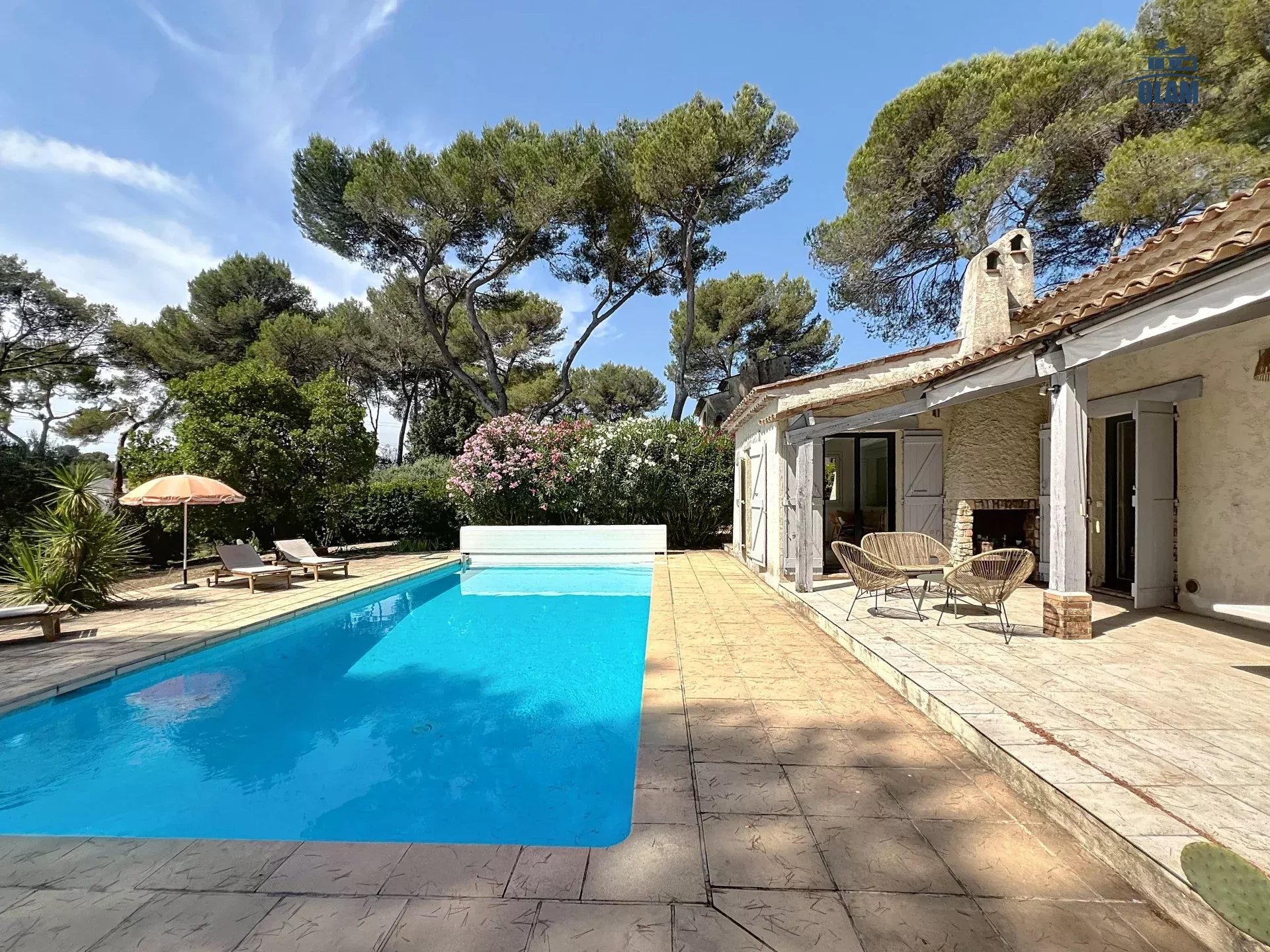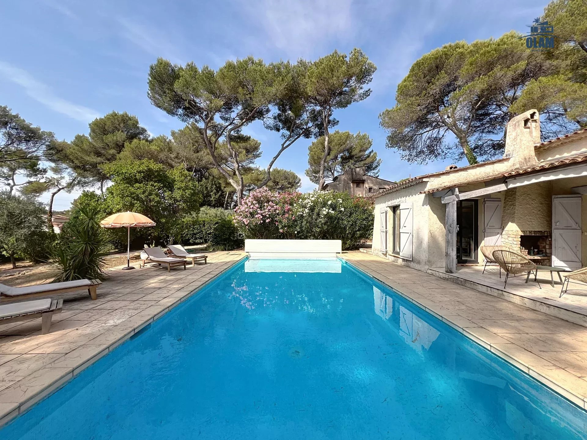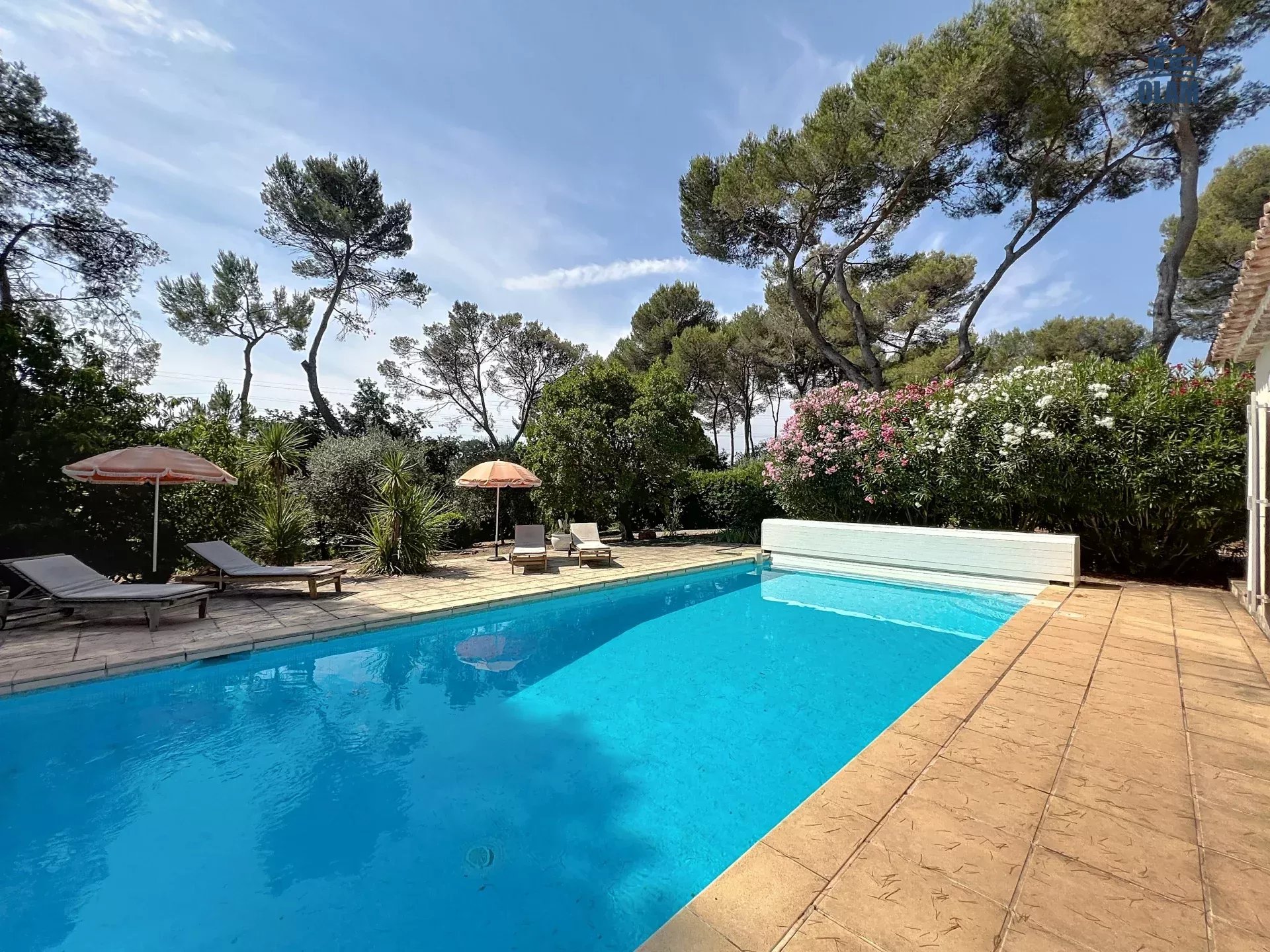 Au coeur d'une pinède, dans un quartier calme et résidentiel villa de plein pied d’environ 150m2 composée comme suit : un grand salon avec vue dégagée, une grande cuisine toute équipée. Un hall d'entrée spacieux avec toilettes invités. Une grande chambre avec salle de bains, deux autres chambres avec leur salles de douche. Toujours au même niveau à l’extérieur se trouve une grande terrasse, un espace pour les repas et une piscine de 12 x 5m. TV – Connexion internet - Climatisation