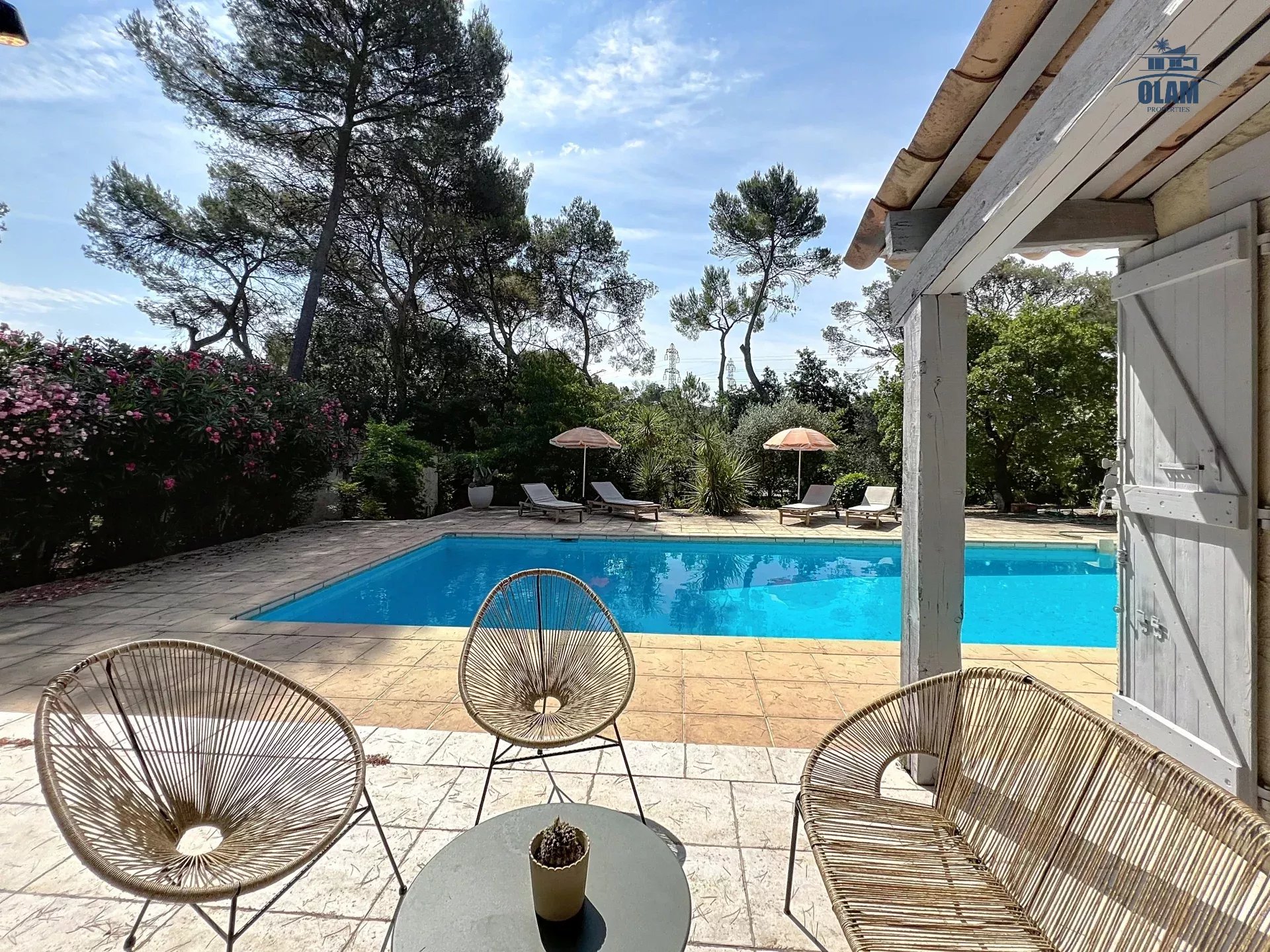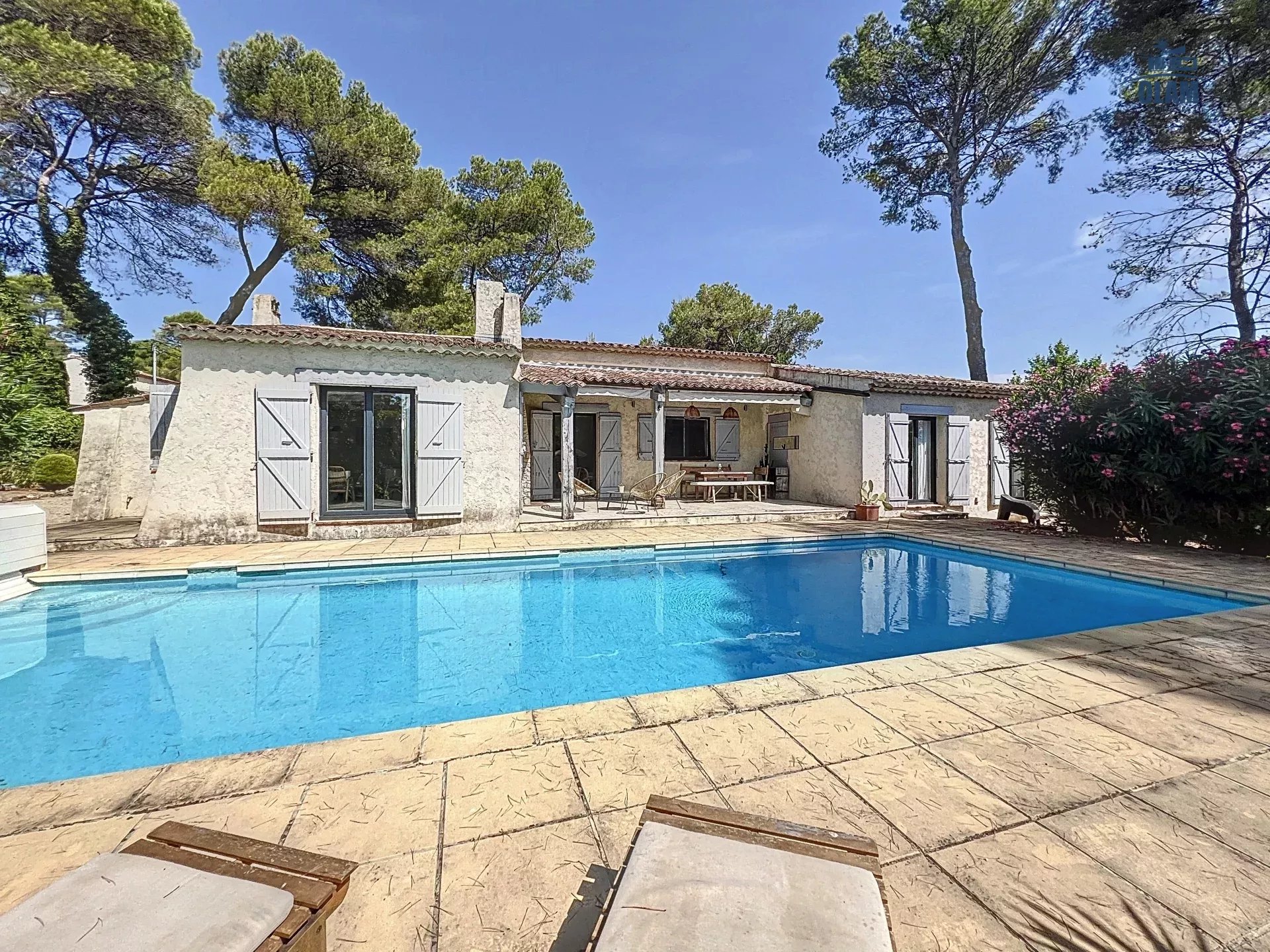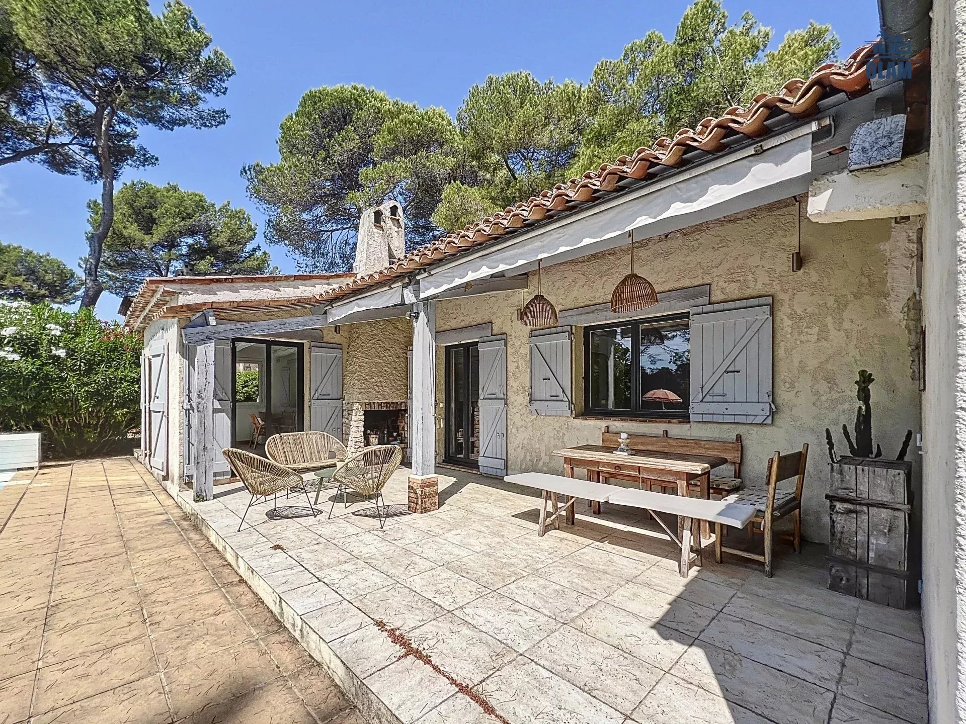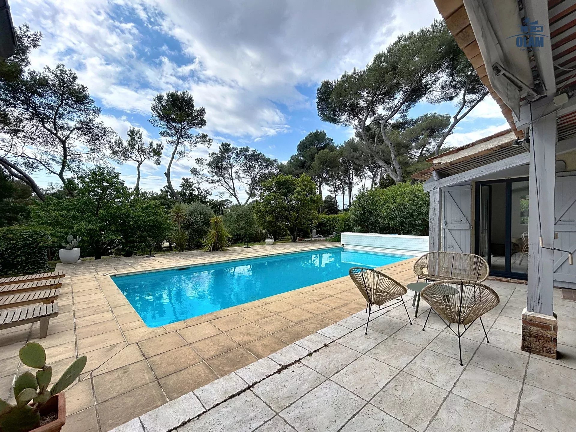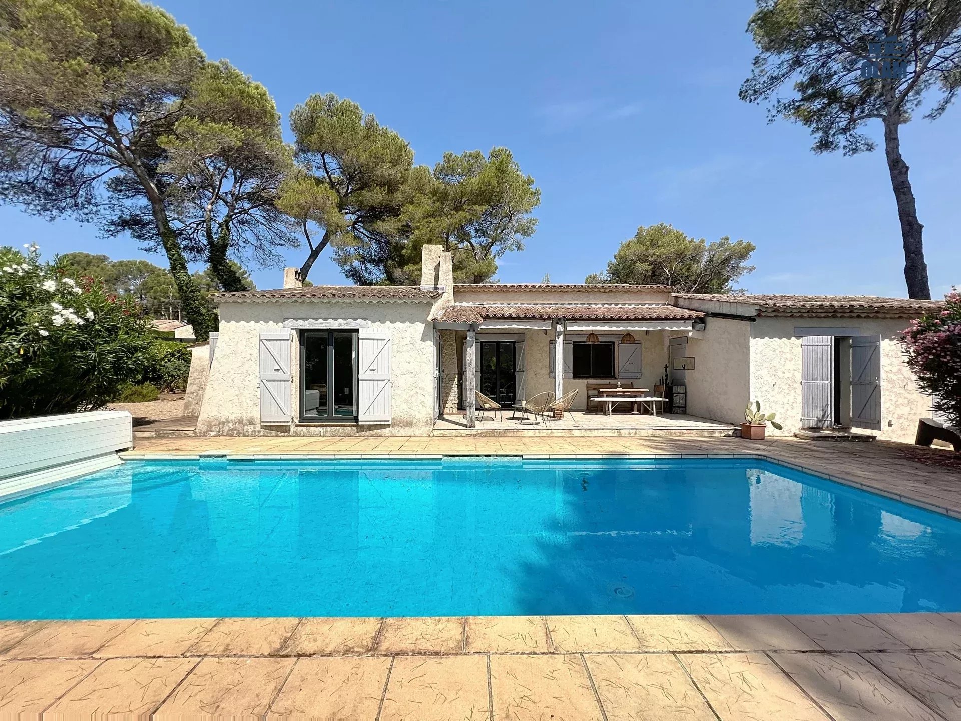 Au coeur d'une pinède, dans un quartier calme et résidentiel villa de plein pied d’environ 150m2 composée comme suit : un grand salon avec vue dégagée, une grande cuisine toute équipée. Un hall d'entrée spacieux avec toilettes invités. Une grande chambre avec salle de bains, deux autres chambres avec leur salles de douche. Toujours au même niveau à l’extérieur se trouve une grande terrasse, un espace pour les repas et une piscine de 12 x 5m. TV – Connexion internet - Climatisation