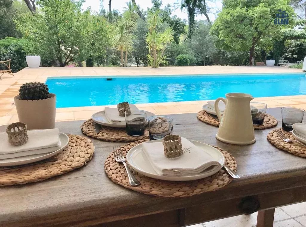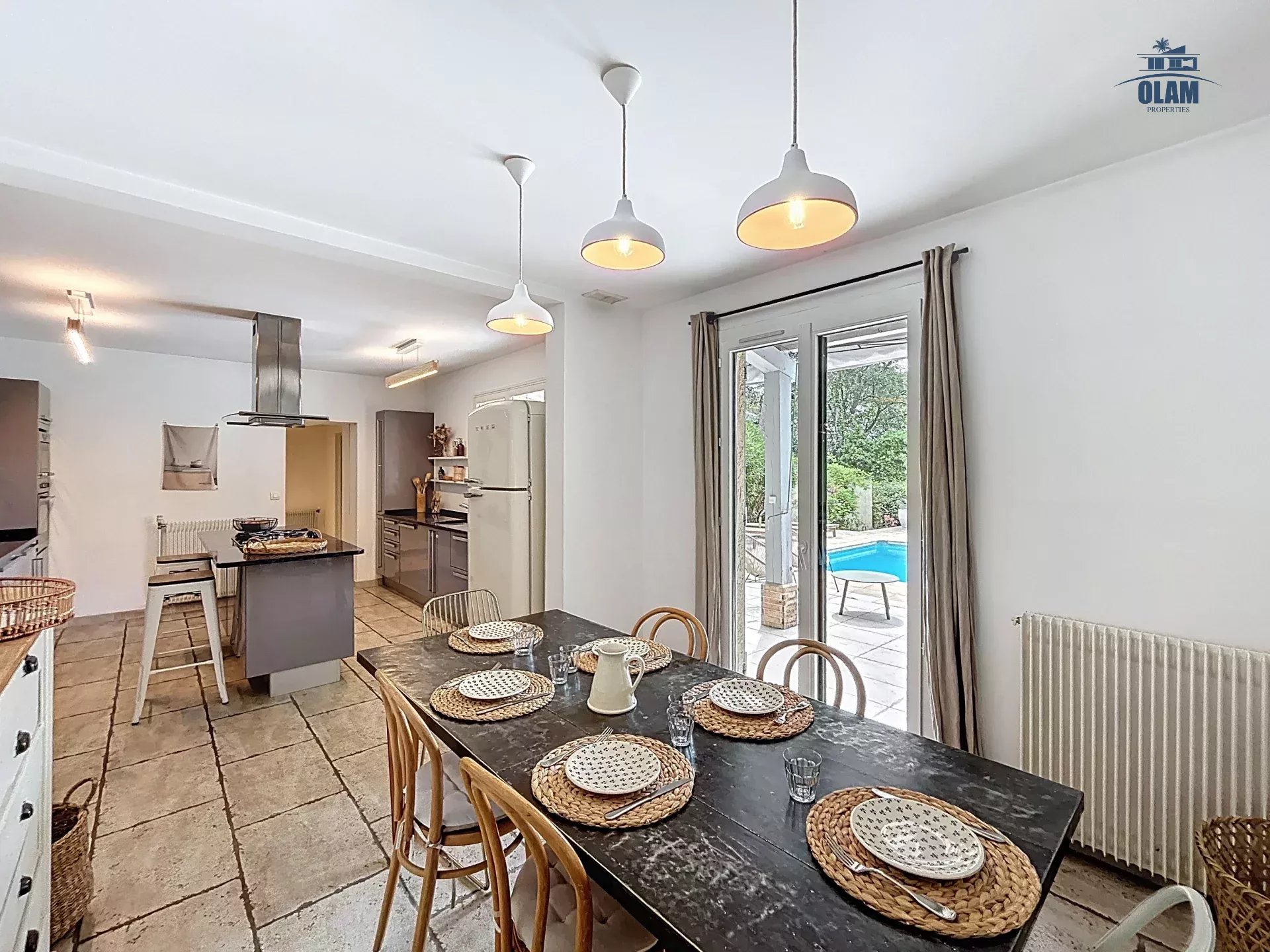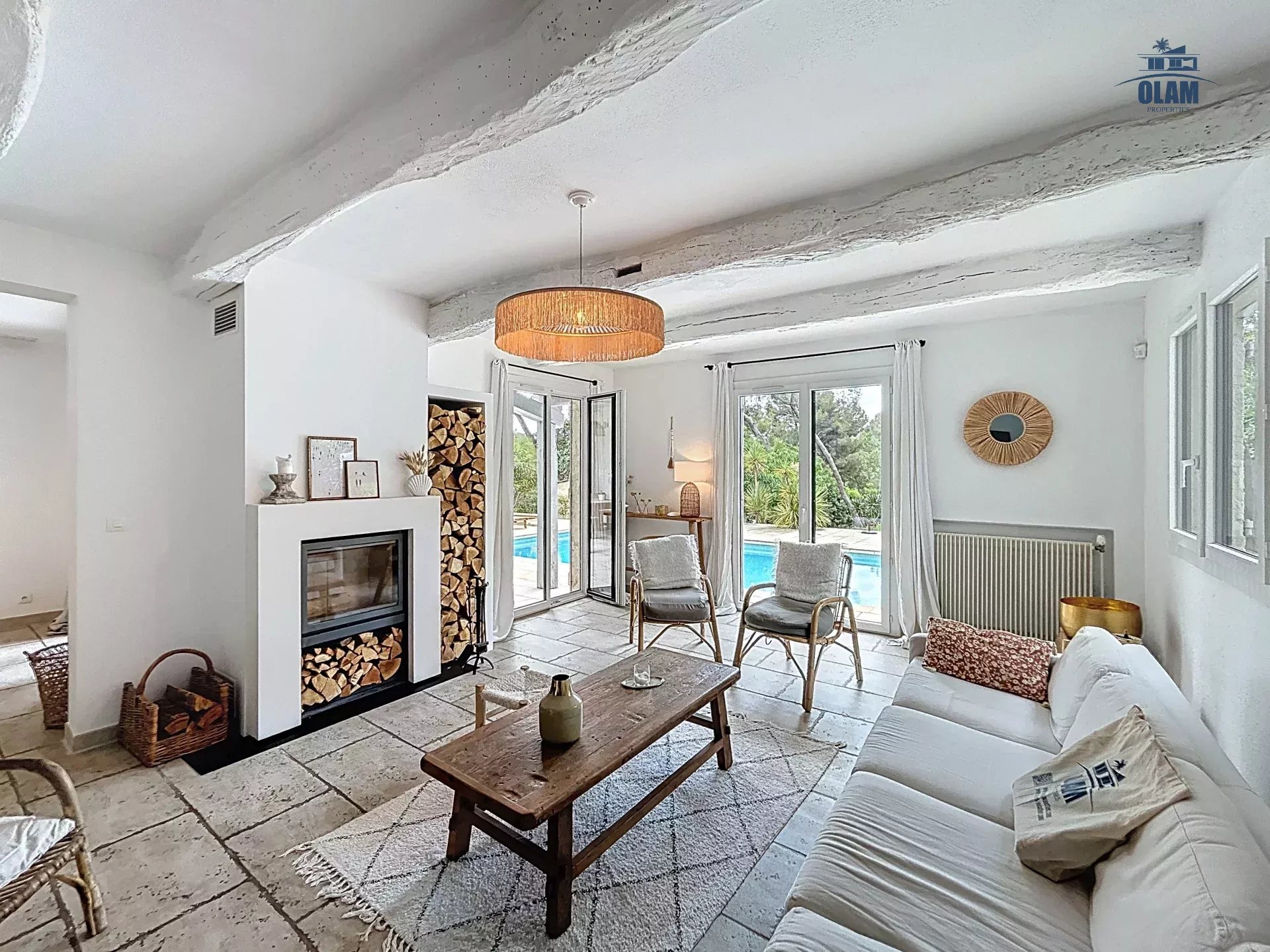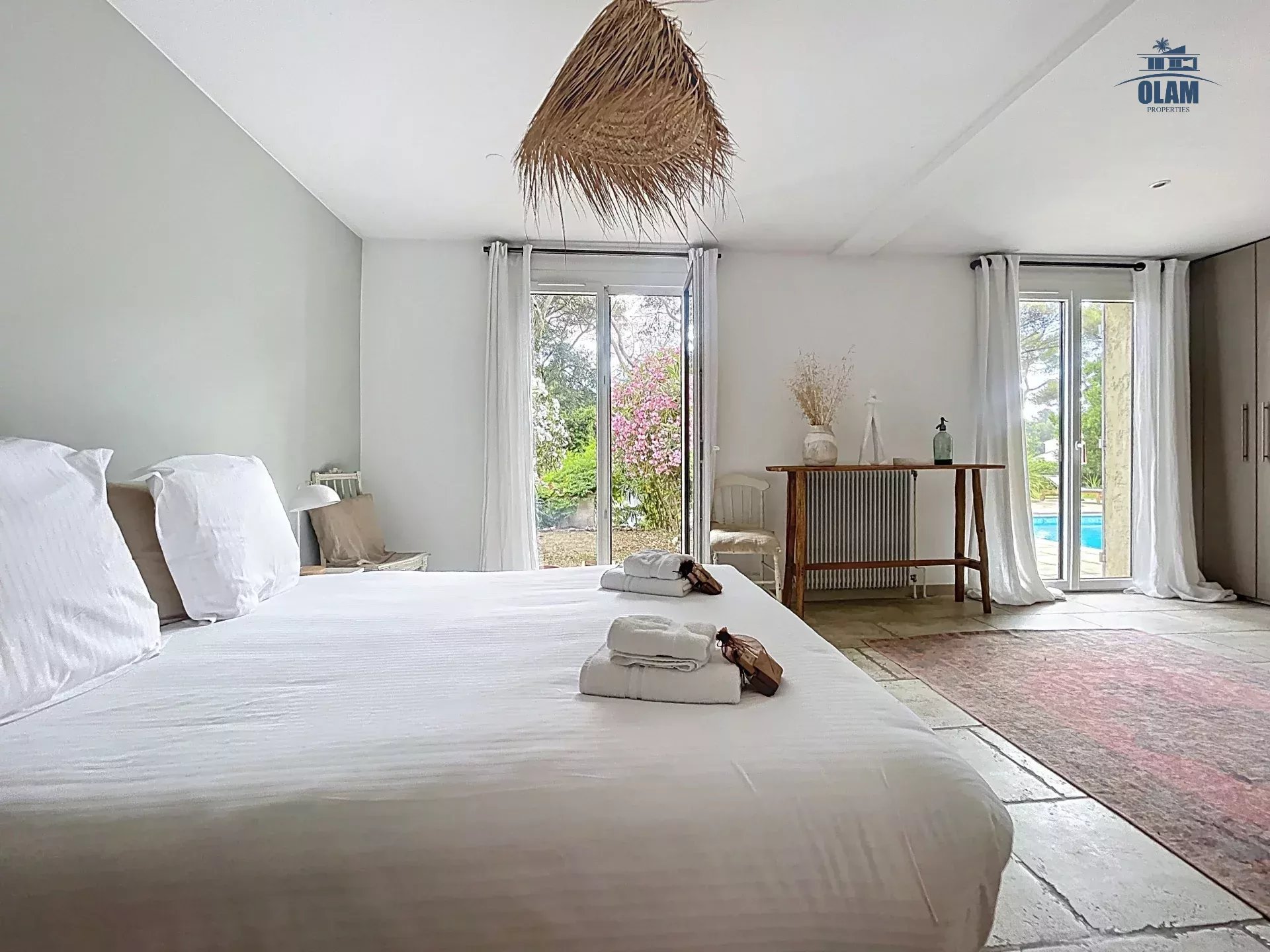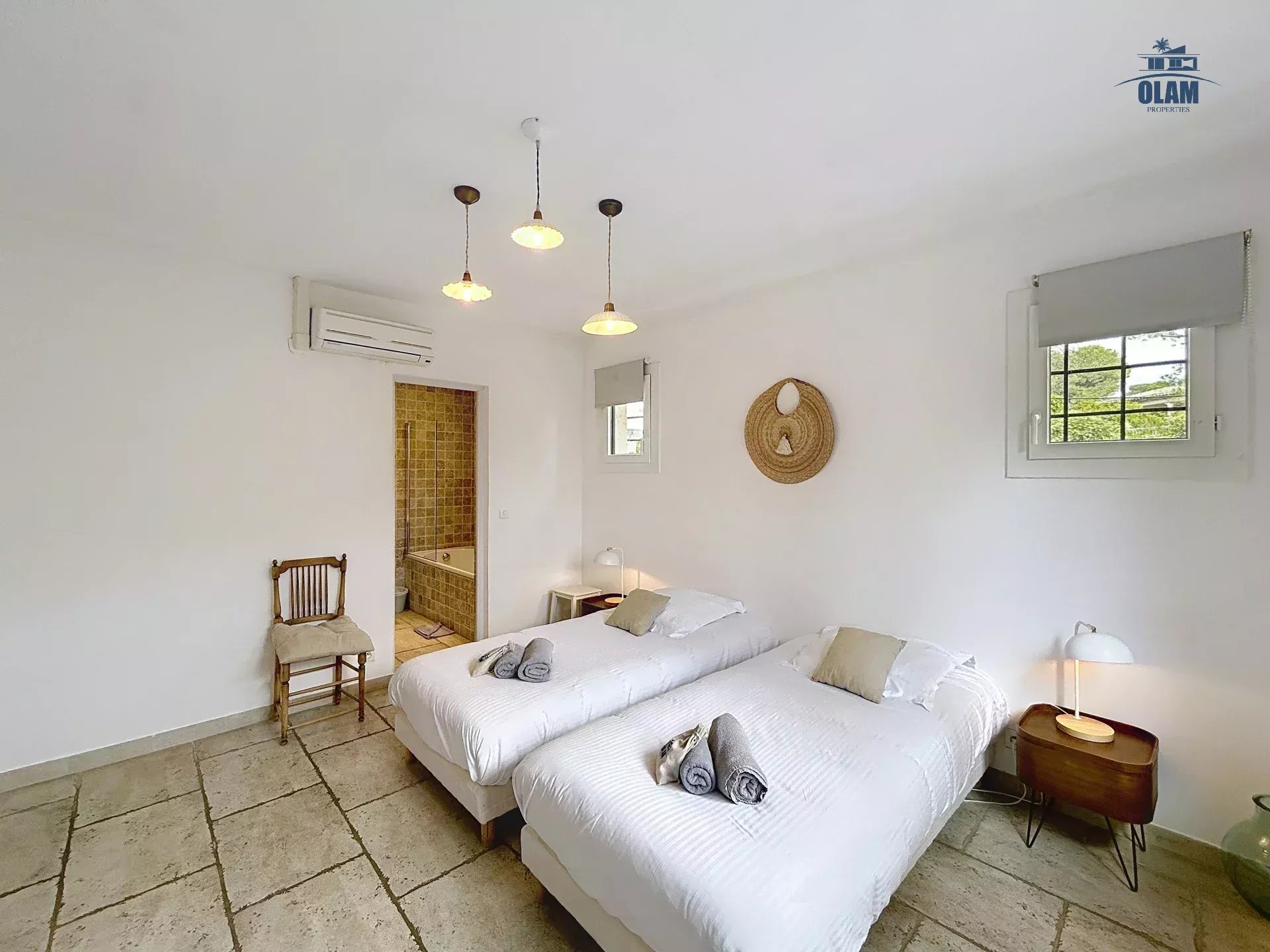 Au coeur d'une pinède, dans un quartier calme et résidentiel villa de plein pied d’environ 150m2 composée comme suit : un grand salon avec vue dégagée, une grande cuisine toute équipée. Un hall d'entrée spacieux avec toilettes invités. Une grande chambre avec salle de bains, deux autres chambres avec leur salles de douche. Toujours au même niveau à l’extérieur se trouve une grande terrasse, un espace pour les repas et une piscine de 12 x 5m. TV – Connexion internet - Climatisation