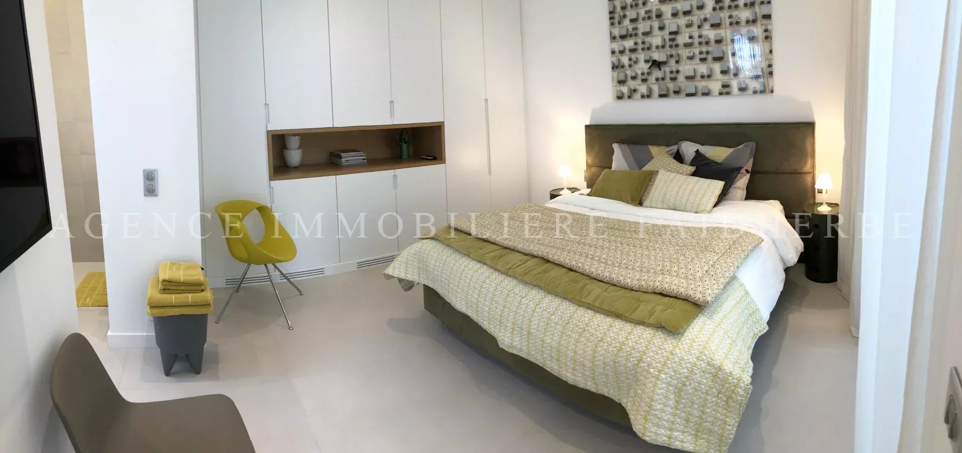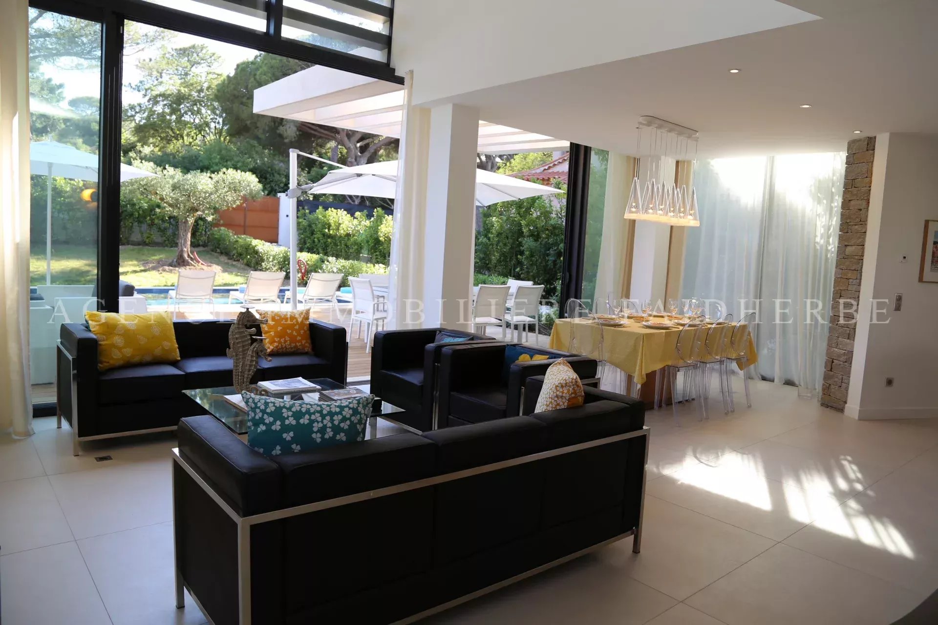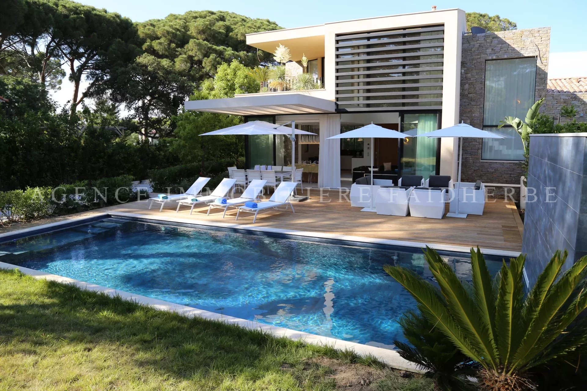 Dans le bas du Parc des Salins à 100m de la page, villa contemporaine neuve composée de: - 4 chambres avec lit en 160, salle de douche avec toilette, dressing, petite terrasse, TV - 1 chambre de maître à l’étage avec sa terrasse privative, salle de bain/douche/toilette, dressing, TV - Salon/salle à manger ouvert sur la terrasse - Cuisine équipée ouverte - Buanderie avec lave linge et sèche linge A/C, alarme, WIFI, 2 coffres/ safe 83119002479WF // REF : 154