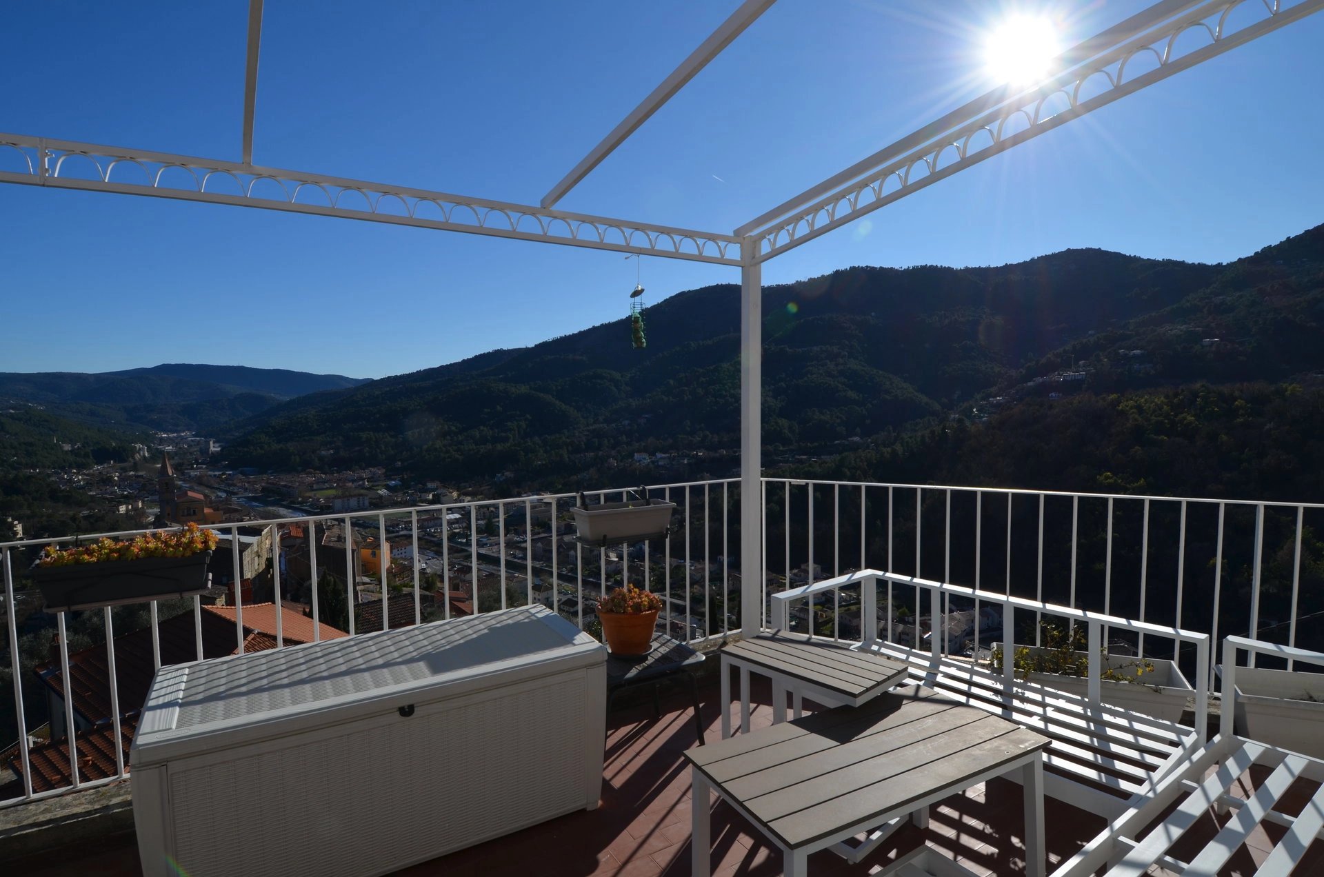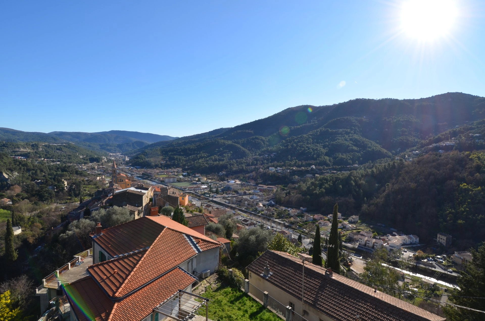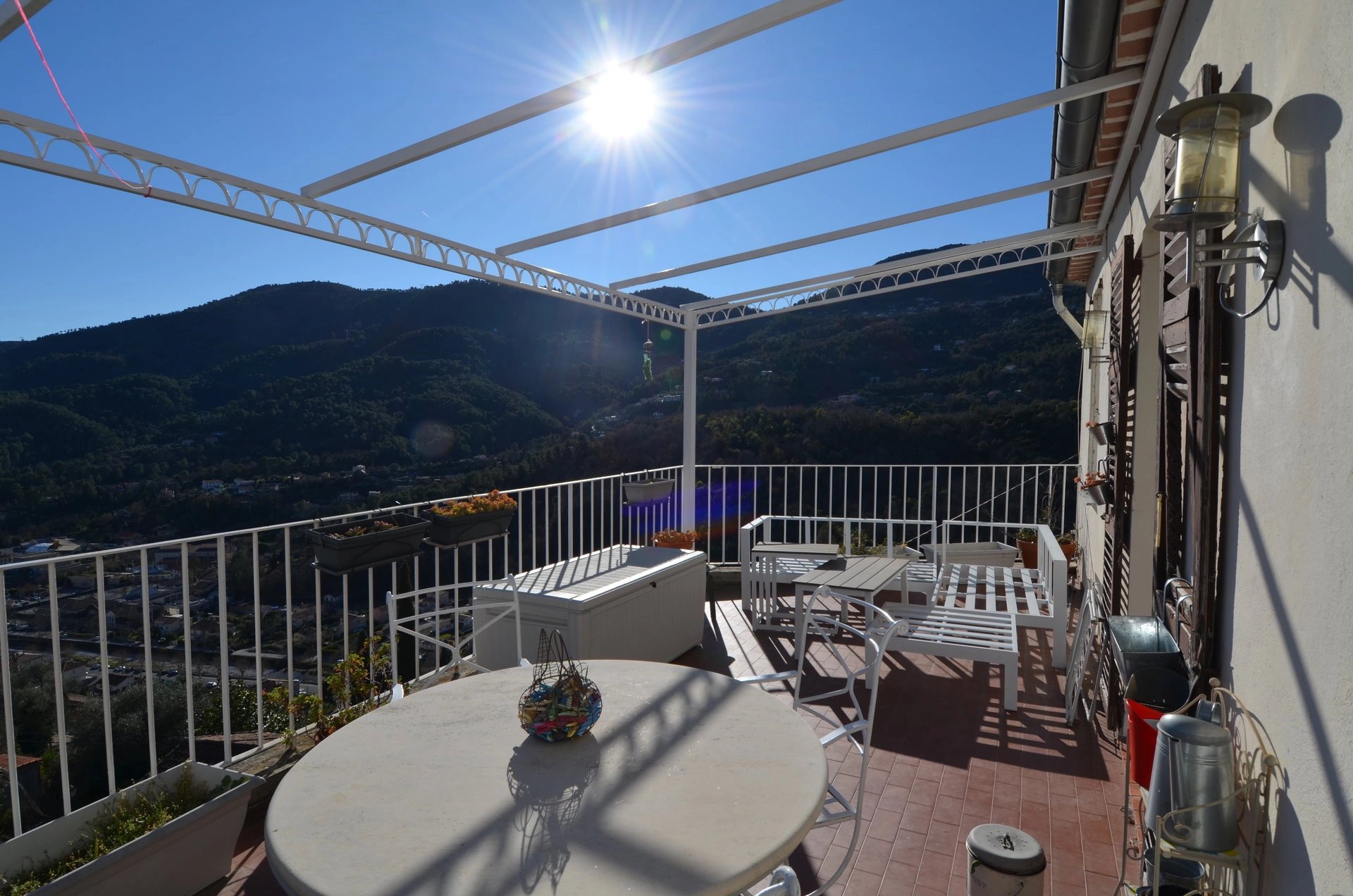 Une grande terrasse aménagée exposée plein sud donne sur la ville de Contes et son village.