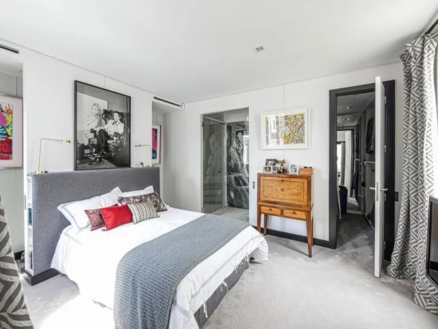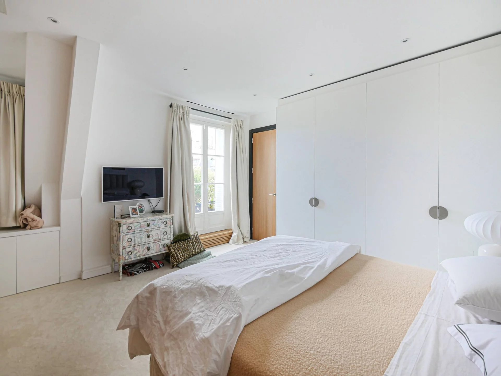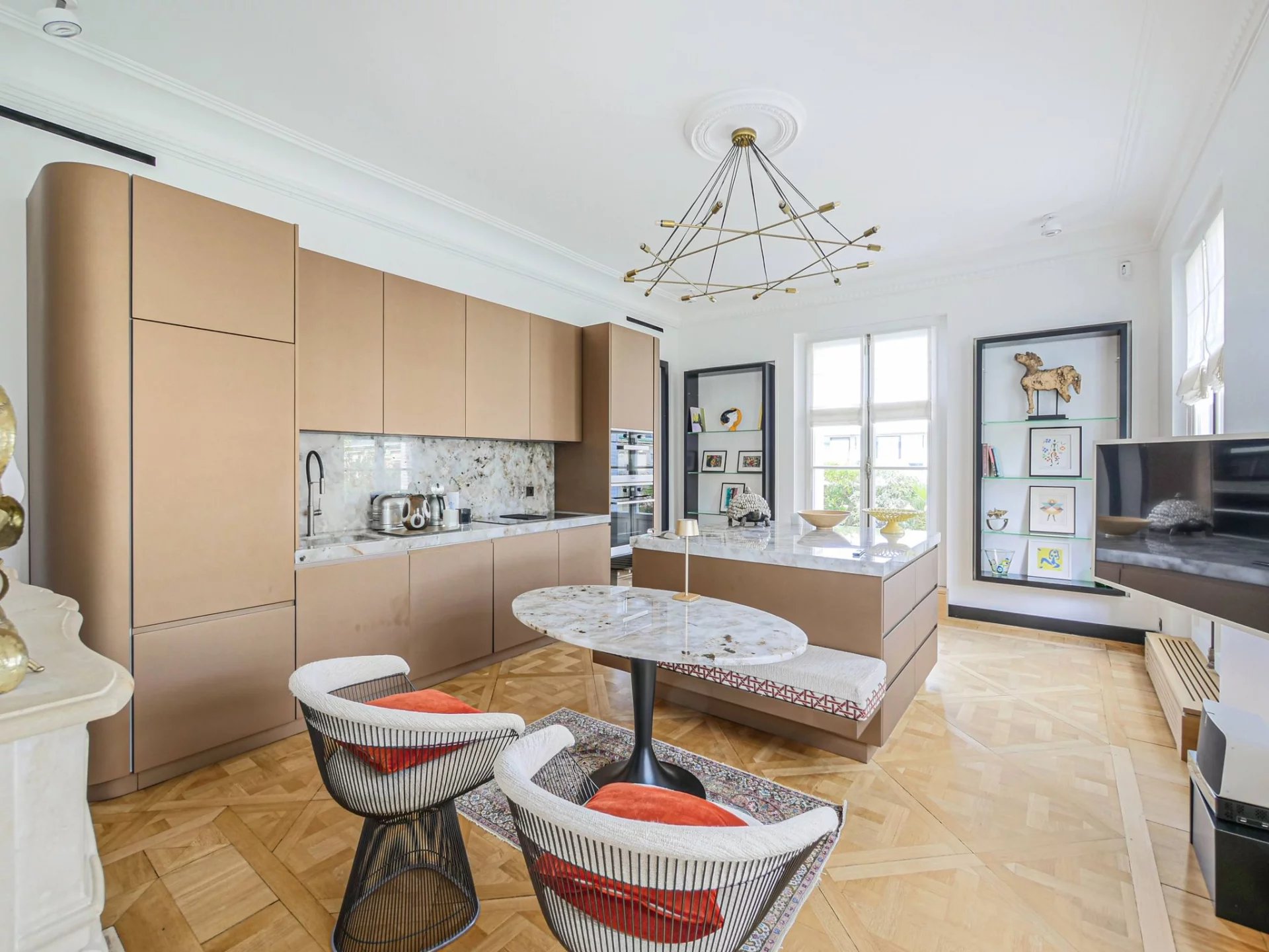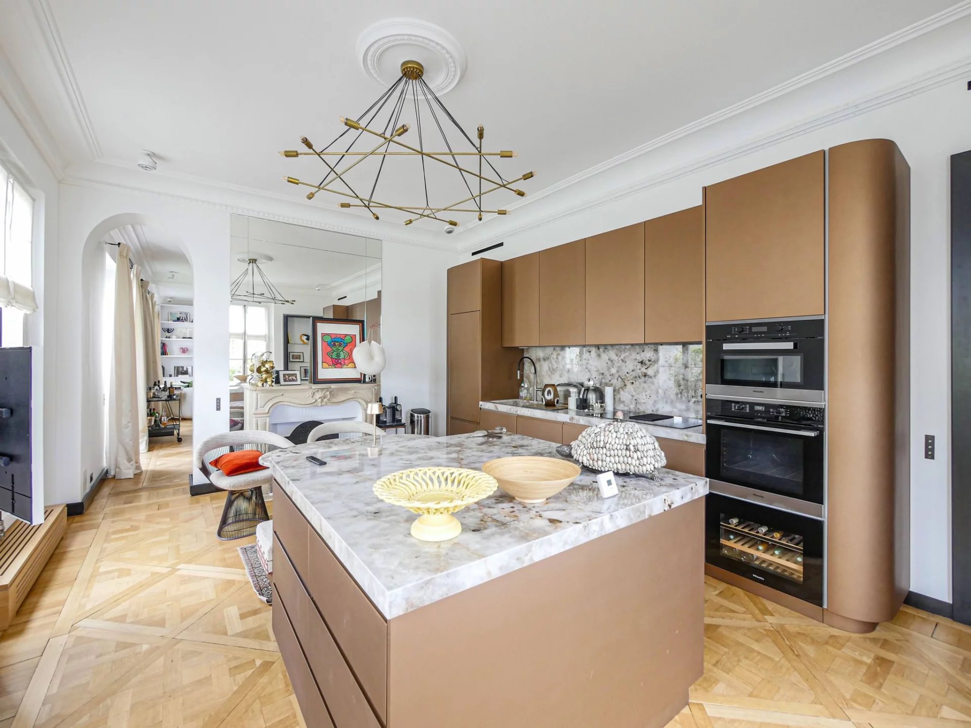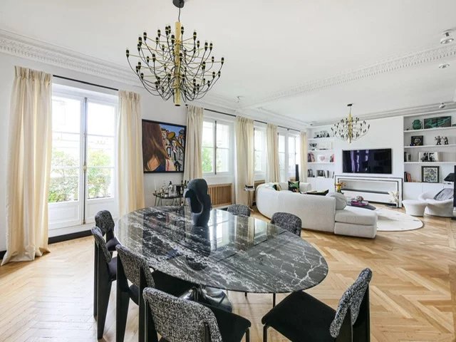 Au 5ème étage d'un magnifique immeuble haussmmannien, un appartement contemporain de 175 m2 avec balcon.