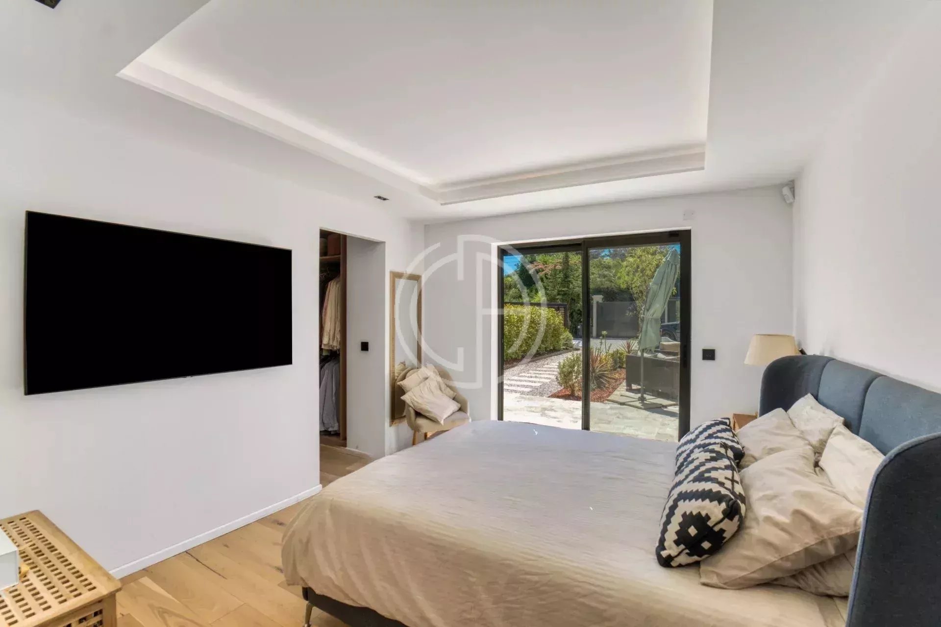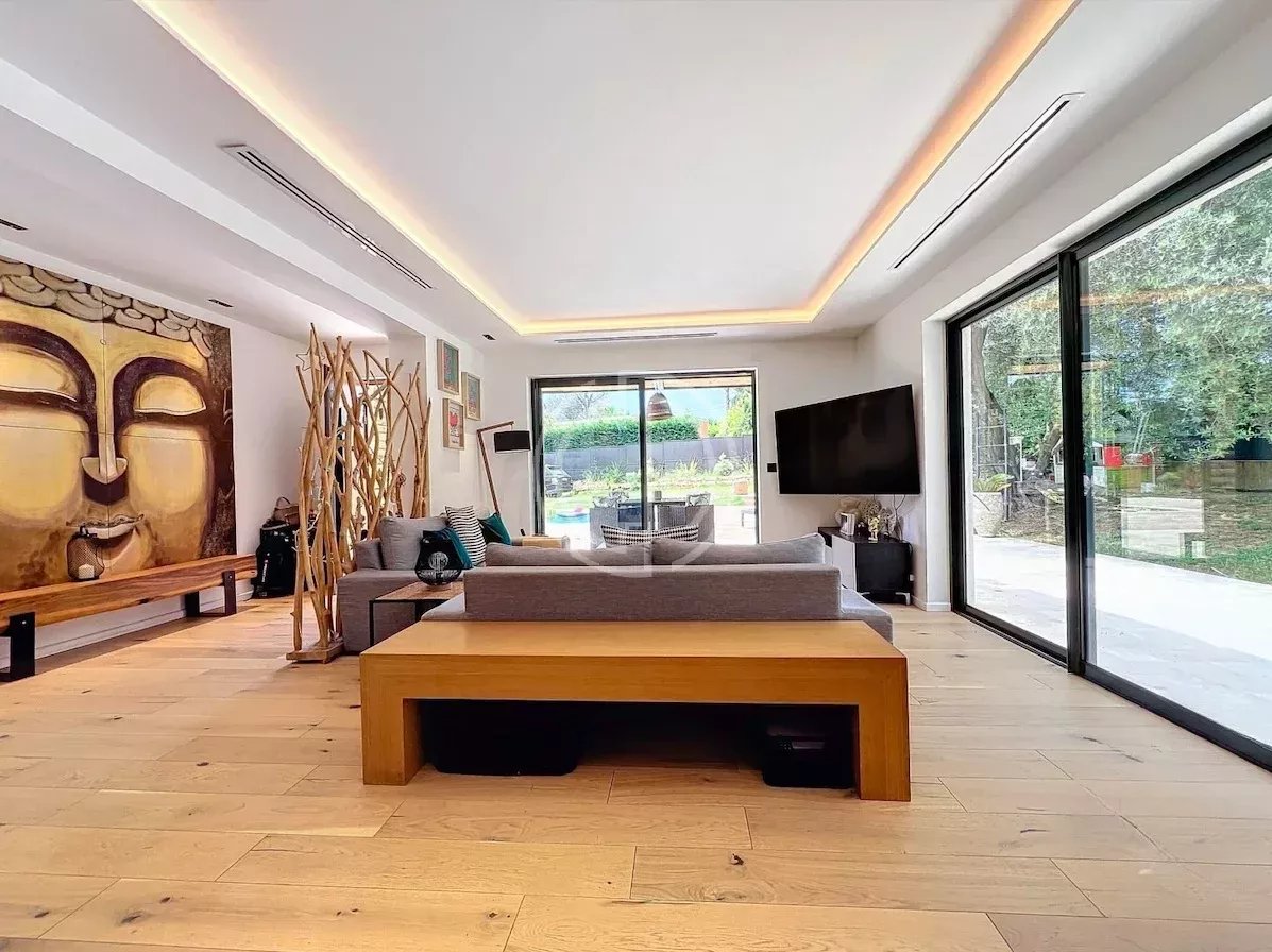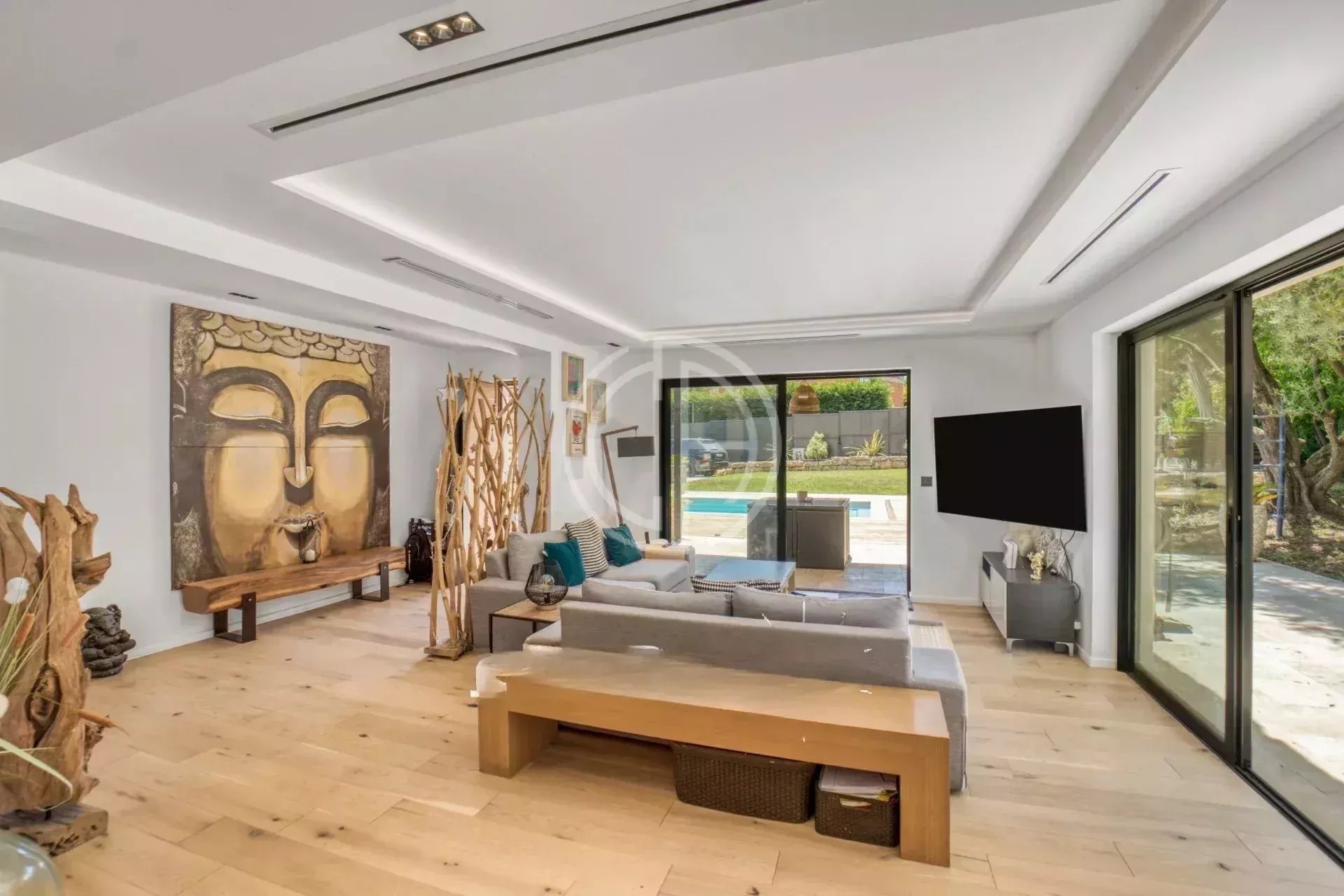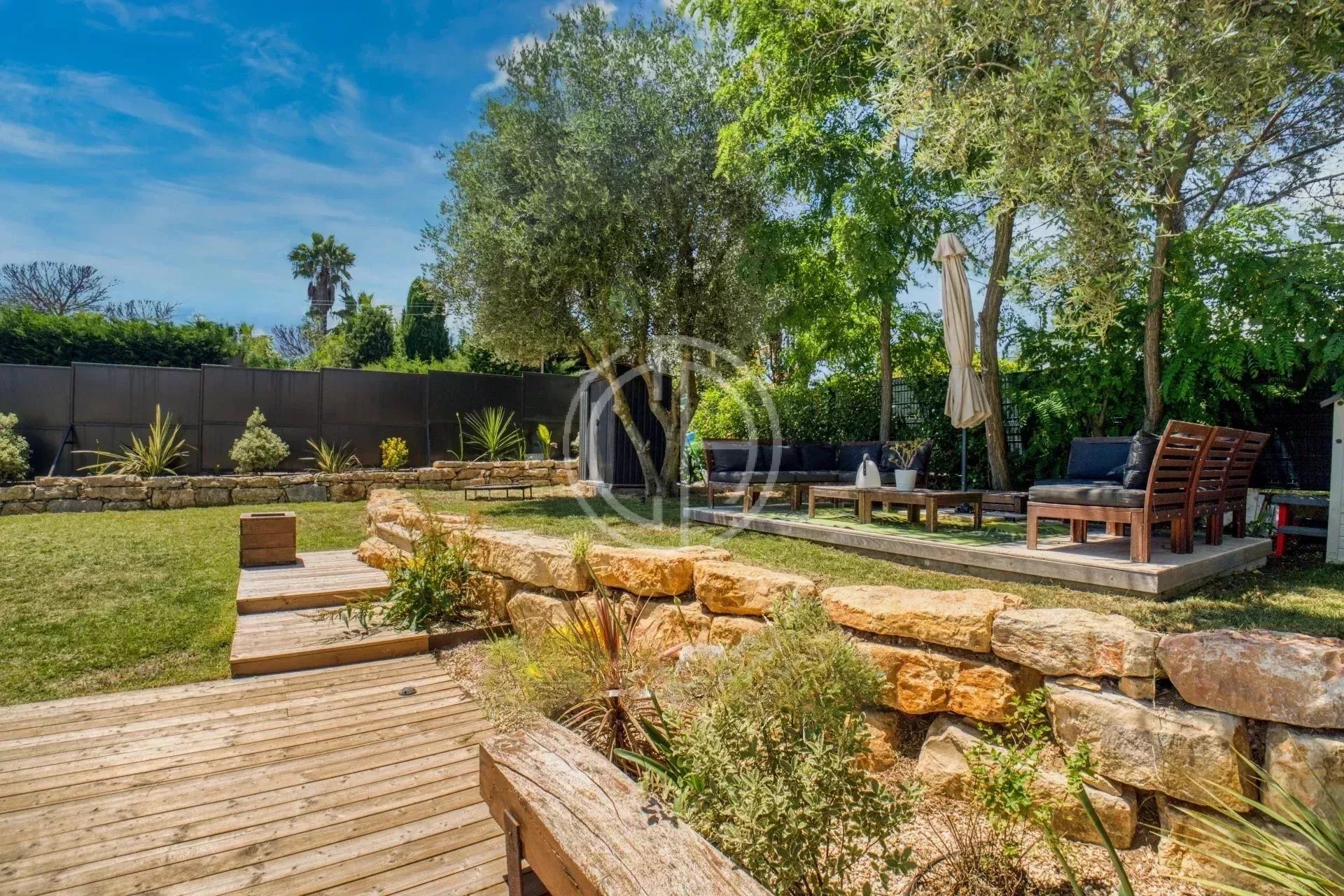 Dans un domaine fermé, à proximité des commerces, villa de plain-pied d'une superficie d'env. 125m2 implantée sur un terrain plat de 1440m2 avec piscine au sel. Cette villa entièrement rénovée se compose d'un large salon-séjour de 42m2 avec cuisine ouverte, de 4 chambres - 3 salles de bain dont 1 chambre master avec son dressing et sa salle de bains. Cave en sous-sol. Huisseries en aluminium, clim gainée, parquet massif En complément : 1 abris pour 2 voitures et de nombreuses places de parkings. Facile d'accès, à pied d'un petit centre commercial avec boulangerie, boucher, caviste, coiffeur Rare, à visiter sans tarder Le jardin est plat, sans aucun vis-à-vis et comprend plusieurs espaces détente.