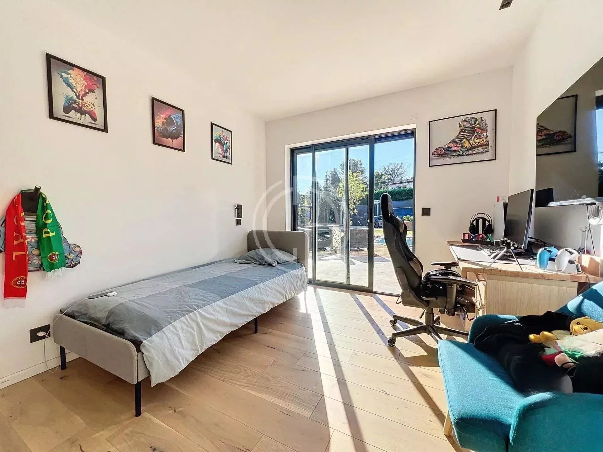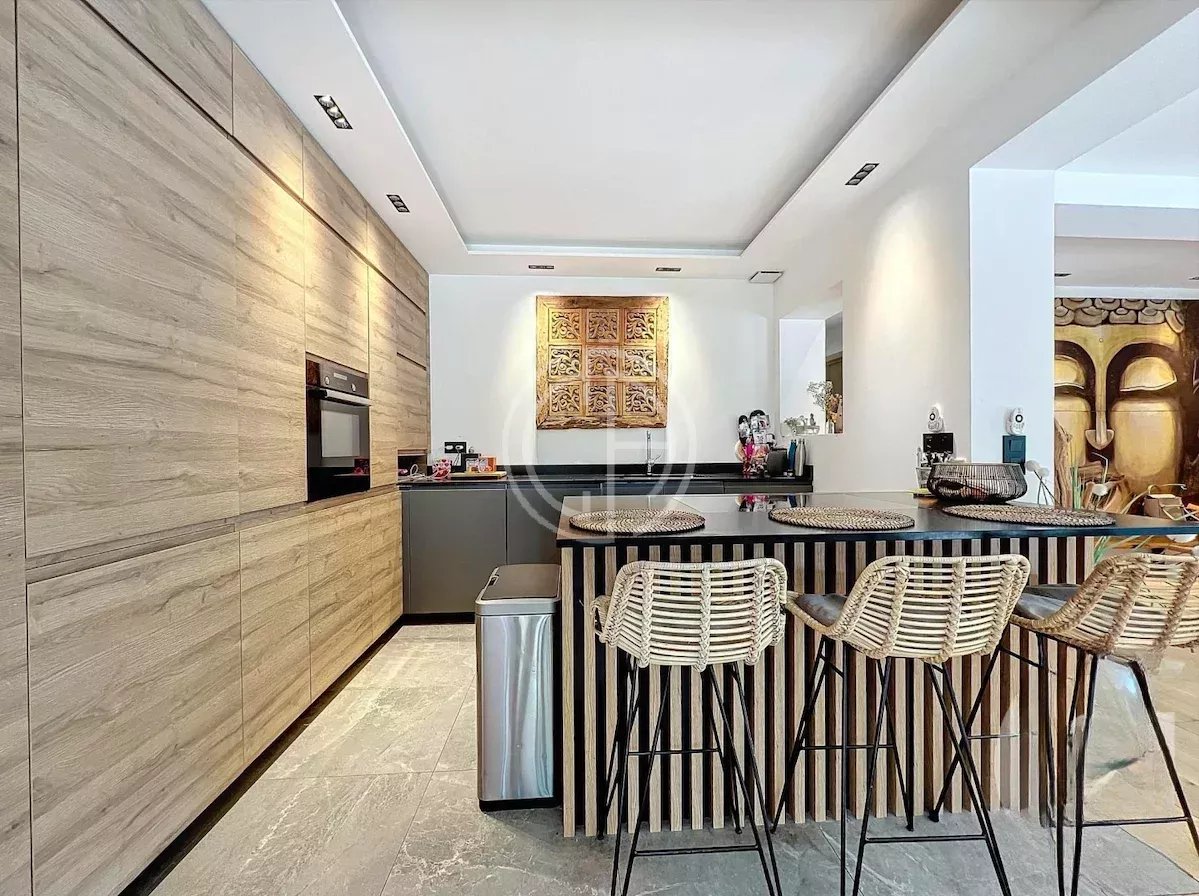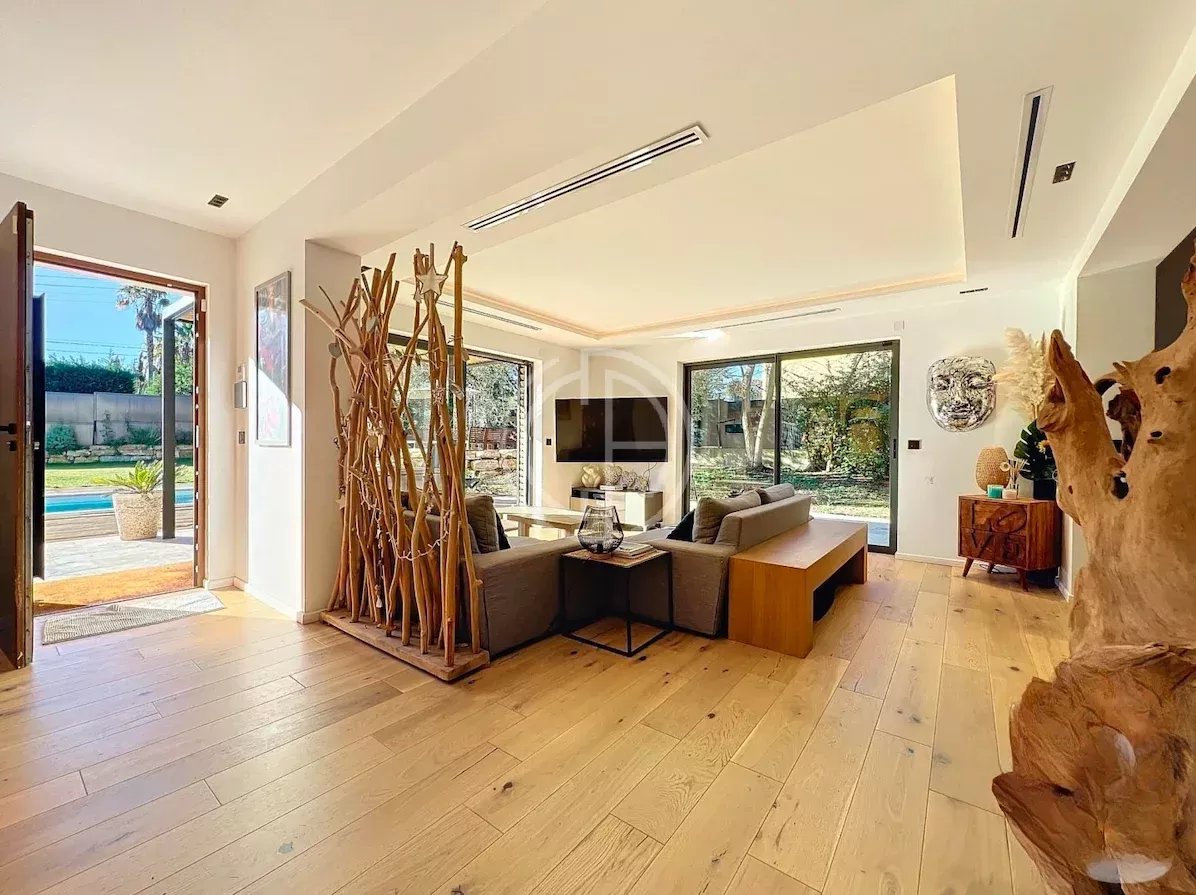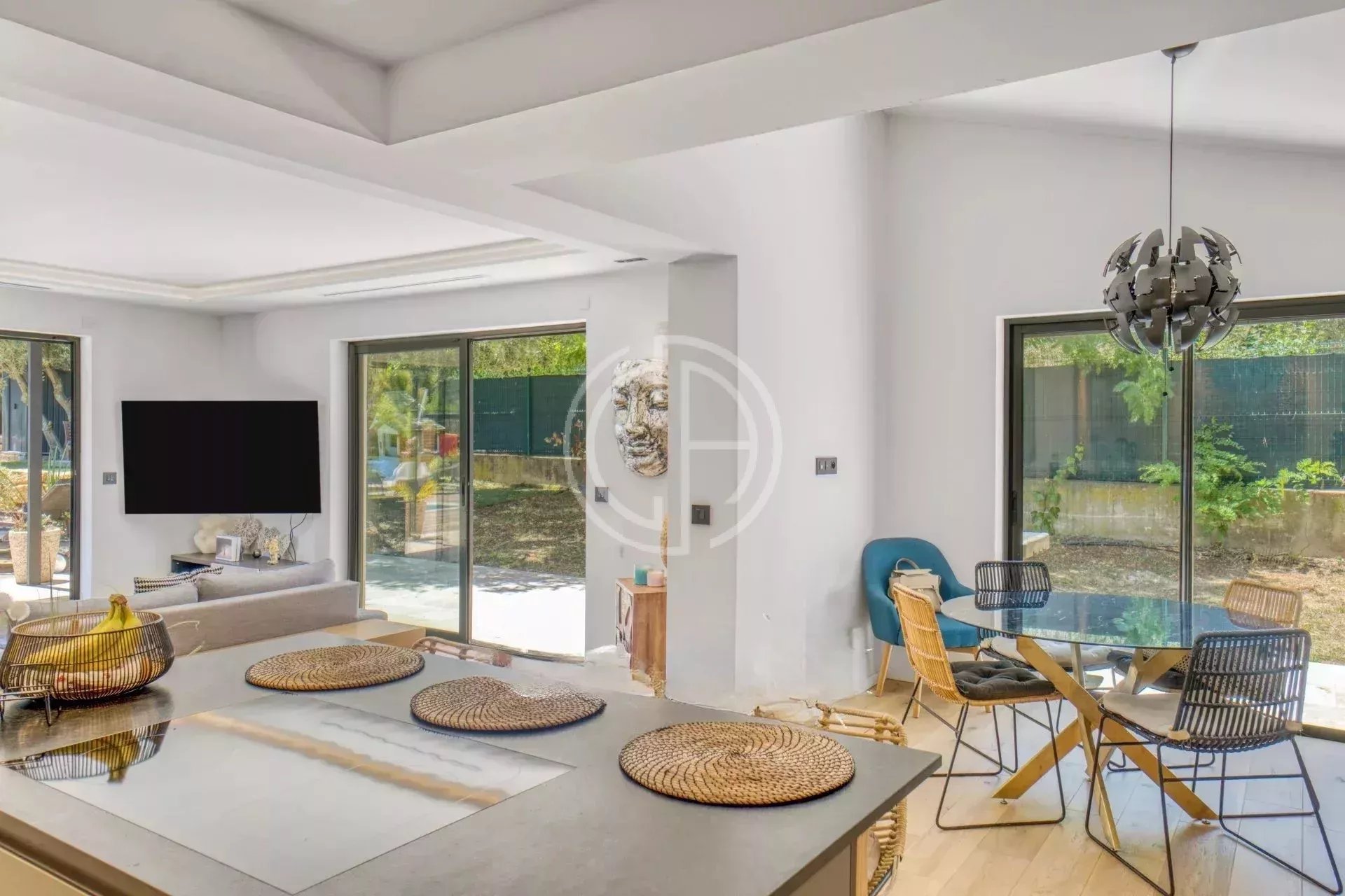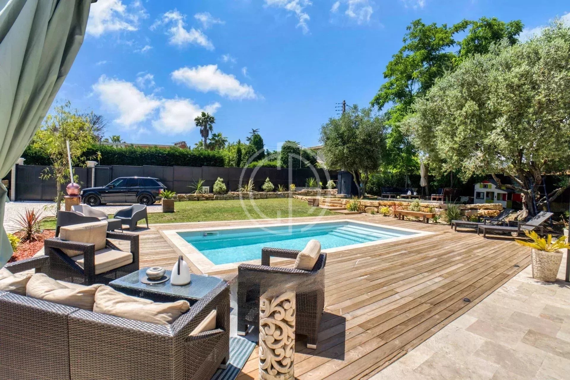 Dans un domaine fermé, à proximité des commerces, villa de plain-pied d'une superficie d'env. 125m2 implantée sur un terrain plat de 1440m2 avec piscine au sel. Cette villa entièrement rénovée se compose d'un large salon-séjour de 42m2 avec cuisine ouverte, de 4 chambres - 3 salles de bain dont 1 chambre master avec son dressing et sa salle de bains. Cave en sous-sol. Huisseries en aluminium, clim gainée, parquet massif En complément : 1 abris pour 2 voitures et de nombreuses places de parkings. Facile d'accès, à pied d'un petit centre commercial avec boulangerie, boucher, caviste, coiffeur Rare, à visiter sans tarder Le jardin est plat, sans aucun vis-à-vis et comprend plusieurs espaces détente.