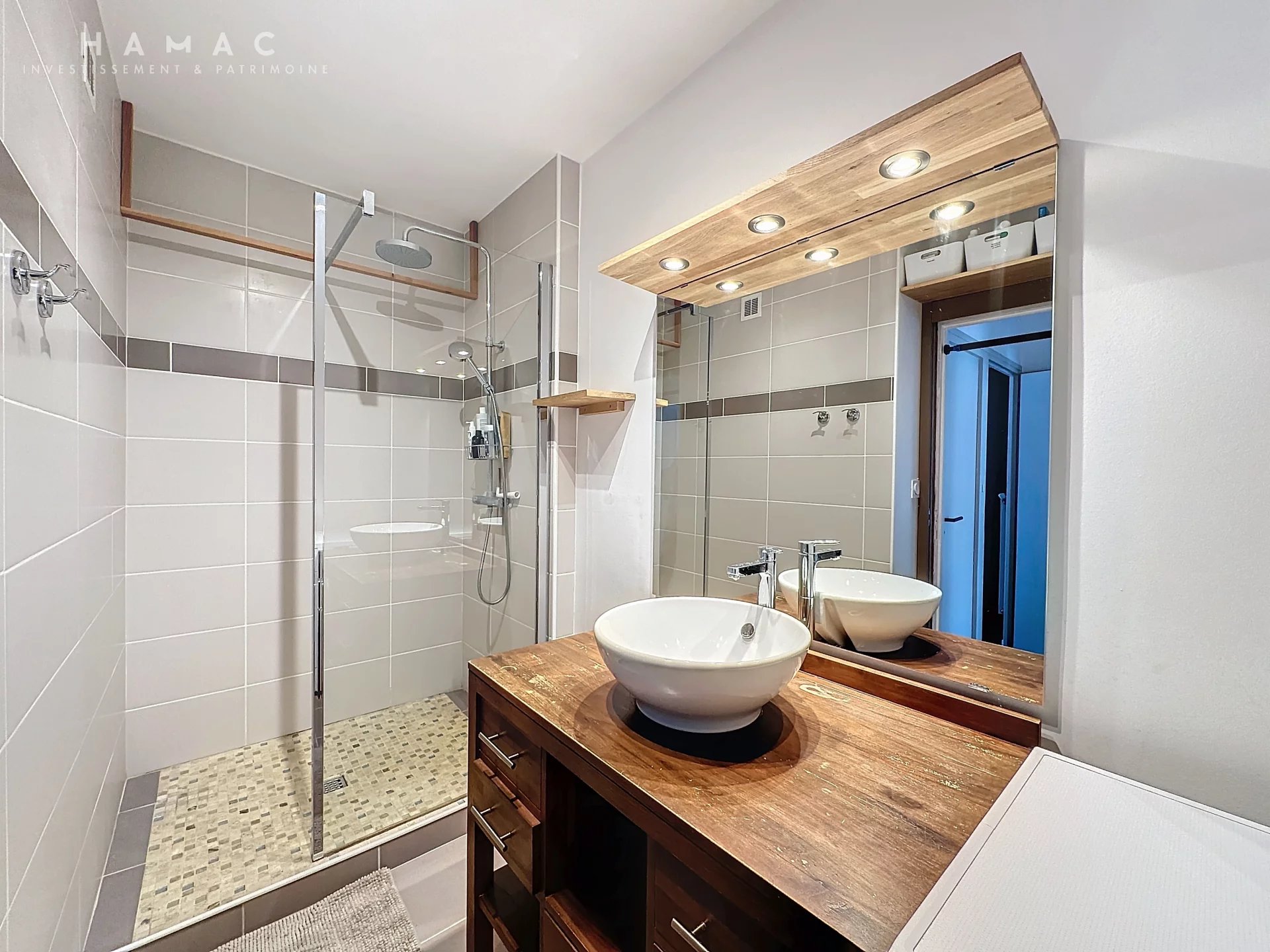 La salle de bains est en parfait état, offrant un lieu de détente et de rafraîchissement. Vous trouverez également un WC indépendant pour plus de confort.