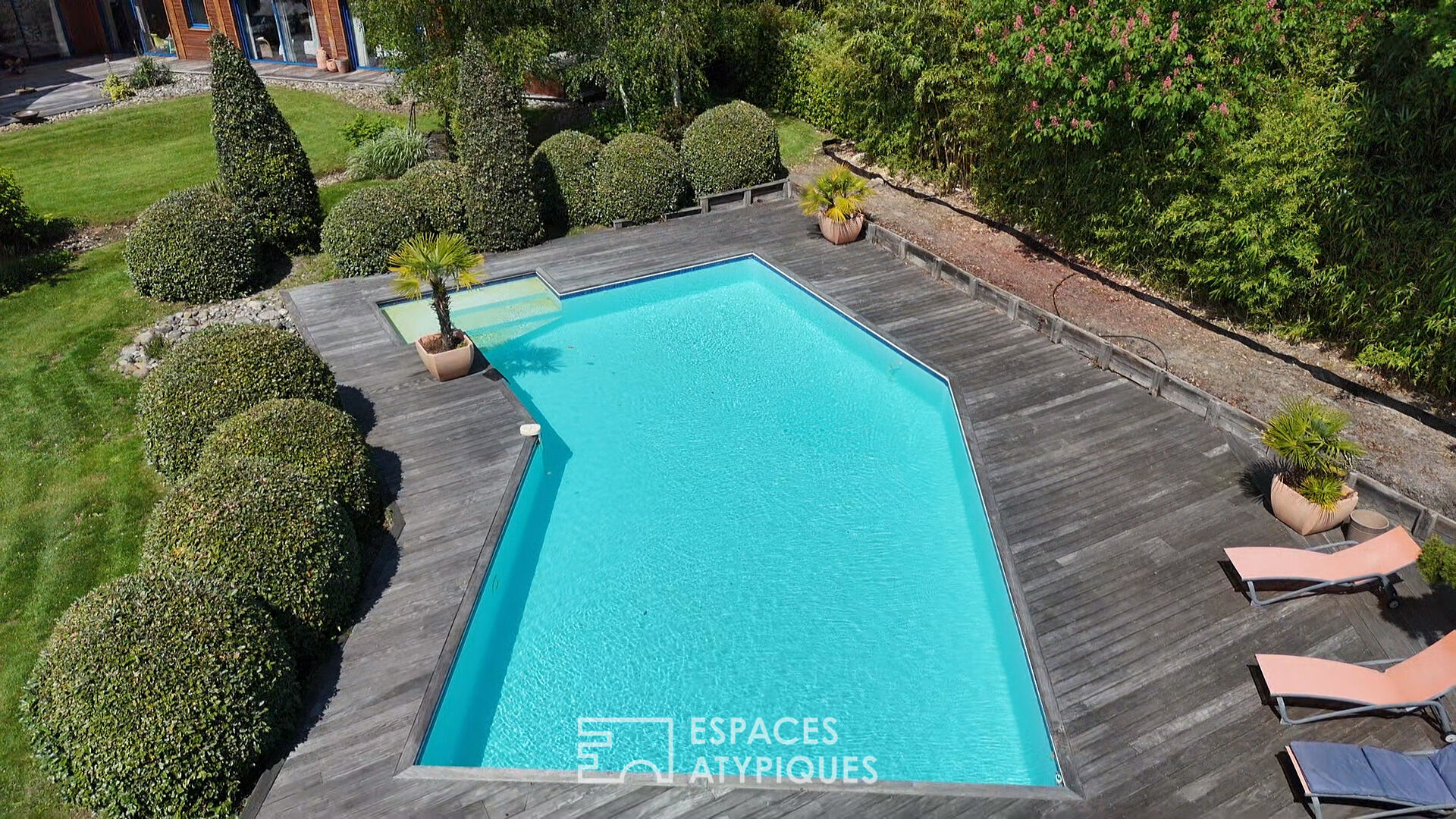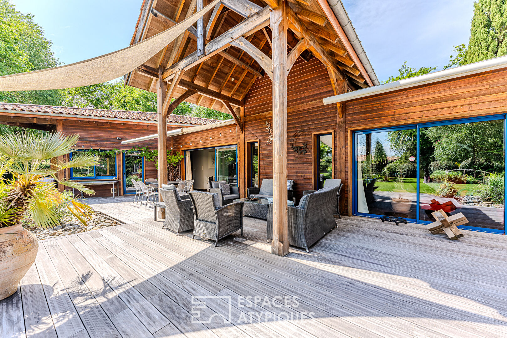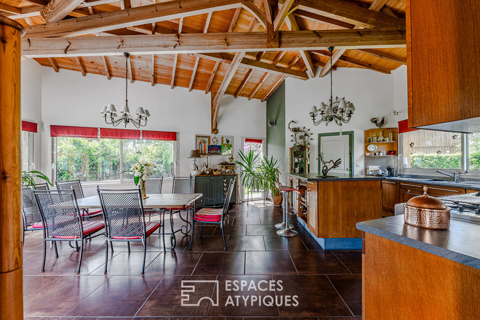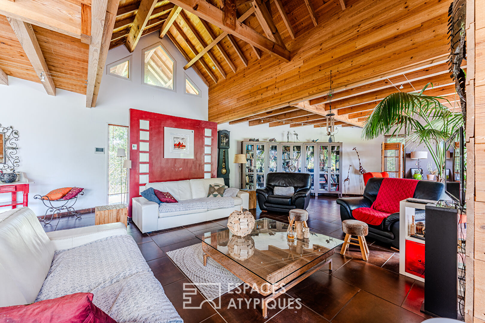 Nichée dans un écrin calme et verdoyant à Biscarrosse, cette maison d'architecte en ossature bois développe une surface habitable de 243 m² sur un terrain paysagé de 2 800 m². Entièrement pensée pour offrir un confort de vie exceptionnel, elle se distingue par ses volumes généreux, ses lignes contemporaines et sa grande piscine, dans un dialogue permanent entre intérieur et extérieur. Ce lieu de vie unique s'intègre harmonieusement dans son environnement naturel. Les espaces intérieurs s'organisent autour d'une vaste pièce de vie cathédrale baignée de lumière, grâce aux nombreuses ouvertures qui offrent une vue dégagée sur le jardin. La cuisine ouverte sur la salle-à-manger communique elle-aussi sur une terrasse extérieure, prolongeant naturellement les espaces de vie. La maison propose quatre chambres, dont une suite parentale, ainsi que deux salles d'eau. L'agencement fluide des volumes donne une atmosphère apaisante, propice à la détente et à la convivialité. Le parc, conçu par un paysagiste, compose un décor naturel d'une grande beauté : végétation locale, bassin romantique et essences variées, invitent à la sérénité. L'espace formé par la piscine et son pool-house évoque une oasis entourée de verdure. Maison à l'architecture affirmée, elle séduit par l'harmonie rare entre nature, design et confort. Ce bien immobilier atypique offre des prestations haut de gamme, idéales pour une résidence principale ou secondaire. L'environnement résidentiel est recherché pour sa tranquillité et sa proximité des plages, des commerces, des écoles et de toutes les commodités de Biscarrosse. CLASSE ÉNERGIE : C / CLASSE CLIMAT : A Montant moyen estimé des dépenses annuelles d'énergie pour un usage standard, établi à partir des prix de l'énergie de l'année 2021 : entre 2980 euros et 4080 euros. Contact : Arnaud Schwizguebel tél : 06.84.25.71.00 RSAC : 941 363 046 Mont-de-Marsan ARNAUD SCHWIZGUEBEL (EI) Agent Commercial - Numéro RSAC : 941363046 - Mont-de-Marsan.