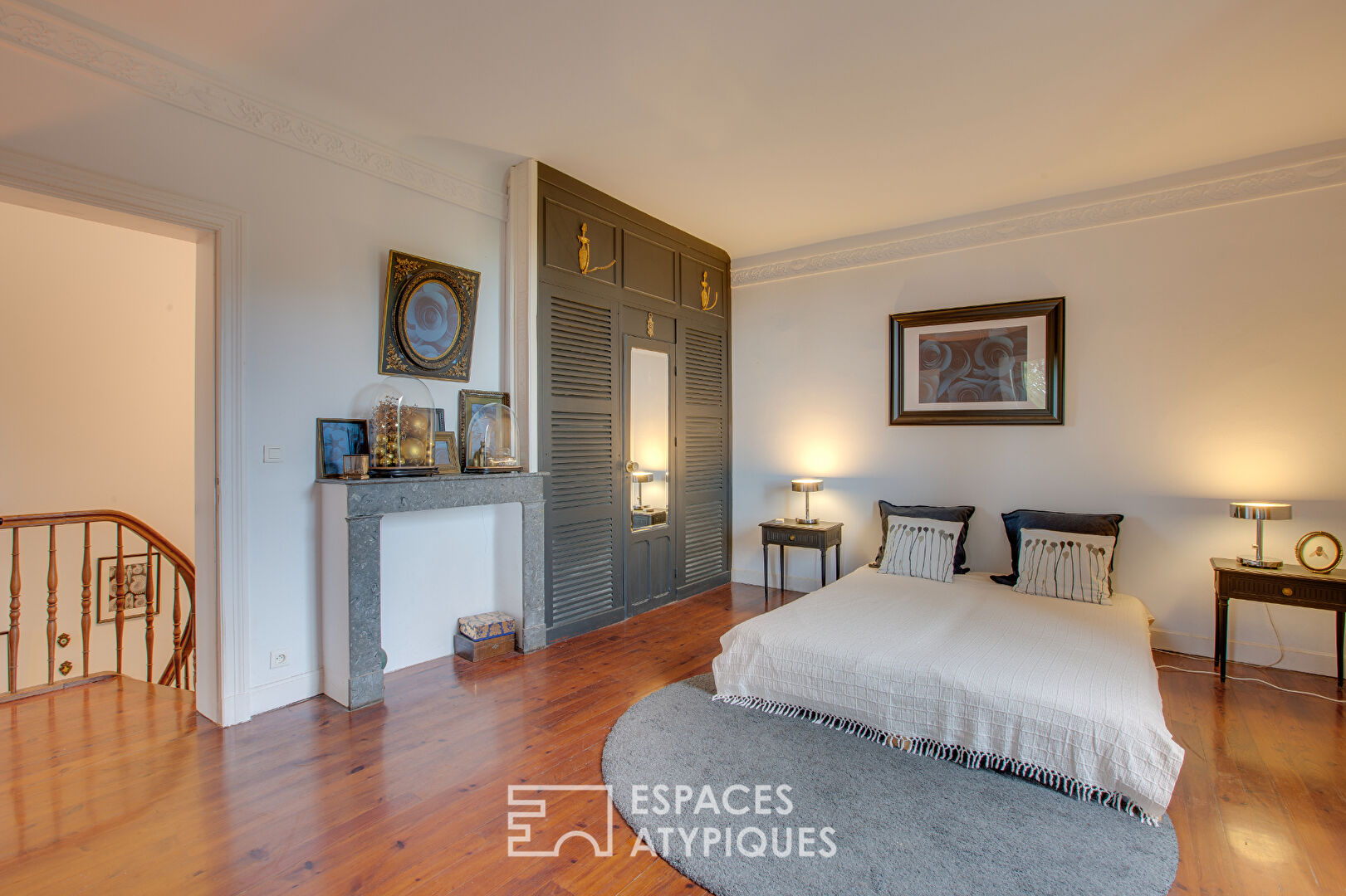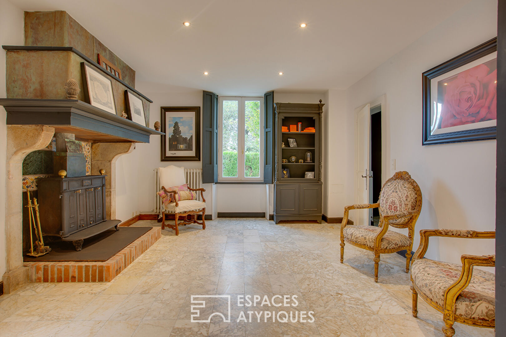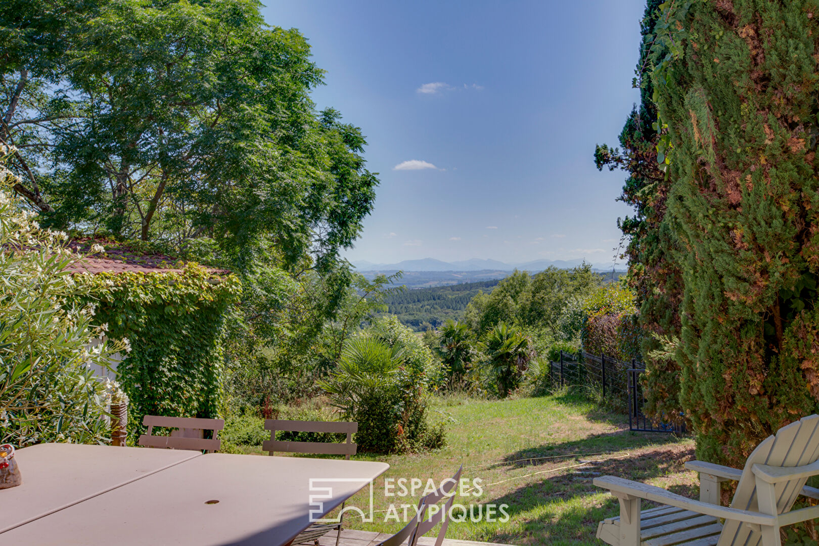 En position dominante avec vue panoramique sur les Pyrénées, cette élégante propriété de caractère développe environ 360 m² habitables sur un terrain paysager de plus de 4883 m². Elle se compose de deux bâtisses indépendantes, harmonieusement réparties autour d'un vaste jardin verdoyant avec piscine, terrasses et vues dégagées sur la nature environnante. Un lieu de vie unique qui conjugue charme de l'ancien et confort moderne au potentiel familial ou réceptif. La maison principale, maison de maître par excellence, construite sur deux niveaux, conserve de nobles éléments d'époque : cheminée monumentale, boiseries anciennes, volets intérieurs sculptés, pierres de taille apparentes. Les espaces intérieurs bénéficient d'une belle lumière traversante grâce à de nombreuses ouvertures sur le jardin. Le rez-de-chaussée s'articule autour d'un vaste salon avec cheminée et d'une salle à manger attenante à une cuisine semi-ouverte. A l'étage, plusieurs chambres aux volumes généreux, un bureau et des salles de bain composent un espace nuit chaleureux et fonctionnel. Une seconde bâtisse, plus contemporaine, accueille un logement indépendant idéal pour une activité d'hébergement ou pour recevoir famille et amis en toute autonomie. Côté extérieur, le jardin arboré et soigneusement entretenu dessine des espaces de détente et de convivialité : pelouse généreuse, arbres d'ornement, haies végétales préservant l'intimité, sans oublier la piscine... Sa vue panoramique sur les collines et les Pyrénées en toile de fond parachève ce cadre apaisant. La propriété se situe dans un village recherché avec écoles, commerces de proximité à 5 minutes en voiture et d'un accès rapide aux axes principaux vers Pau et Biarritz. Un bien rare à l'authenticité préservée, qui séduira par la noblesse de ses matériaux, son organisation évolutive et son environnement naturel d'exception. CLASSE ÉNERGIE : D / CLASSE CLIMAT : D Montant moyen estimé des dépenses annuelles d'énergie pour un usage standard, établi à partir des prix de l'énergie de l'année 2021 : entre 4190 euros et 5668 euros. Contact : Nathalie LAURENT au 06 67 61 35 96