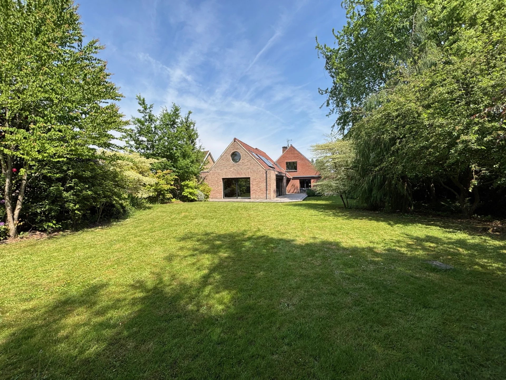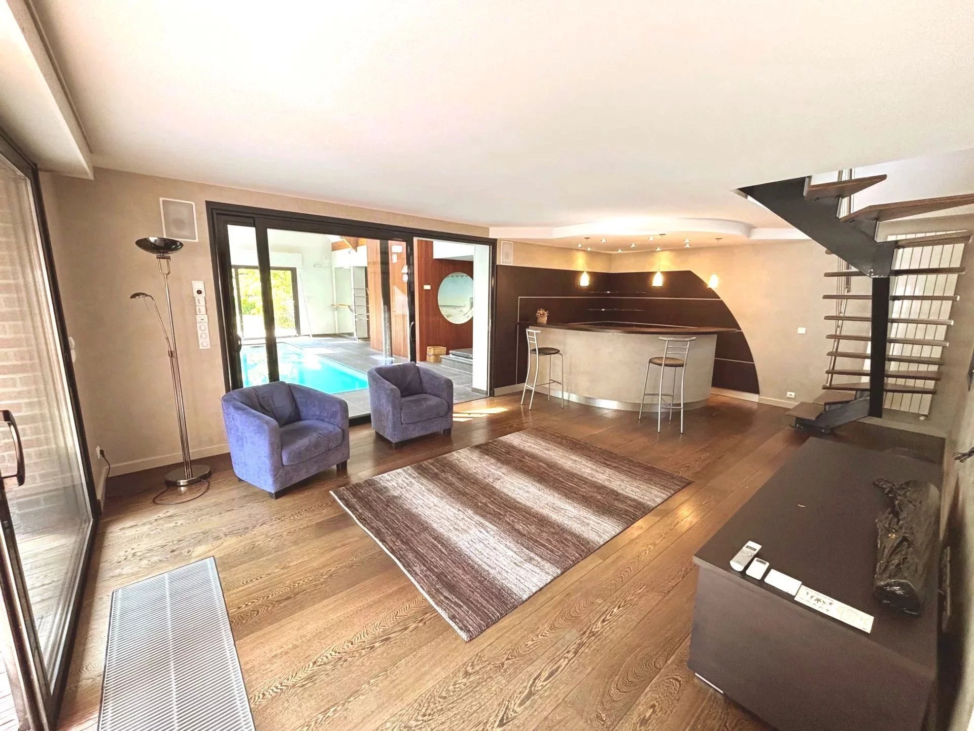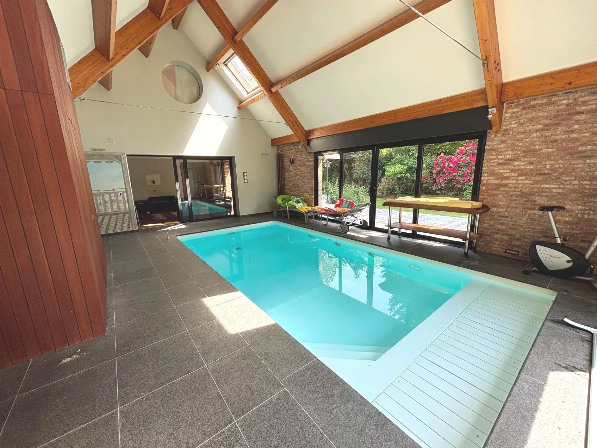 Toute votre attention pour cette magnifique demeure bâtie sur 1500 m² et située entre Roncq et Halluin. Vous serez séduits par ses volumes, sa luminosité et son jardin planté. Plus qu'une habitation, cette maison, disposant d'un accès handicapé, pourrait facilement accueillir des professionnels de santé et du bien être. Au rez-de-chaussée, une entrée dessert un séjour double comprenant une partie salle à manger avec bibliothèque et une partie salon avec coin bar, le tout sur plus de 70 m², une grande cuisine équipée de marque Barbry et un espace nuit composé d'une chambre et d'une salle de douche. Attenant au salon, sous un toit cathédrale, on retrouve un espace détente de plus de 90 m² bâti en 2005 avec piscine chauffée (8x3,5 mètres), spa, vestiaire et douche. L'ensemble est équipé de grandes baies vitrées donnant sur la terrasse et le jardin. A l'étage, un palier dessert 3 chambres dont un espace parental avec dressing et une salle de bain. Une cinquième chambre, accessible par le salon dispose d'un point d'eau. La maison dispose d'un sous-sol d'environ 100m² avec deux garages, une cave à vin, une chaufferie et un local technique pour la piscine. La maison est protégée par un portail automatique ouvrant sur 4 places de stationnement et un car port 2 voitures. A l'arrière de la parcelle, une terrasse de plus de 100 m² et un magnifique jardin arboré offrent un cadre de vie rare sur le secteur. L'état technique du bien est très bon, la maison est équipée de deux pompes à chaleur pour le chauffage et la piscine. Des panneaux photovoltaïques ont été posés sur l'extension. Toutes les menuiseries sont en double vitrage avec volets roulants électriques. Il ne vous reste qu'à apporter votre touche personnelle à la décoration afin d'apprécier et profiter de cette prestation unique. A voir sans tarder!