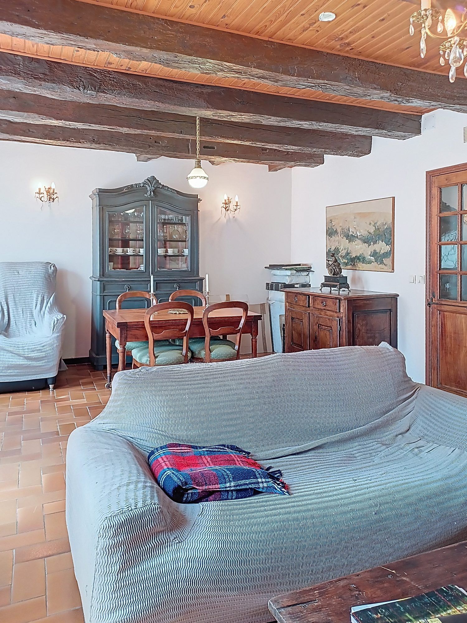 Cette maison, bien que nécessitant quelques rafraîchissements, possède un immense potentiel. Les murs épais et les poutres apparentes ajoutent une touche rustique et chaleureuse à l'intérieur.