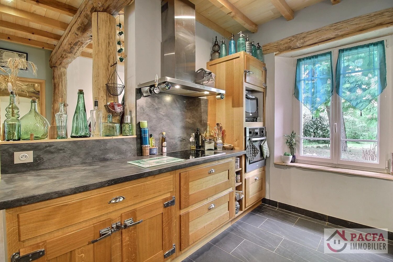 Au rez-de-chaussée, l'ancienne étable aménagée dessert une accueillante entrée ouverte sur très beau séjour d'environ 118 m² comprenant les espaces salle à manger et salon ainsi qu'une belle cuisine sur mesure en bois de menuisier et en pierre de taille.
