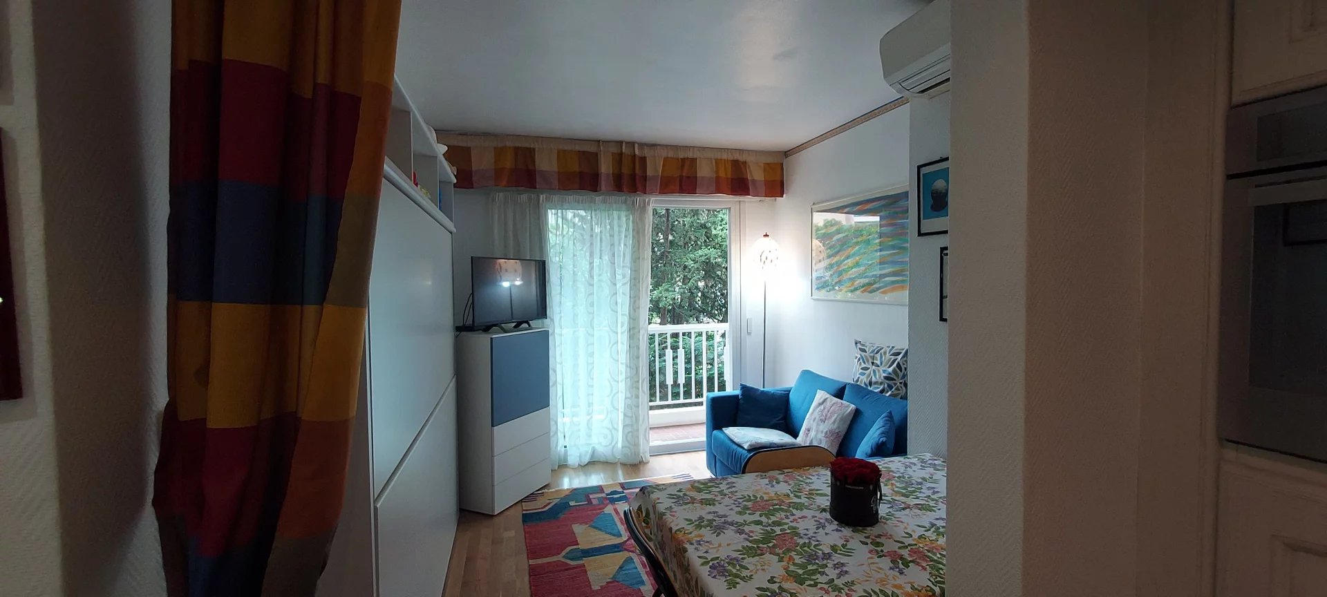 En exclusivité coquet 2 pièces situé au calme dans une belle copropriété, composé d'un séjour avec coin cuisine équipée, une chambre, salle de douche avec wc, balcon.Climatisation, excellent état, commodités à proximité. Charges 50€ par mois.